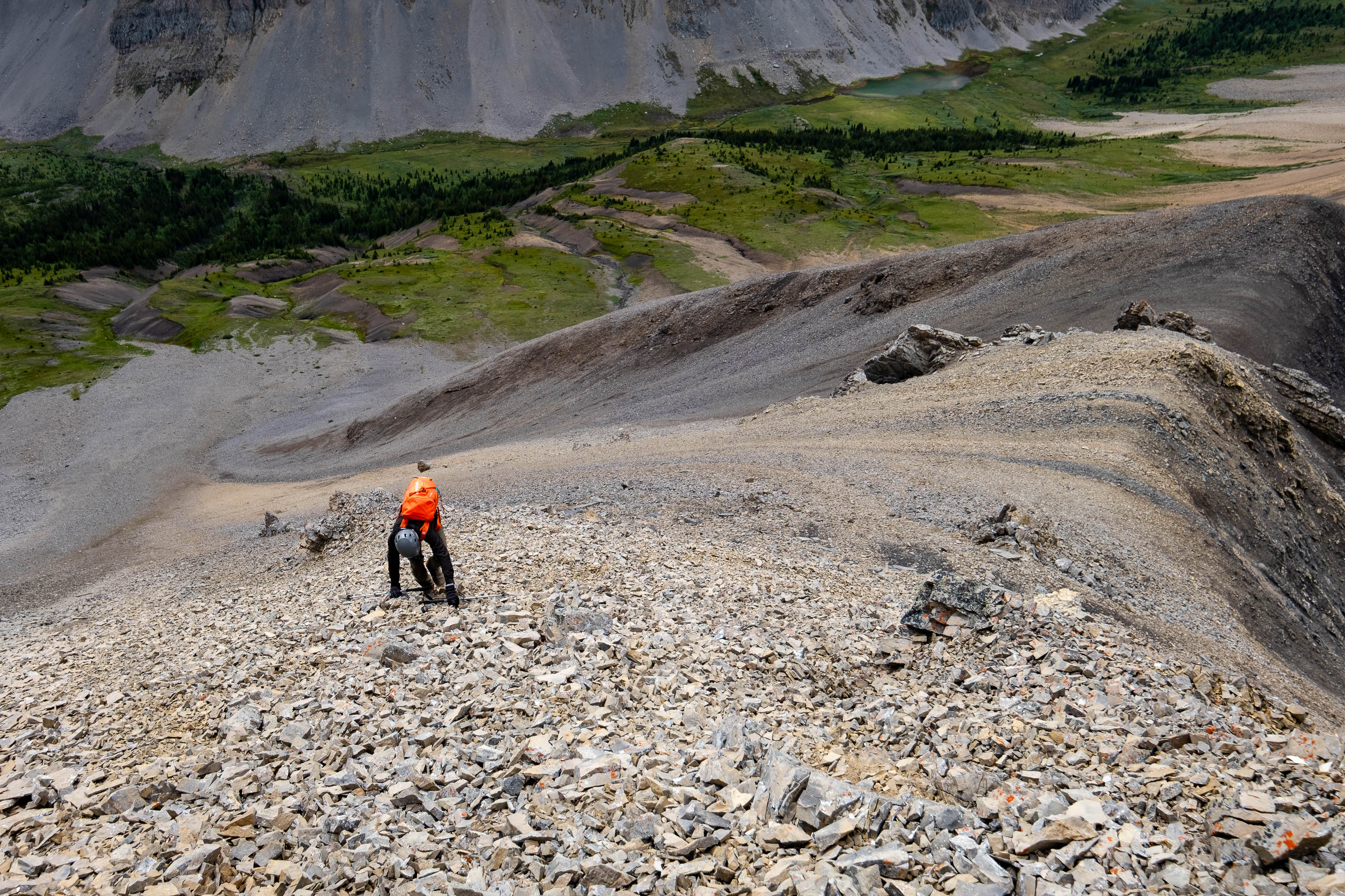 The loose rock on the ascent ridge isn't exactly the kind that you get excited about going down, but it was still way more efficient than our fight against it on the way up, and we had soon returned to the low point between summits four and five.