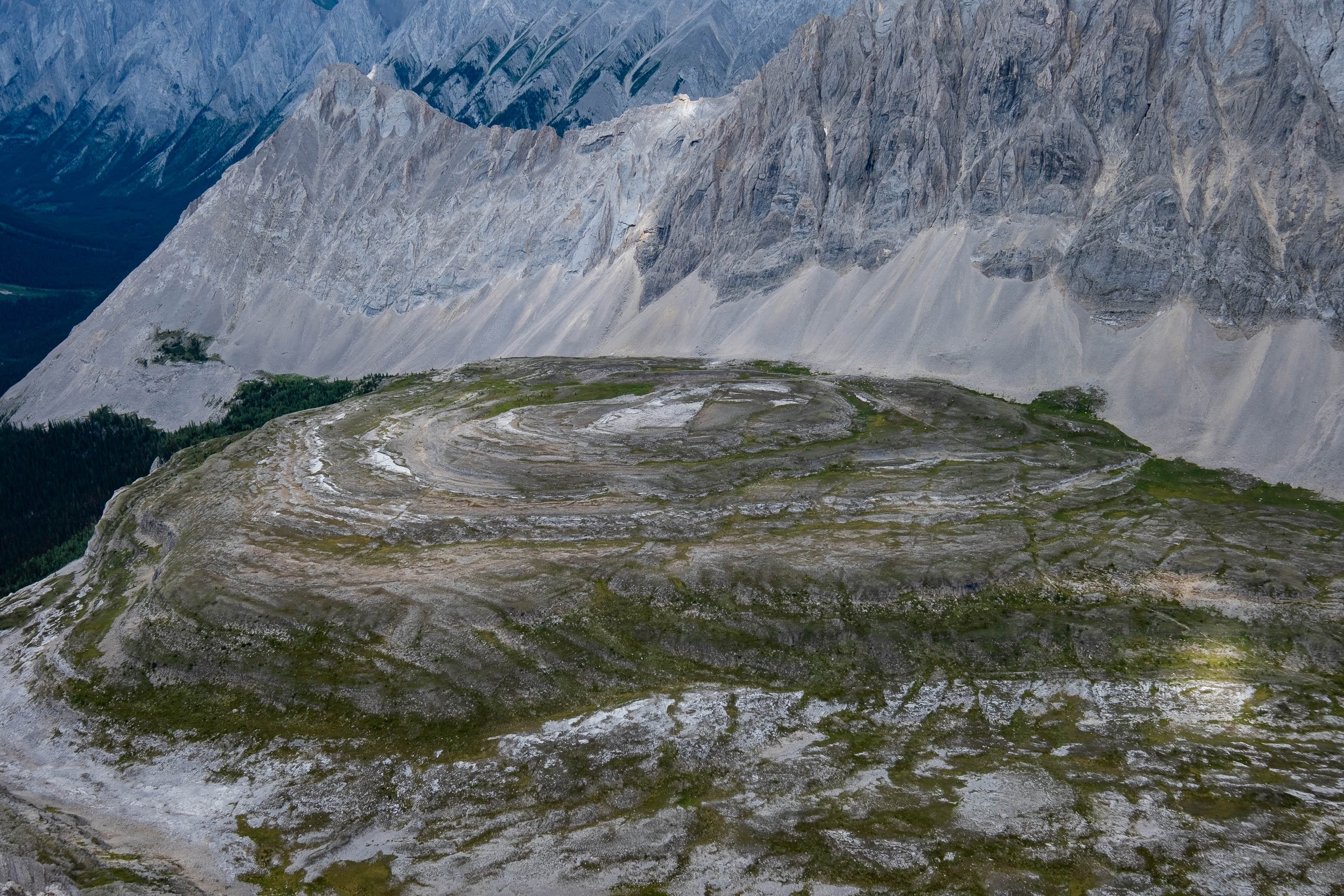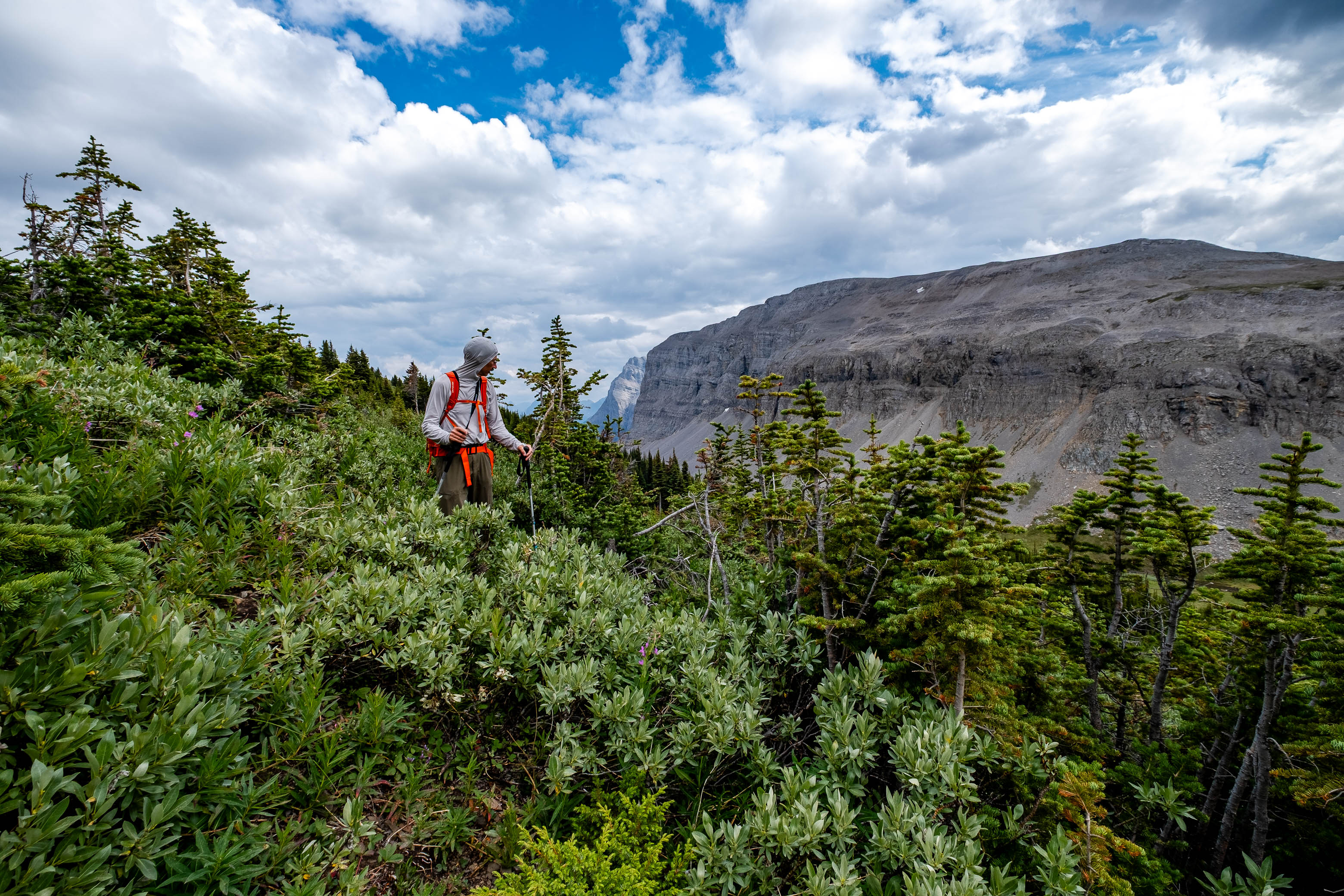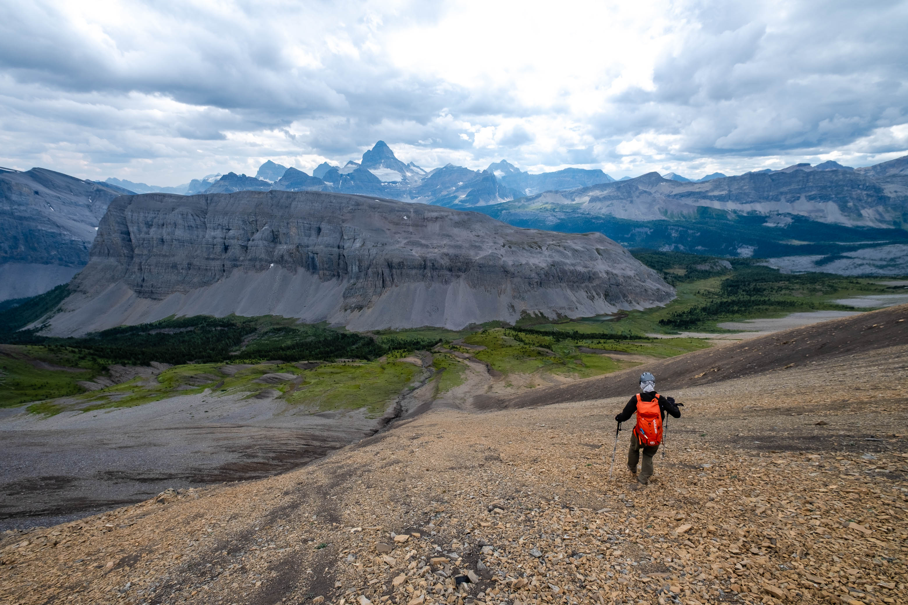 Rather than reascend the fourth summit and reverse our entire ascent route, we descended directly down to Og Pass on the kind of rock that you do get excited about going down! A superb scree run on soft brown rock starts down the south slopes, and we had a blast flying down 200 m in just a few minutes, hitting vegetated slopes all too soon, and easily following them to the valley below. We noticed that our route got pretty bushy near the valley bottom and were able to avoid the bulk of the bushwhacking by angling right (skier's) and intersecting a narrow creekbed that broke through the thick, low-lying bush. (Note that this alternate descent is only possible "early season" due to a seasonal trail closure at Og Pass from the beginning of August to the end of September.)