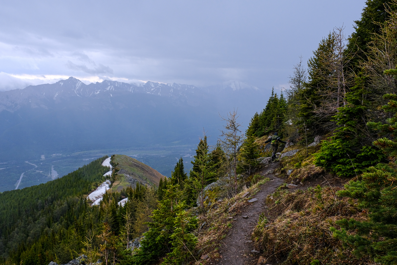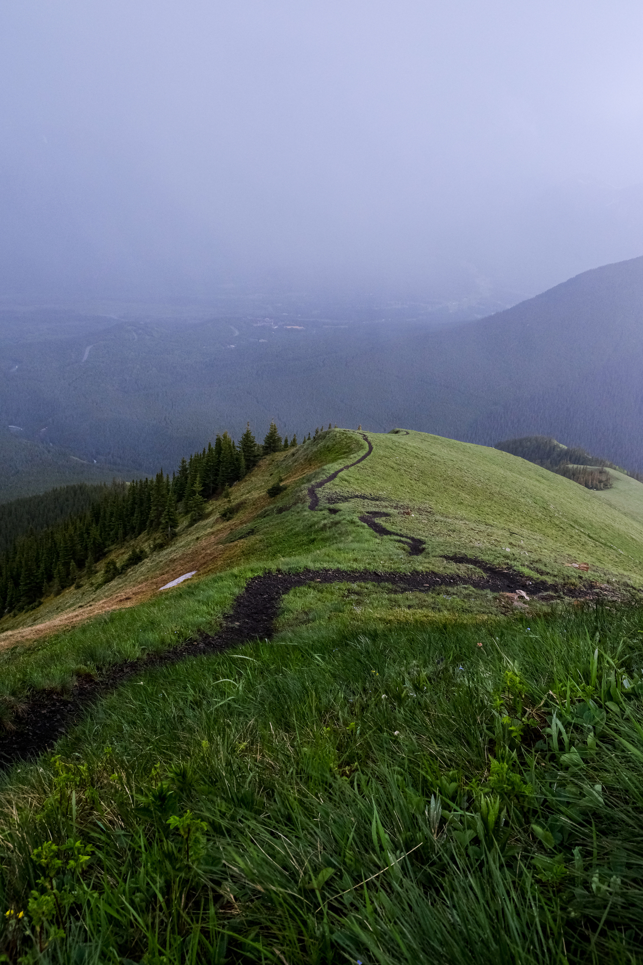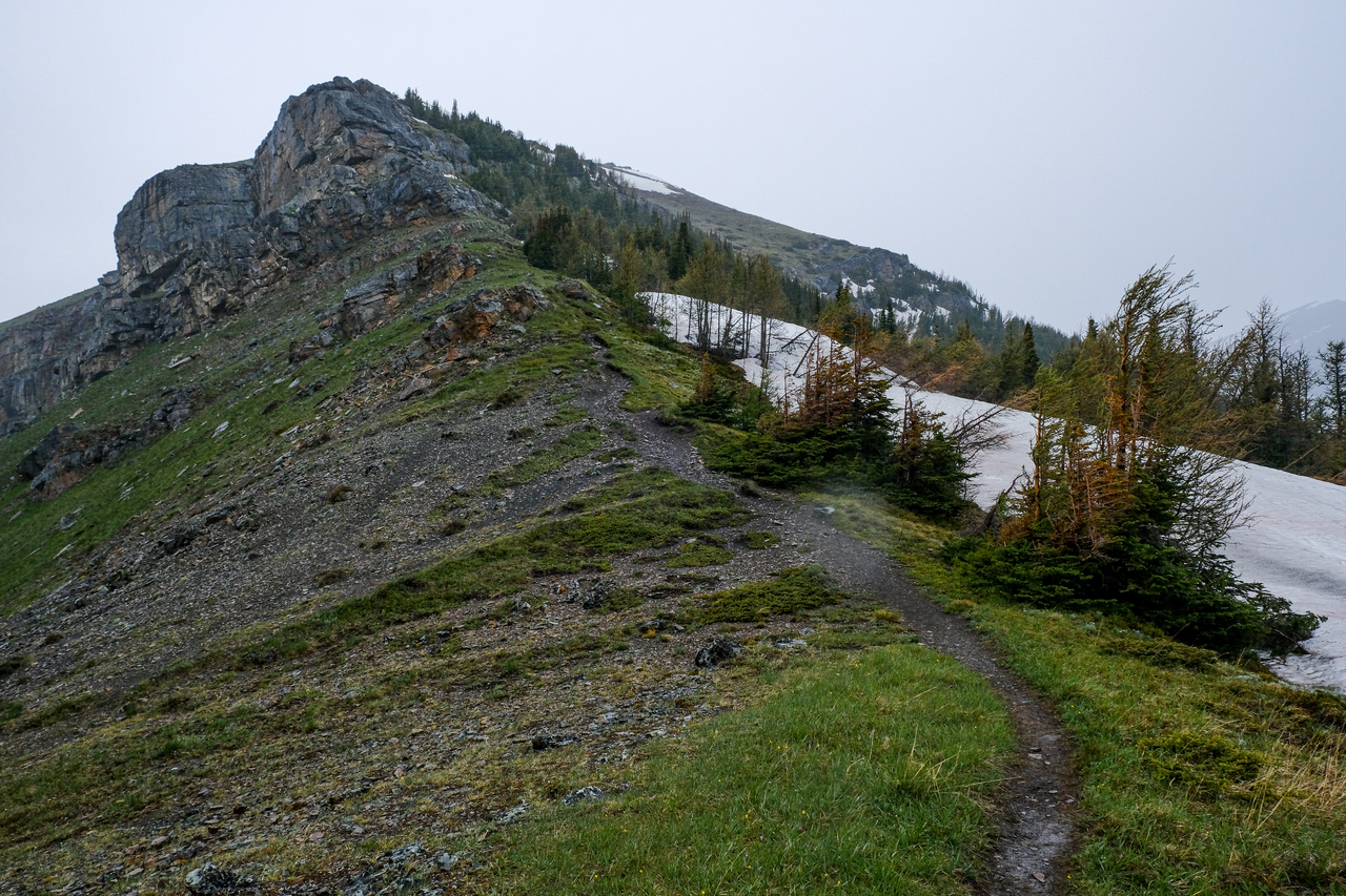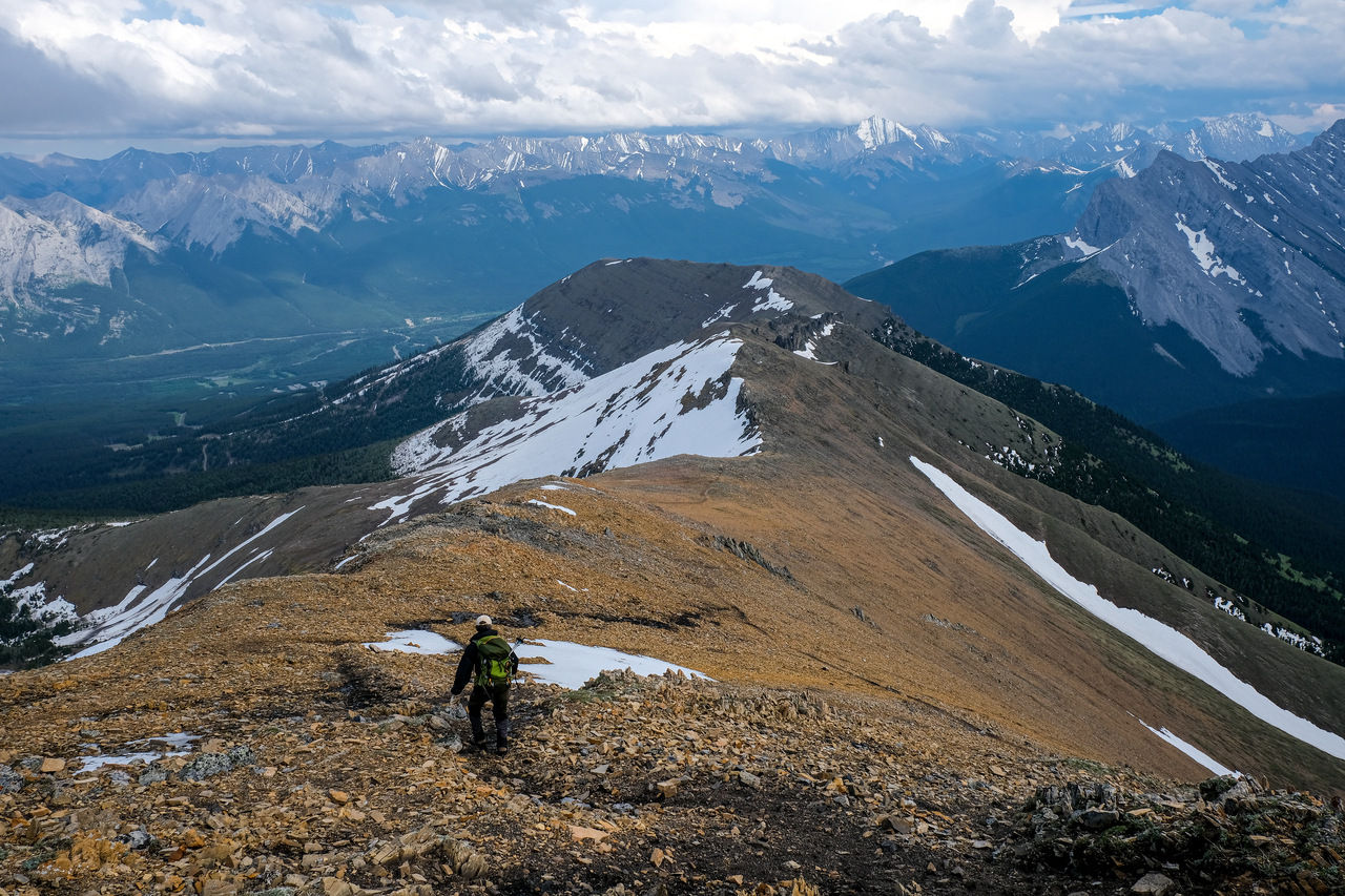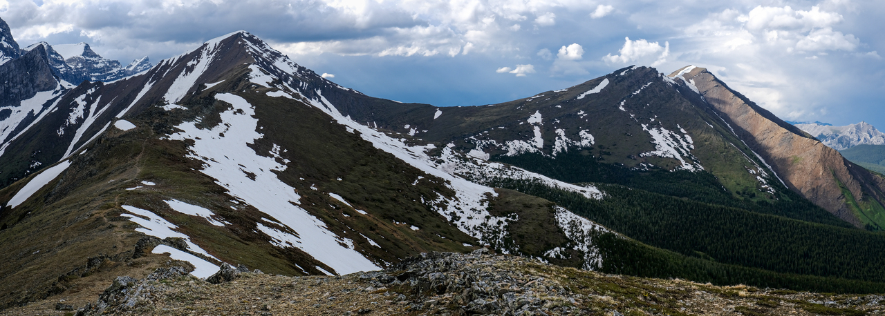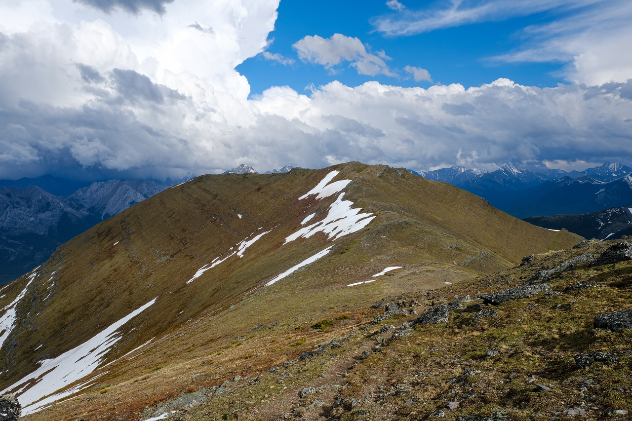 After reaching the apex of our traverse, all that was left was descending the ridge to the southeast, towards Kananaskis Village. A small bump sits near the south end of the ridge (to put size into perspective, the gain to reach it from Allan is only about 50m 😂), and although it barely deserves the title of a summit, "Summit" is right in the name! I don't know about you, but that's reason enough for me to add it to the count ;)! After already being hit by two rain storms, we thought that the worst was behind us, and started down the ridge in high spirits, ready to bag our third summit of the day...