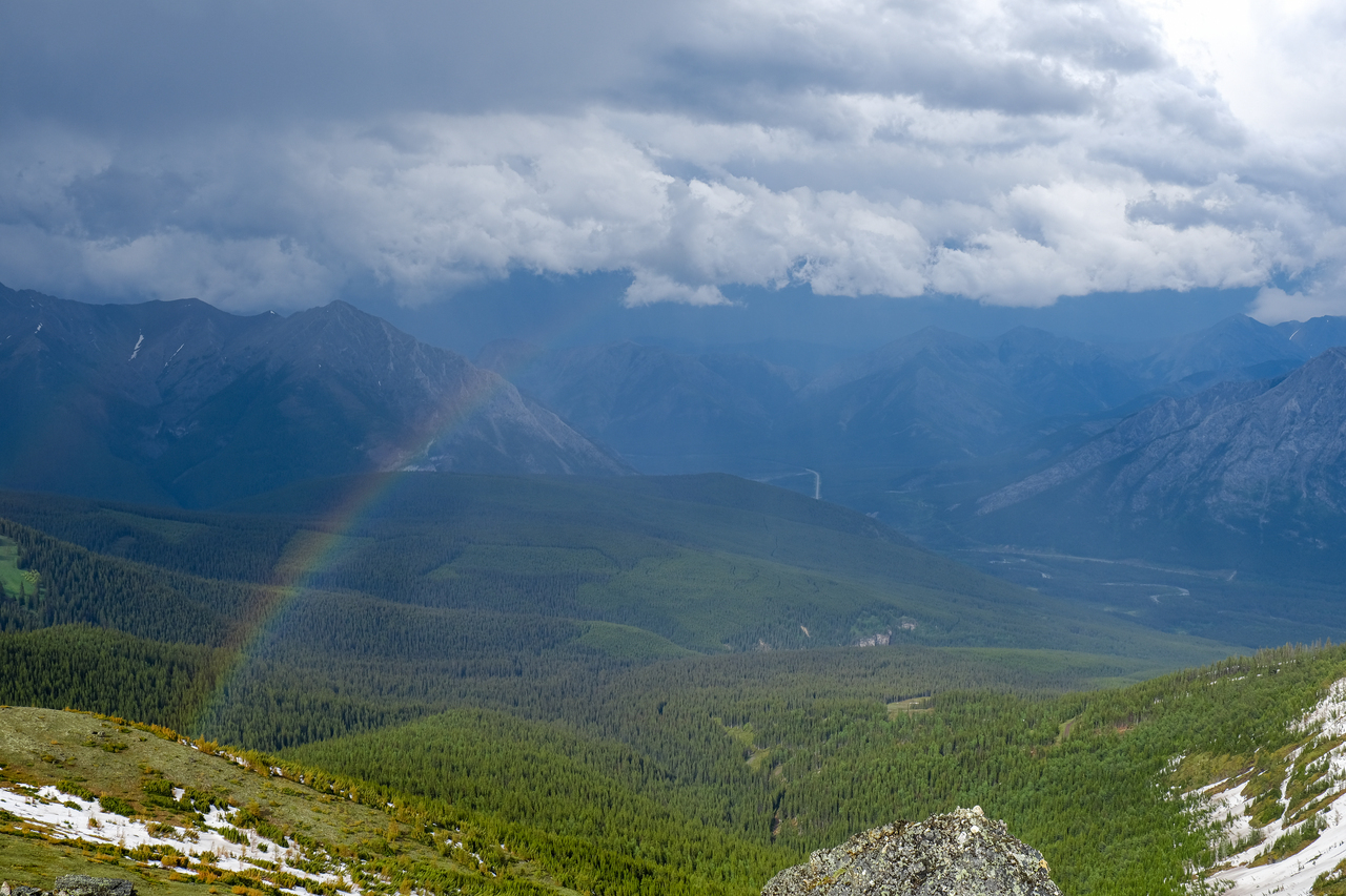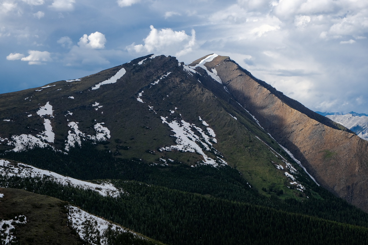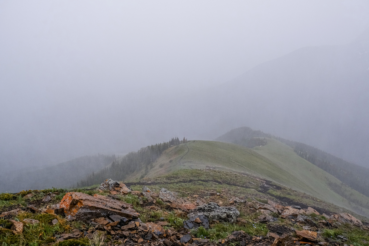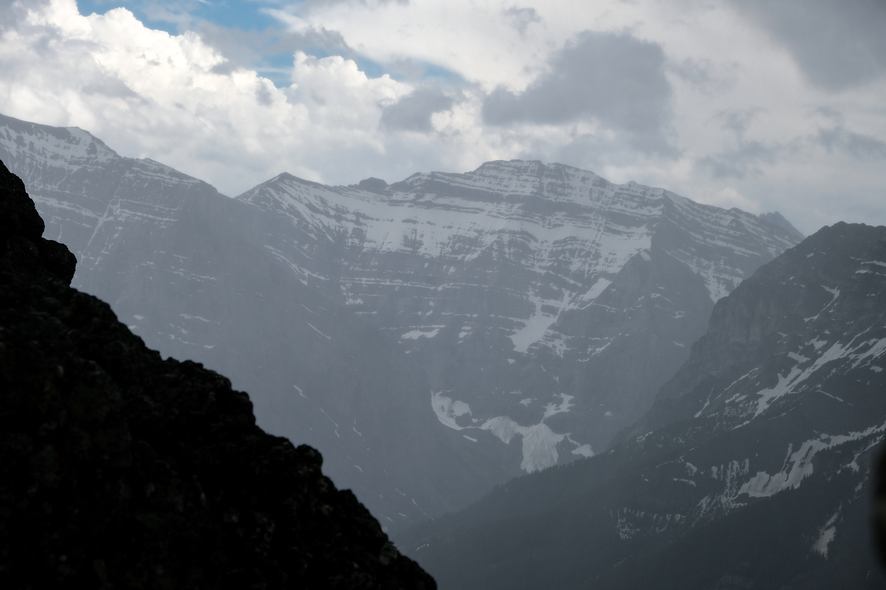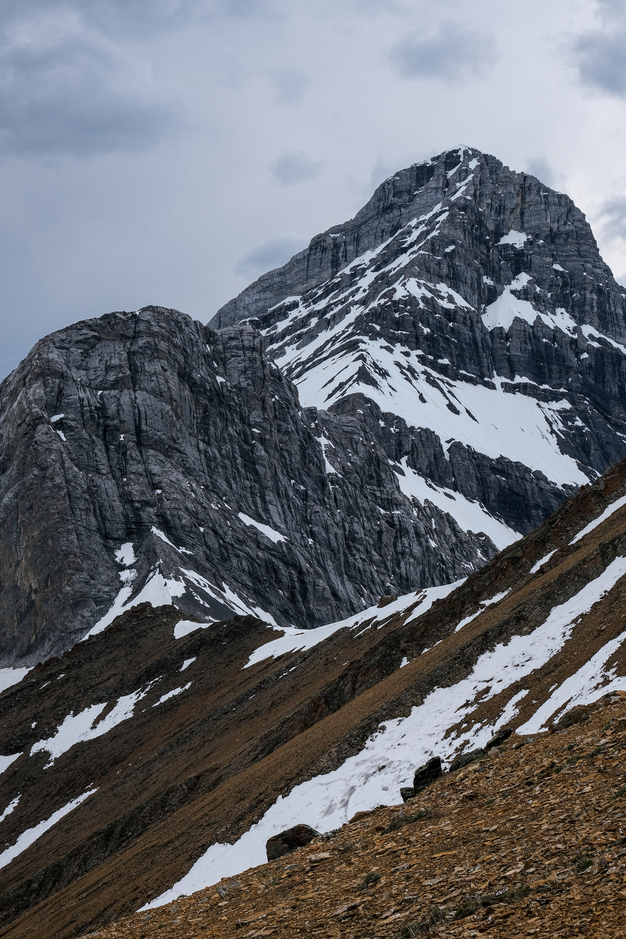 After reaching the apex of our traverse, all that was left was descending the ridge to the southeast, towards Kananaskis Village. A small bump sits near the south end of the ridge (to put size into perspective, the gain to reach it from Allan is only about 50m 😂), and although it barely deserves the title of a summit, "Summit" is right in the name! I don't know about you, but that's reason enough for me to add it to the count ;)! After already being hit by two rain storms, we thought that the worst was behind us, and started down the ridge in high spirits, ready to bag our third summit of the day...