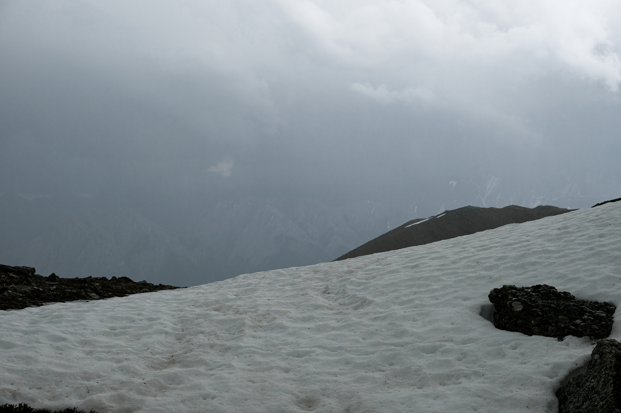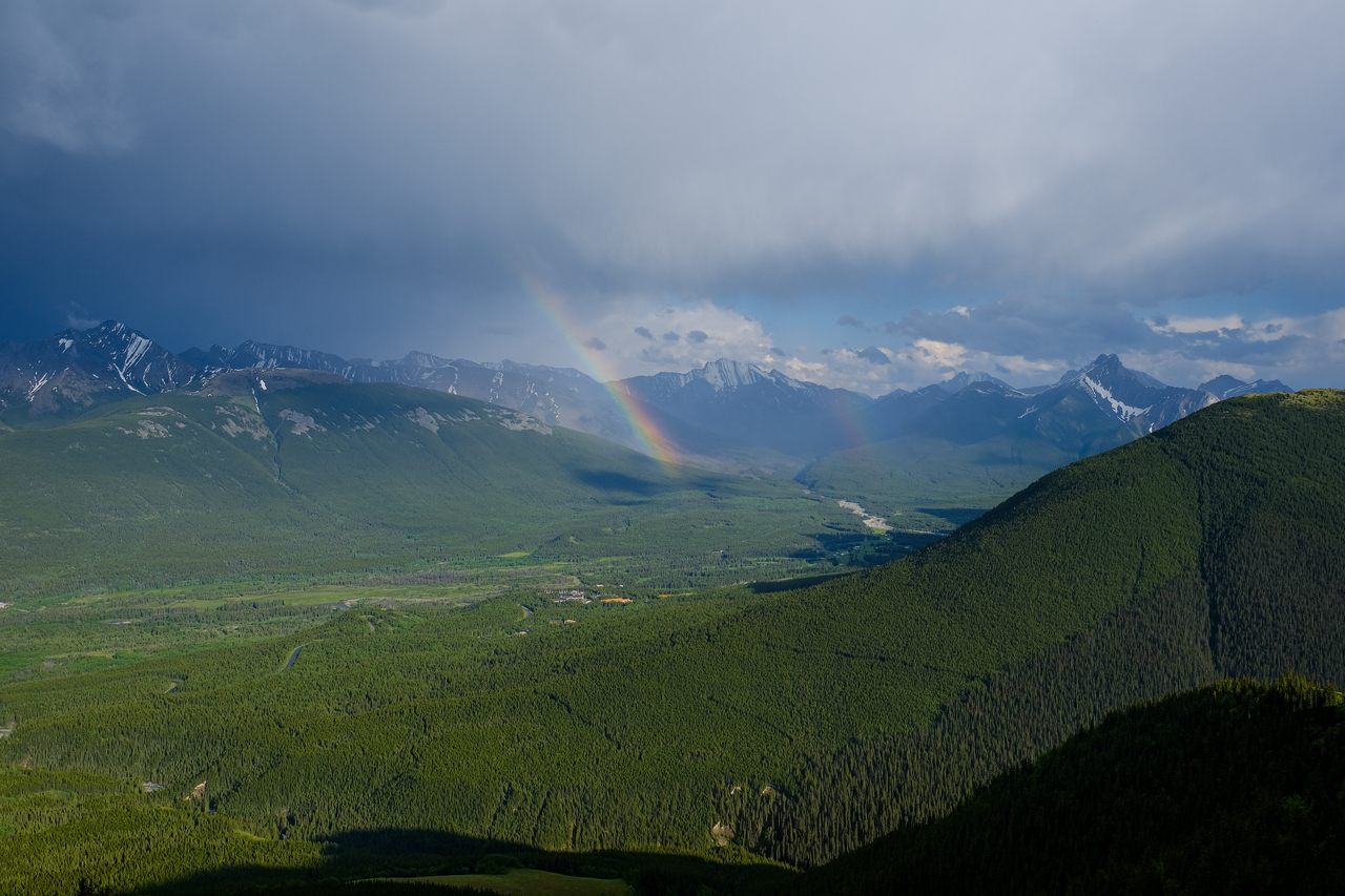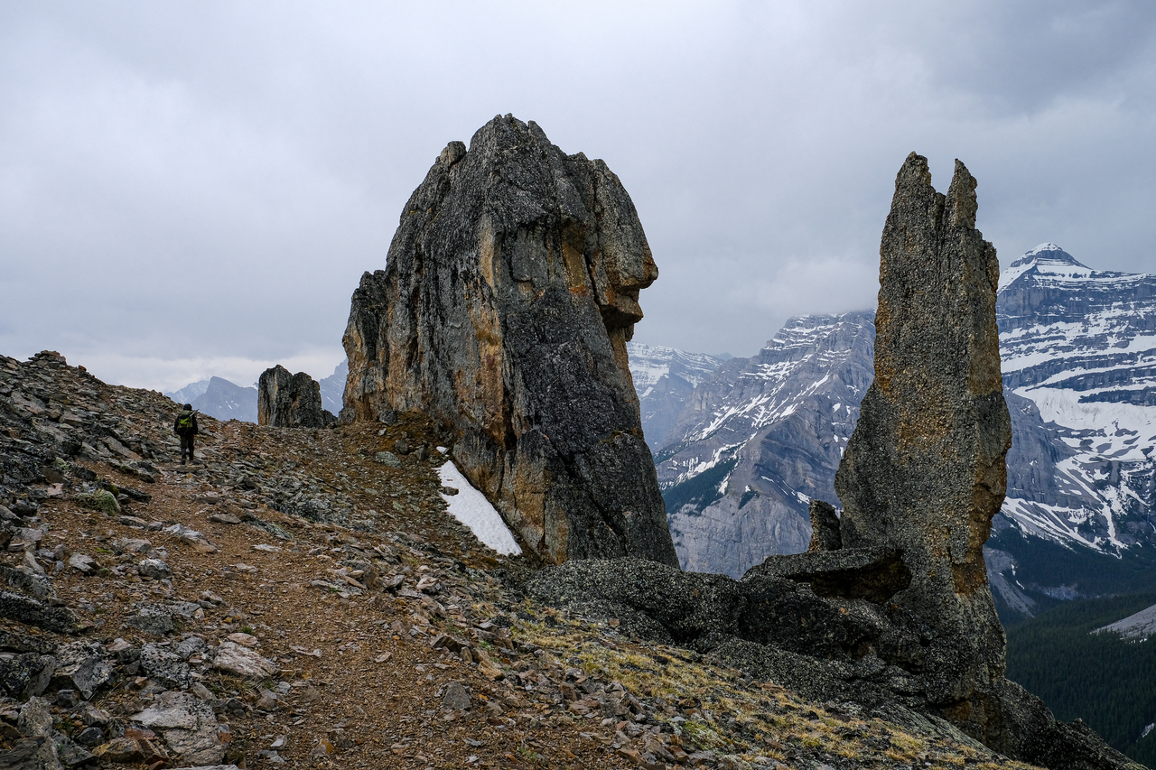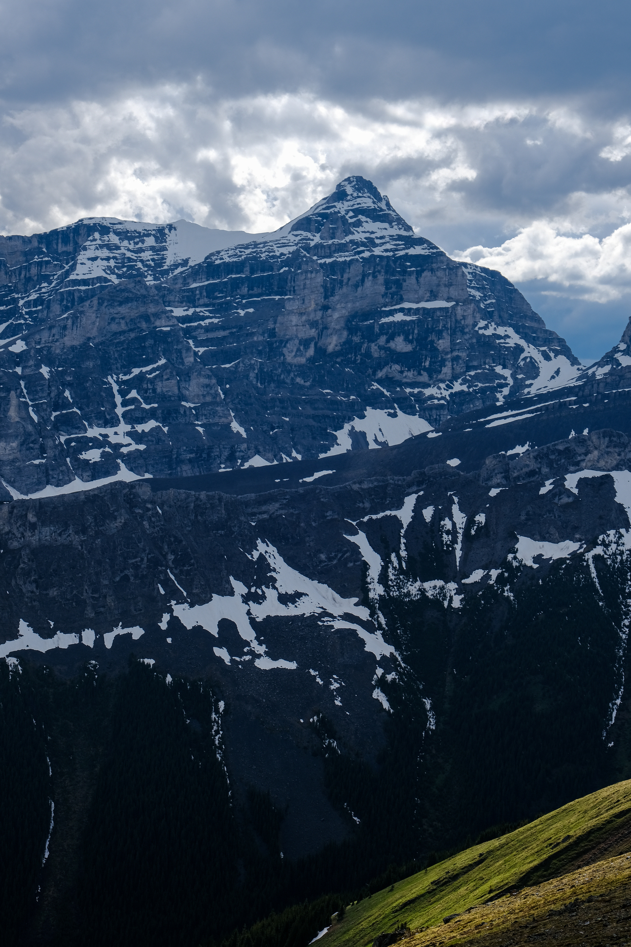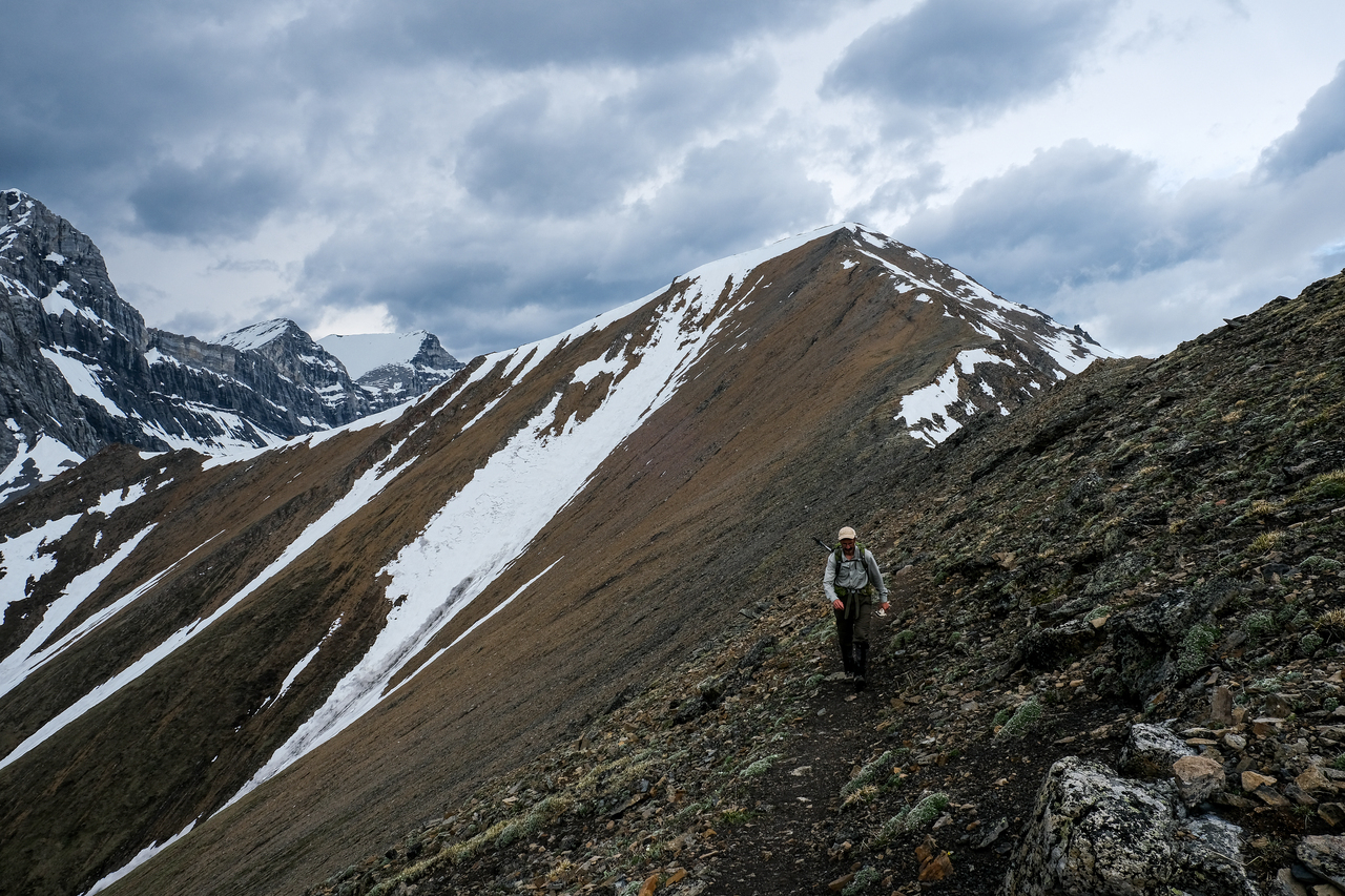 After reaching the apex of our traverse, all that was left was descending the ridge to the southeast, towards Kananaskis Village. A small bump sits near the south end of the ridge (to put size into perspective, the gain to reach it from Allan is only about 50m 😂), and although it barely deserves the title of a summit, "Summit" is right in the name! I don't know about you, but that's reason enough for me to add it to the count ;)! After already being hit by two rain storms, we thought that the worst was behind us, and started down the ridge in high spirits, ready to bag our third summit of the day...