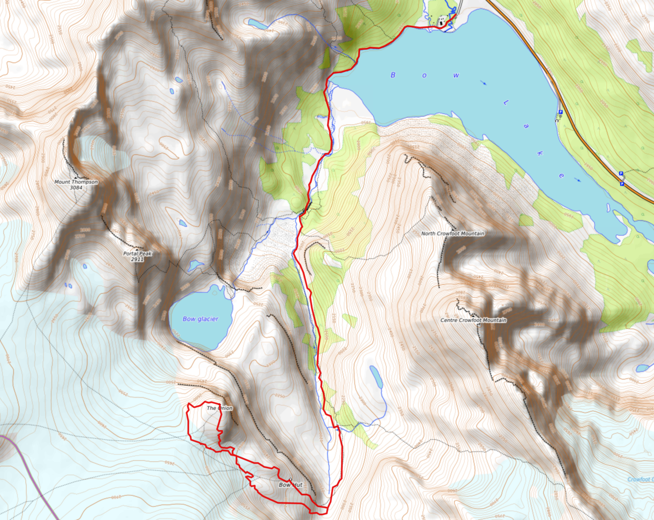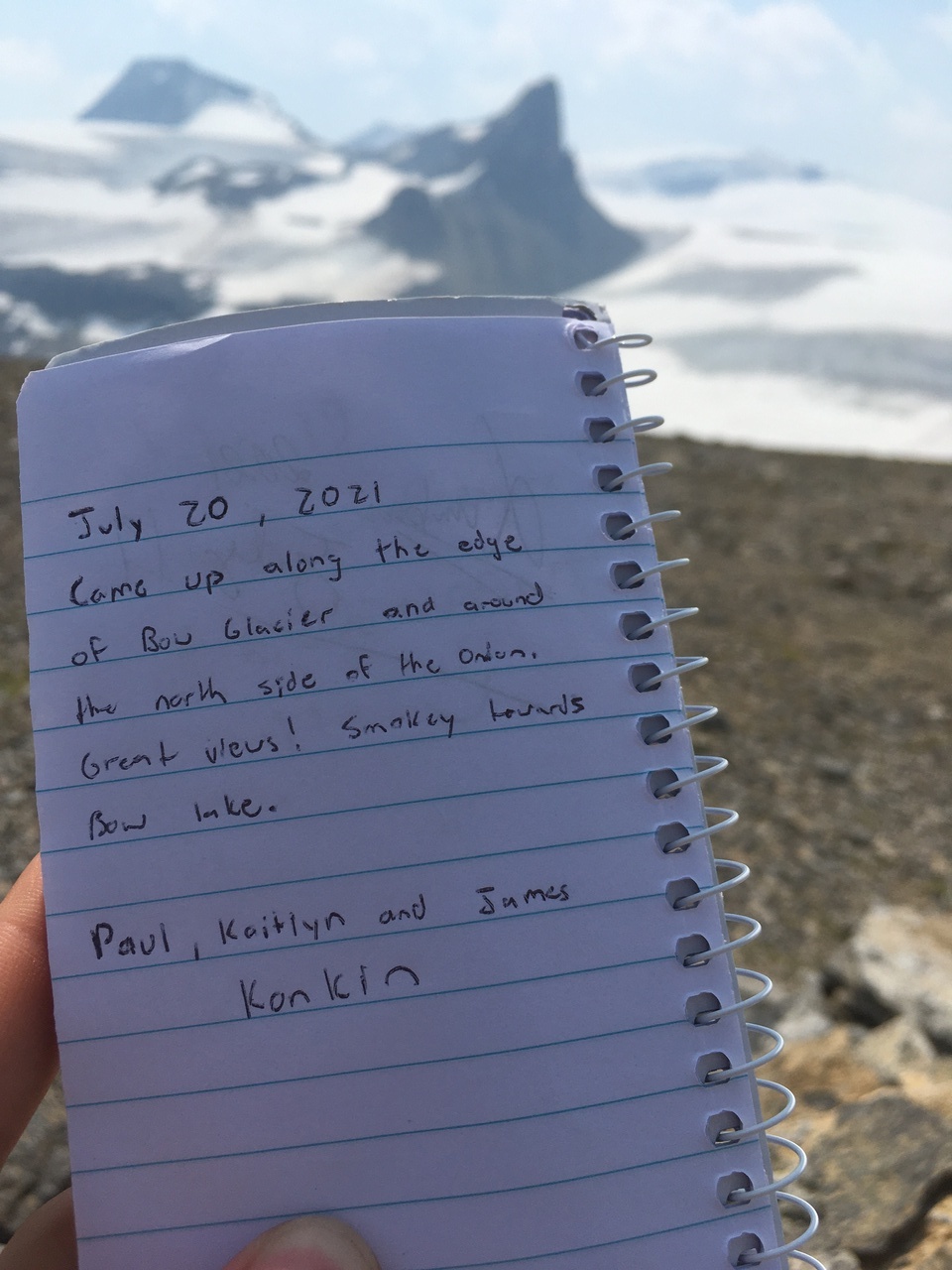 The Onion is the small, rounded bump to the left of Iceberg Lake and Bow Glacier Falls when seen from Bow Lake. It may be a small peak and an easy scramble, but the views along the way are absolutely spectacular! The Onion sits right on the edge of the Wapta Icefield, and an optional (longer) route allows you to circle around the backside, right along the edge of the icefield, before ascending to the summit! There aren't many scrambles where you can safely walk right next to an icefield, which is what makes The Onion extremely unique and special!