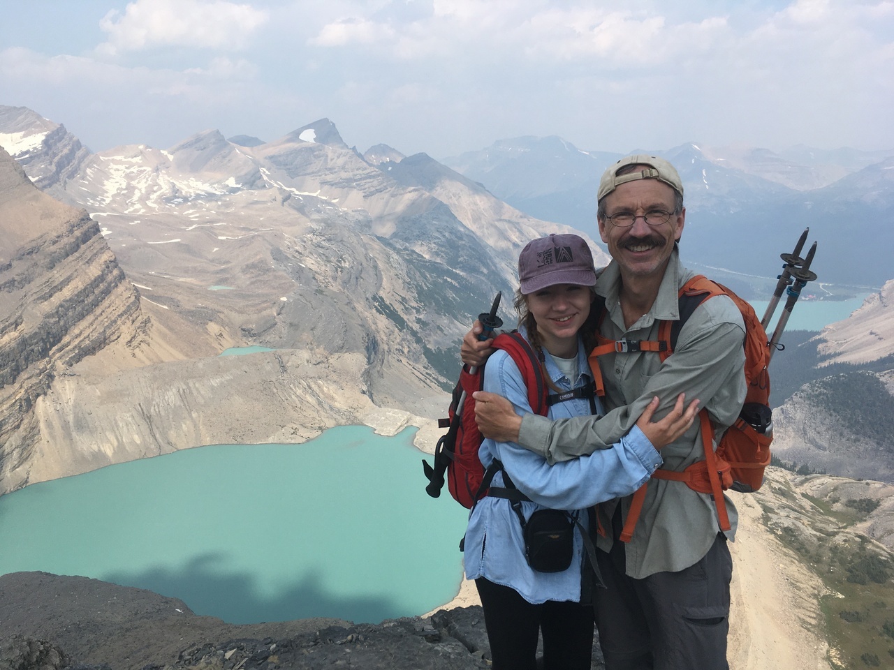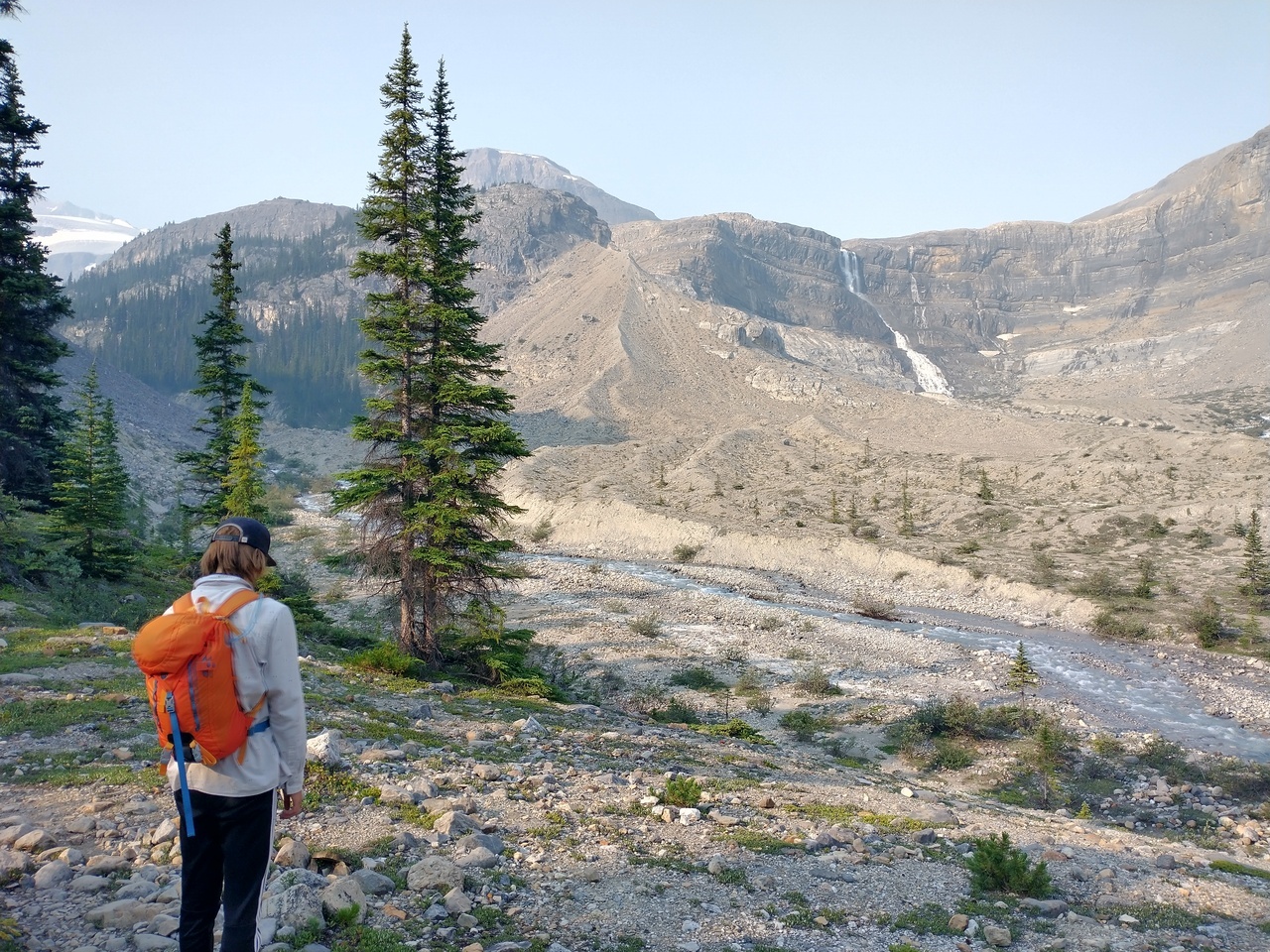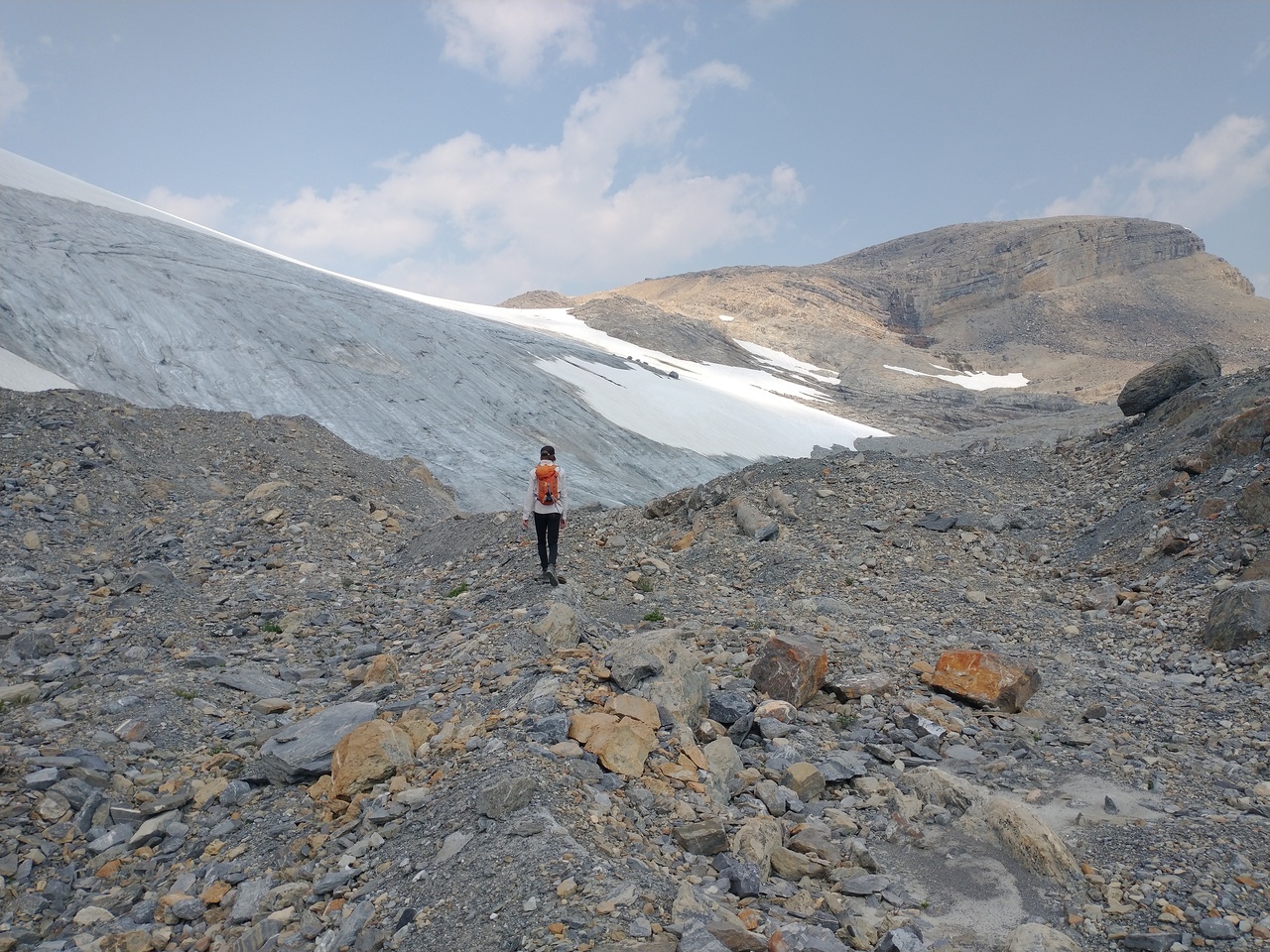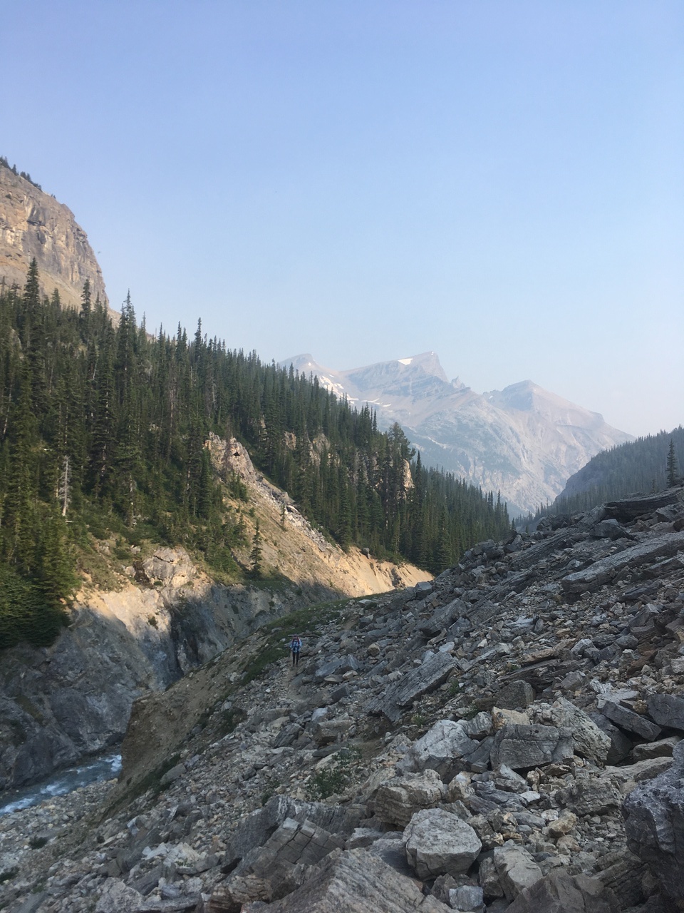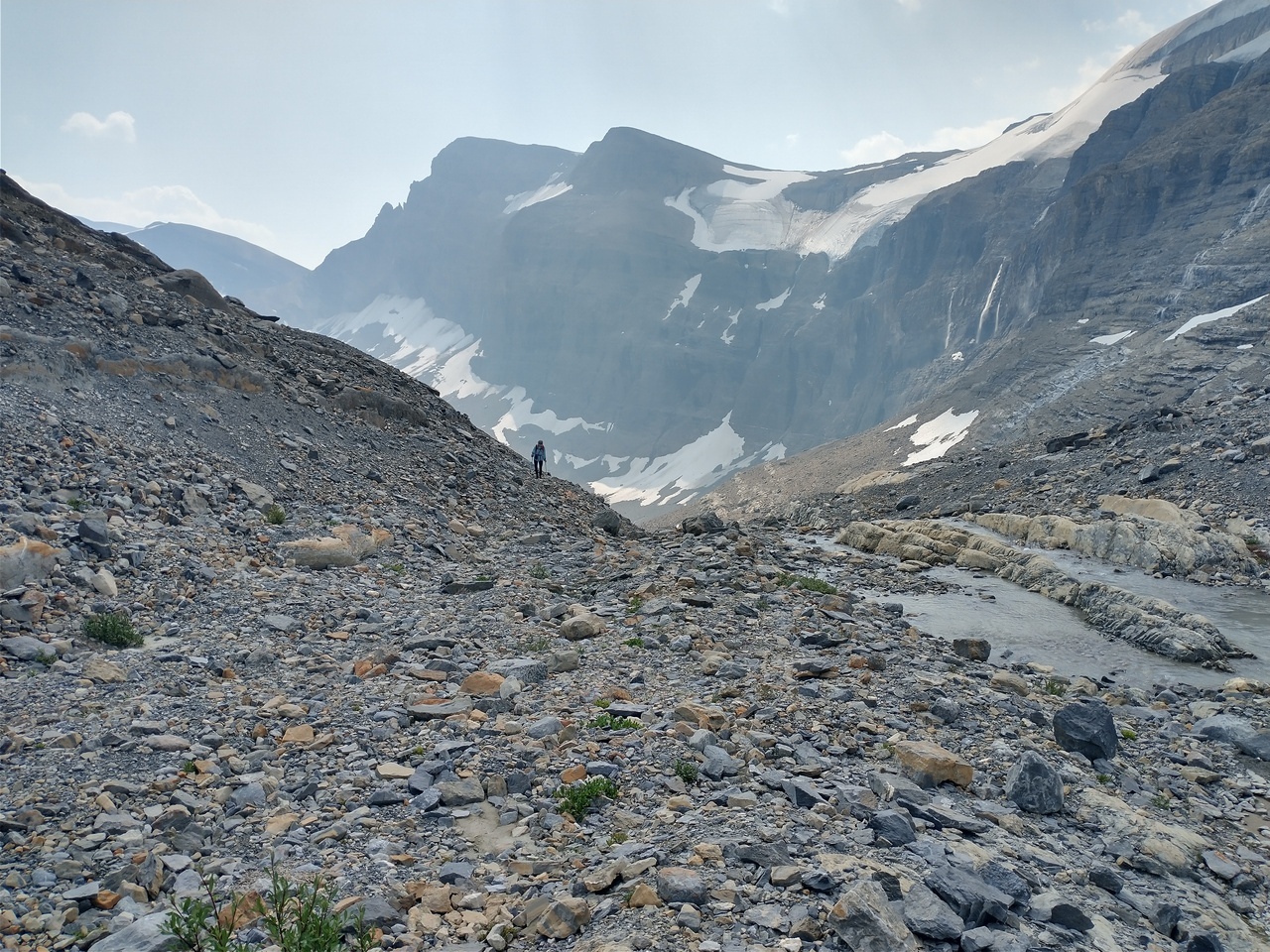Eventually we left the trees, and continued up to the end of the valley. A few stream crossings later, and we found ourselves at the base of the scree slope leading up to the ridge, which had previously been guarded by cliffs. A nice scree trail led up this slope and then turned right, towards Bow Hut. You can continue to follow the trail for a direct route to The Onion, but we opted to leave the trail here, and continue ascending straight up towards the Wapta Icefield! Photo credit: Dad