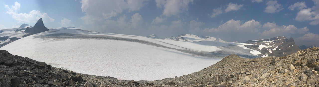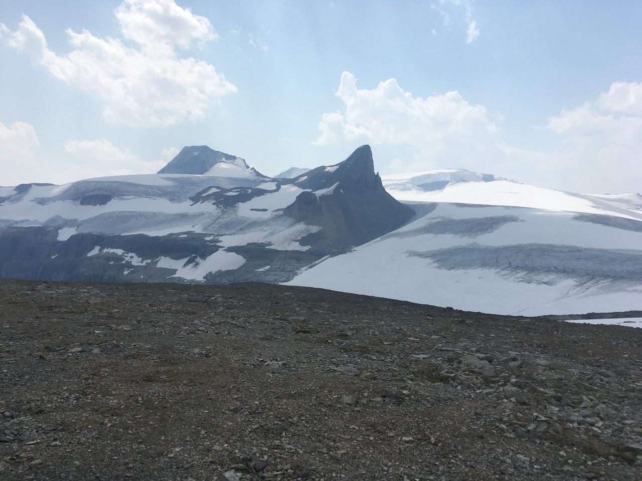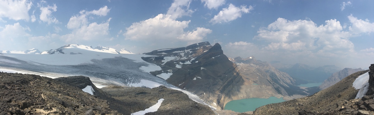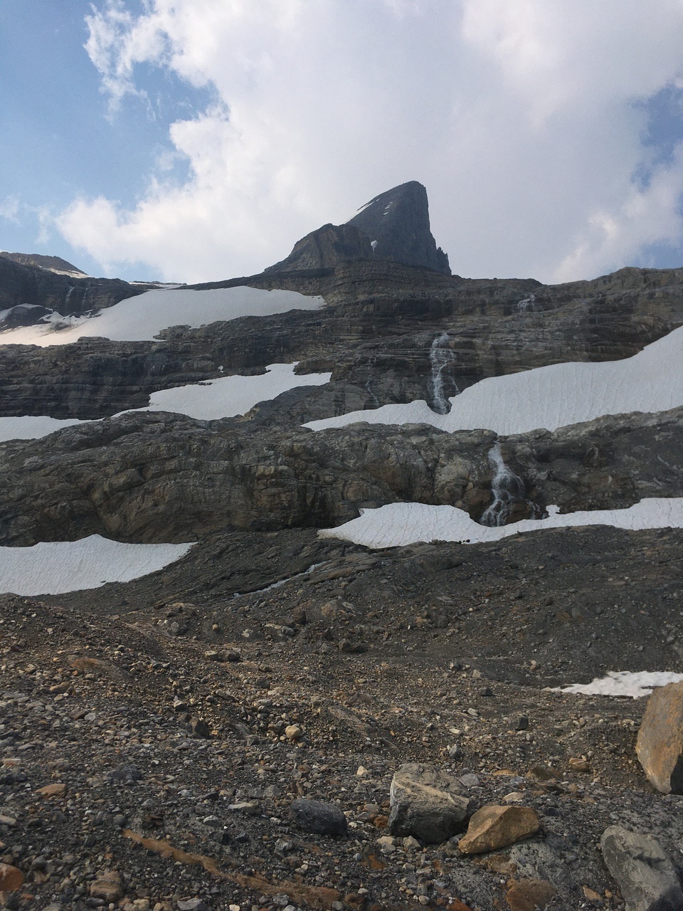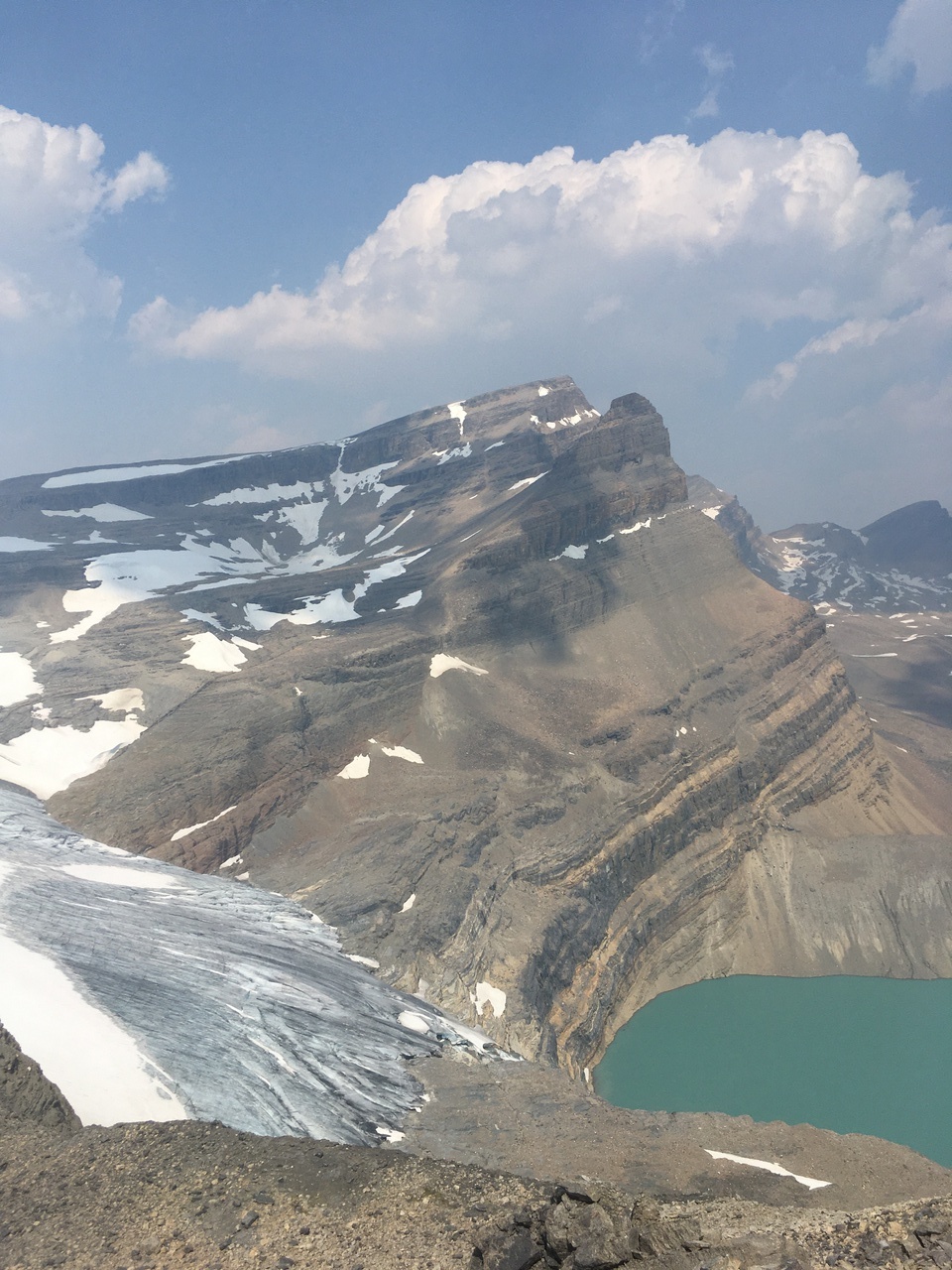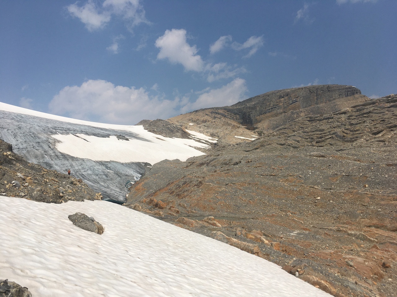 The edge of the Wapta Icefield, which feeds Iceberg Lake, Bow Glacier Falls, and finally Bow Lake! Portal Peak and Mount Thompson rise above! We easily followed along the edge of the icefield until this point, and then headed up along the ridge towards the summit of The Onion, which we had overshot!