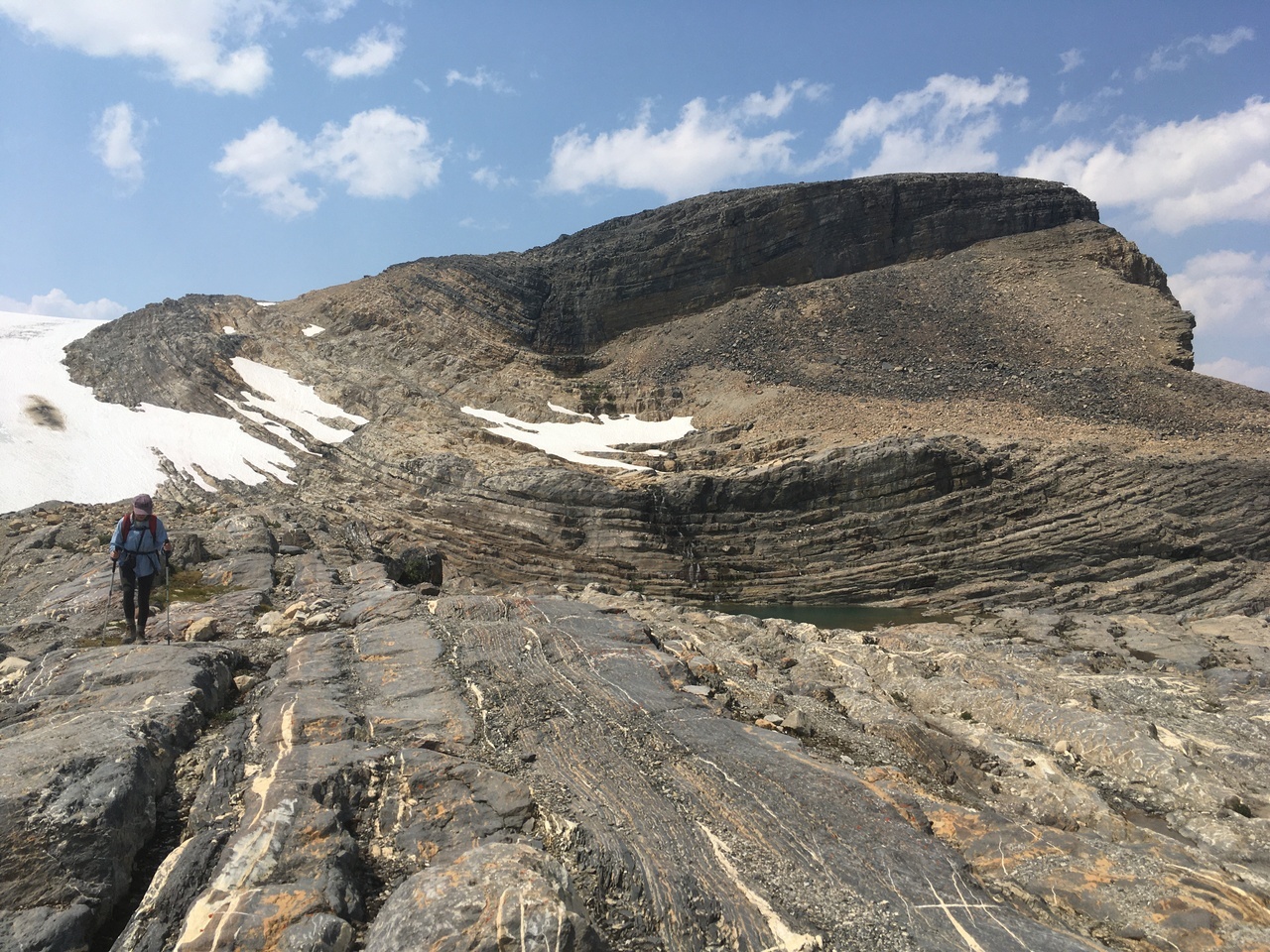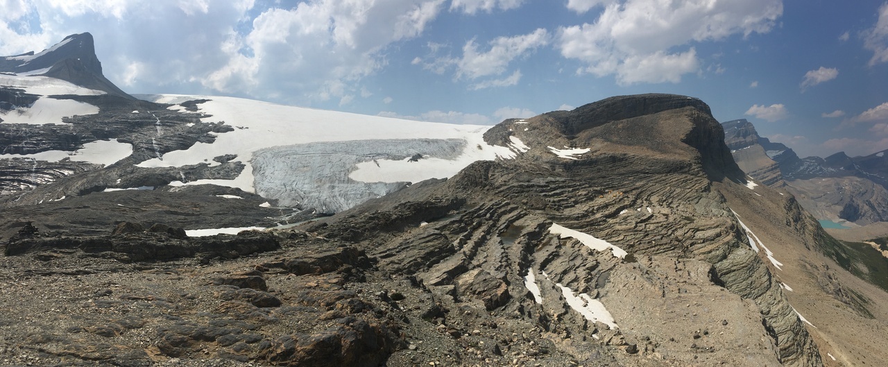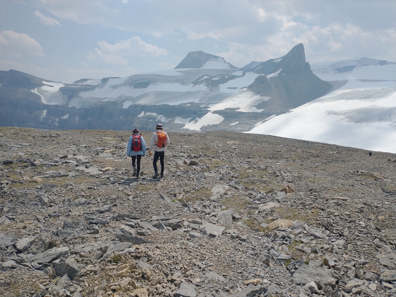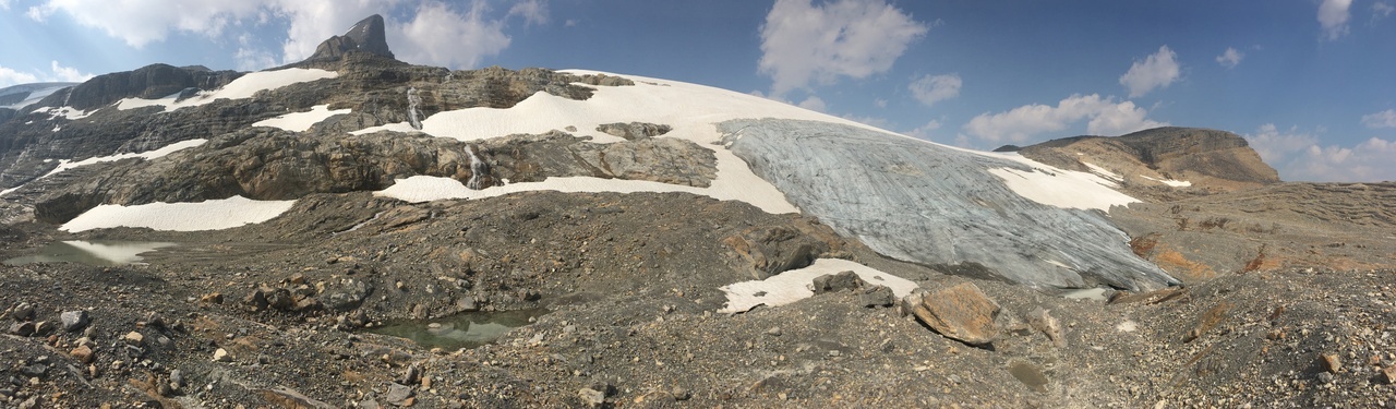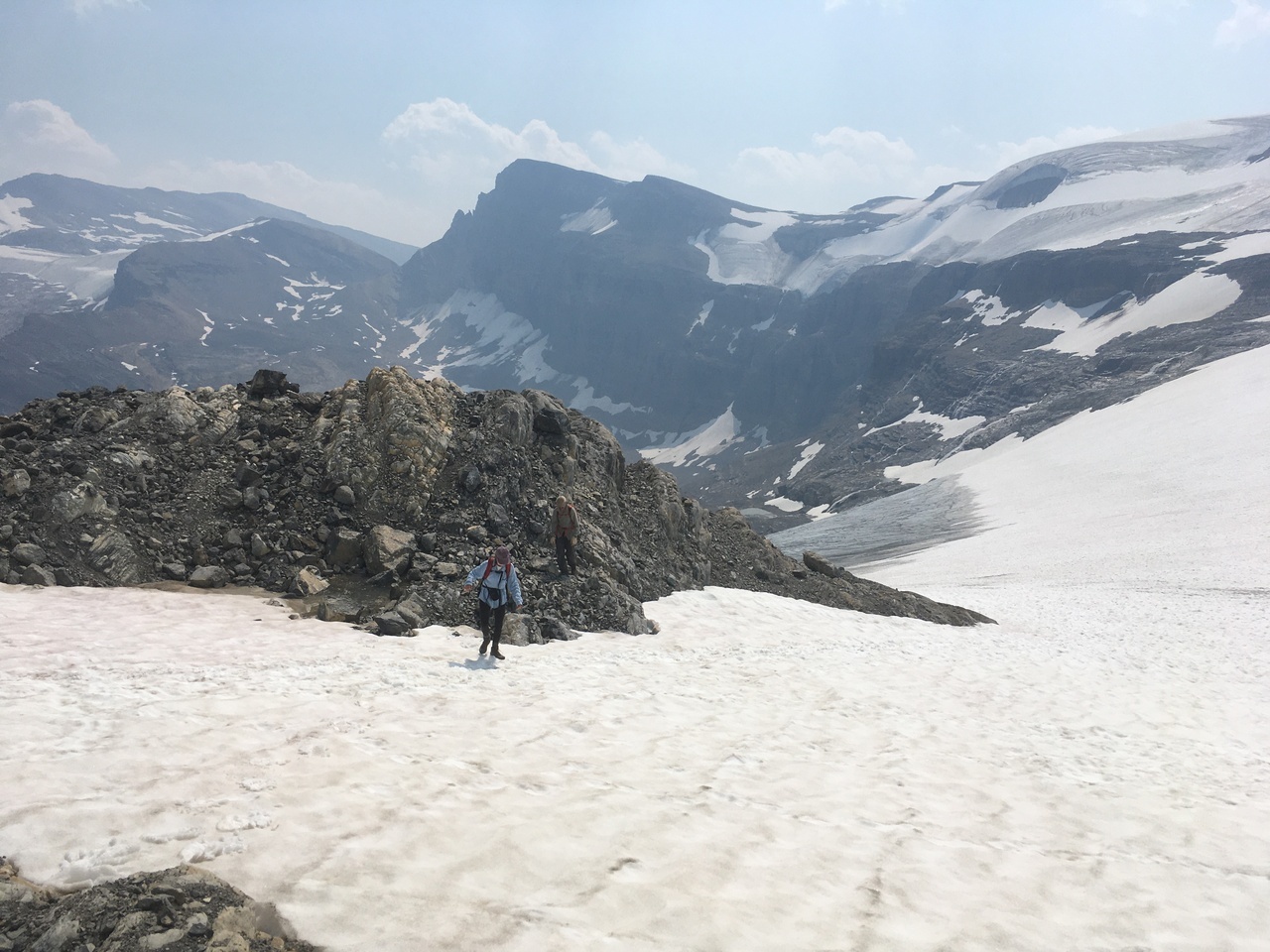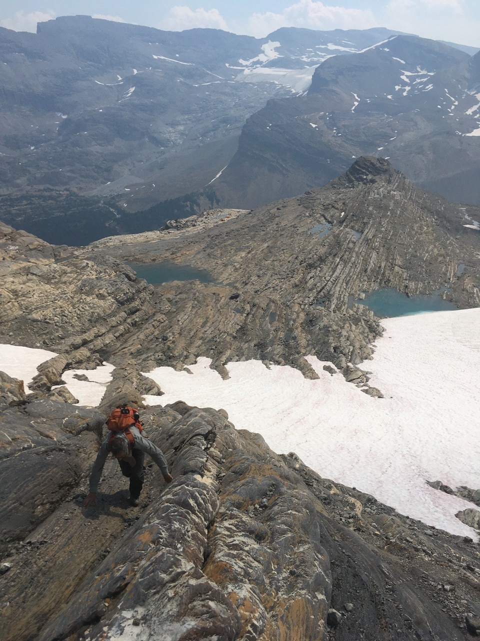 The edge of the Wapta Icefield, which feeds Iceberg Lake, Bow Glacier Falls, and finally Bow Lake! Portal Peak and Mount Thompson rise above! We easily followed along the edge of the icefield until this point, and then headed up along the ridge towards the summit of The Onion, which we had overshot!