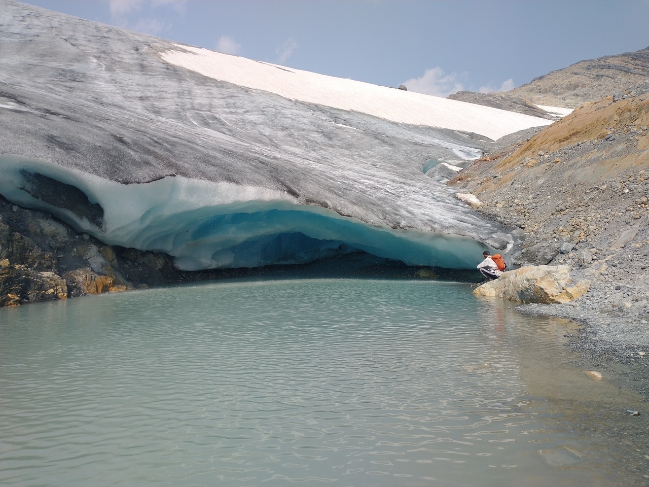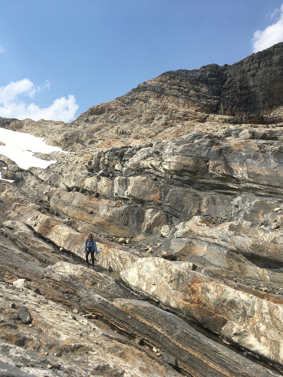 Kaitlyn crossing a snow patch on the edge of the icefield!