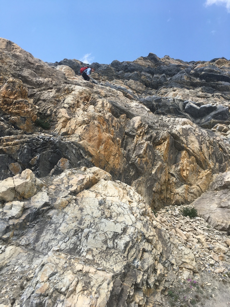 The beginning of the Crowfoot traverse is readily seen from this side! It begins by easily ascending the brown-coloured North Peak, followed by continuing along the ridge towards the North Summit, only to follow the wide gully (noticeable from this angle) down until a weakness appears in the cliff band!