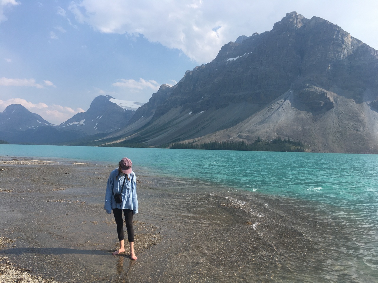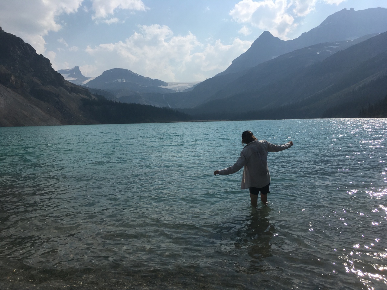 After the long hike back down to Bow Lake, we gave our feet a break and walked in the water for a bit! Photo credit: Kaitlyn