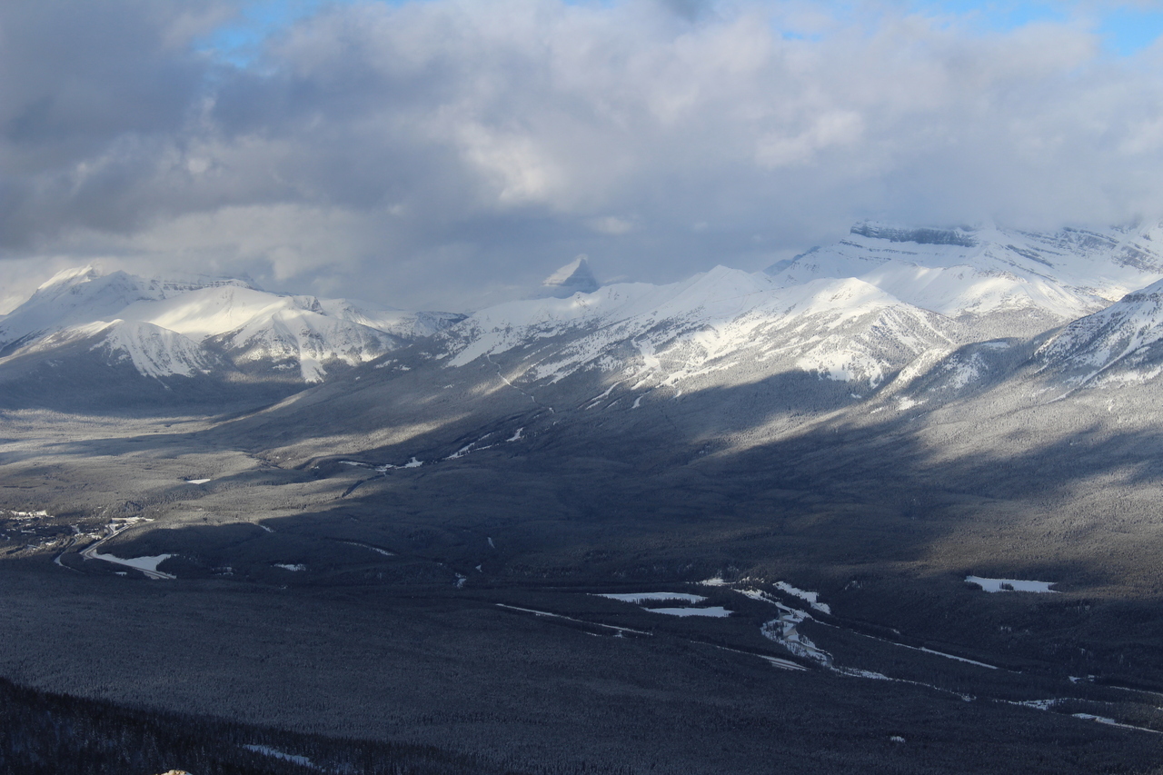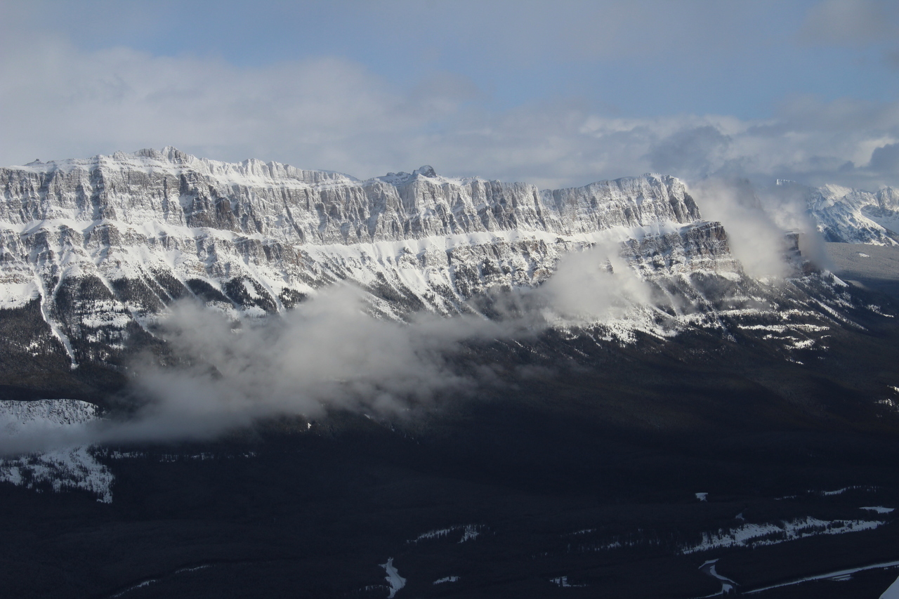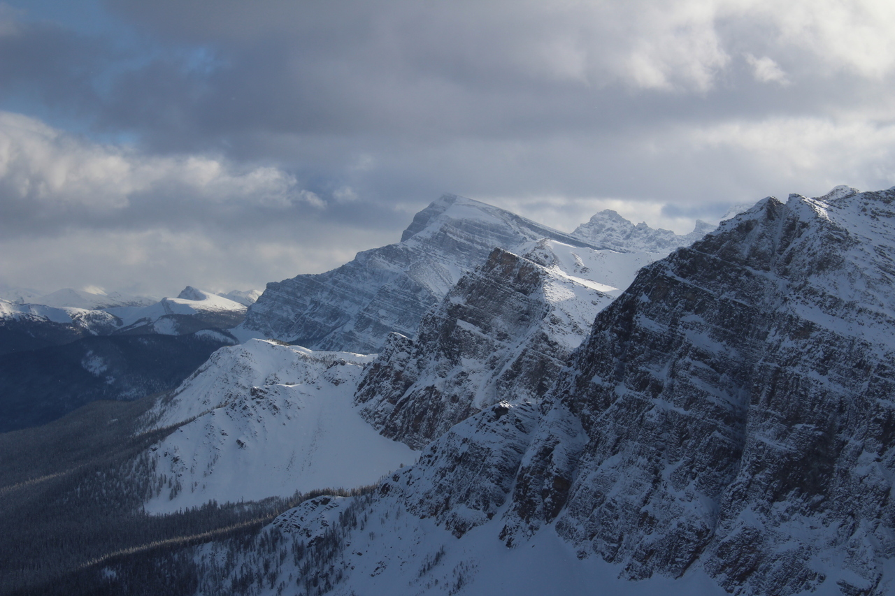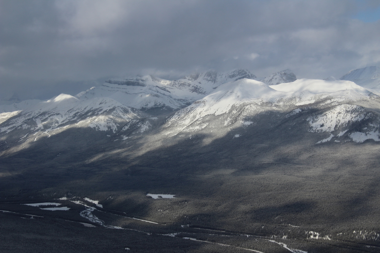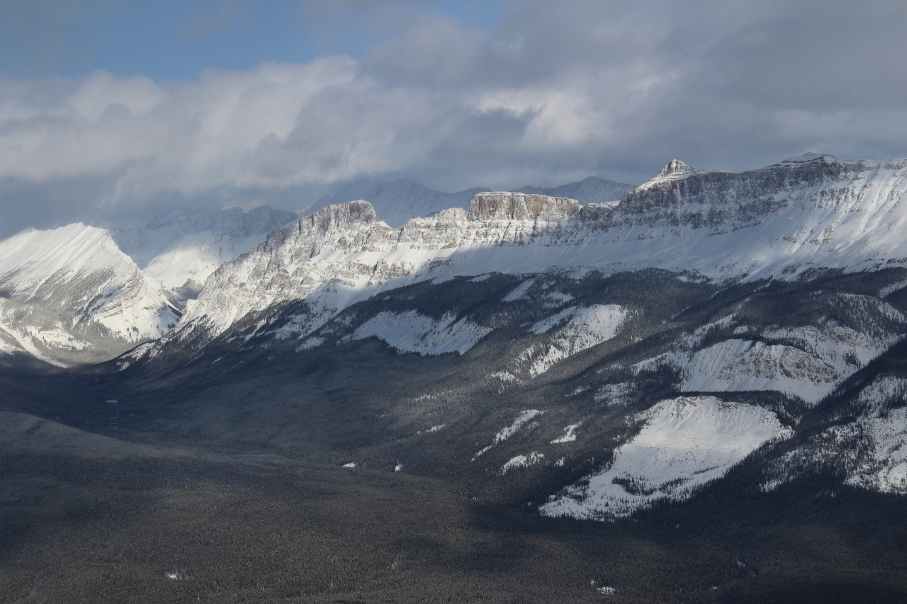 The Skoki group across the highway! Mount Richardson, Pika Peak, Ptarmigan Peak and Mount Redoubt meet the clouds (center), with the Lake Louise Ski Resort (Whitehorn Mountain) below-left, and Lipalian Mountain, Purple Mound (not so purple right now!), and Unity Peak (barely visible), piling up to the right!