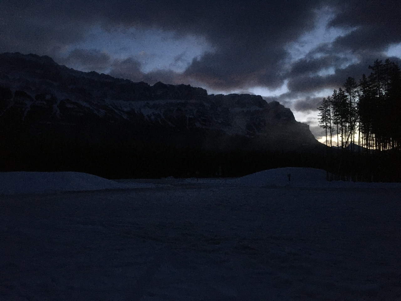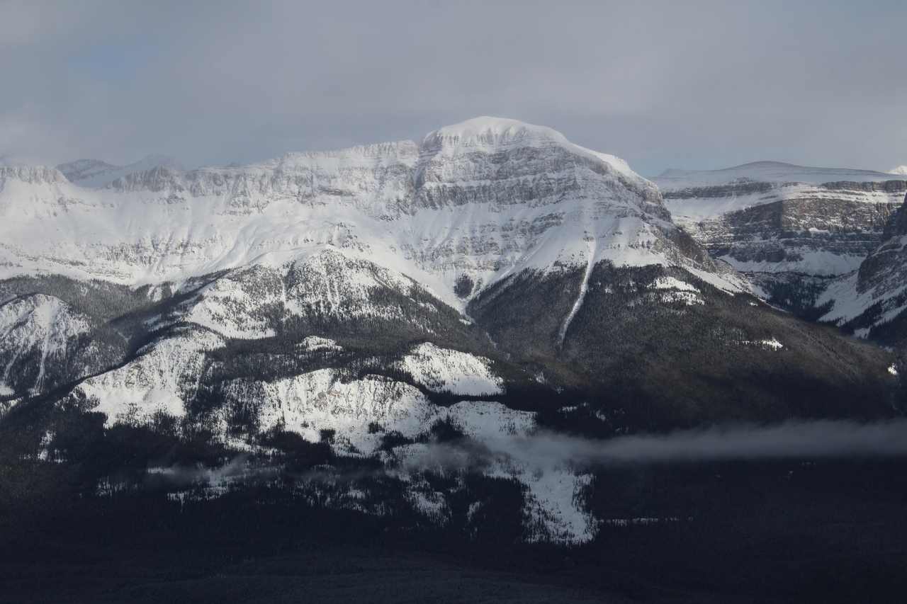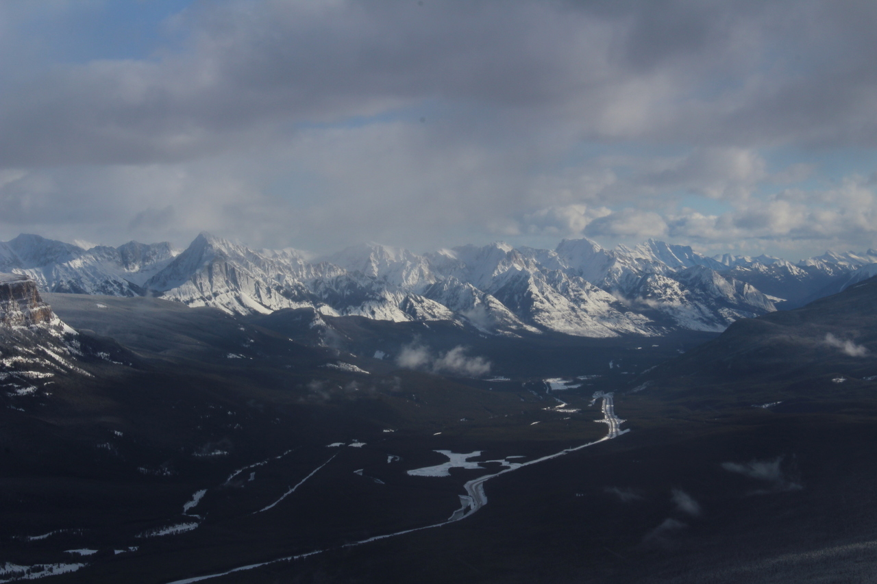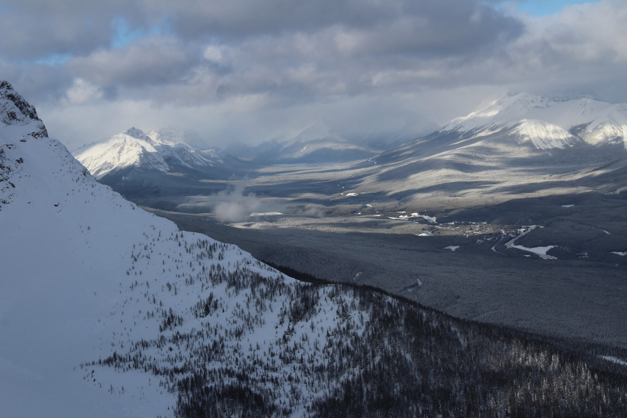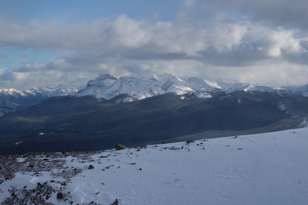 The Skoki group across the highway! Mount Richardson, Pika Peak, Ptarmigan Peak and Mount Redoubt meet the clouds (center), with the Lake Louise Ski Resort (Whitehorn Mountain) below-left, and Lipalian Mountain, Purple Mound (not so purple right now!), and Unity Peak (barely visible), piling up to the right!