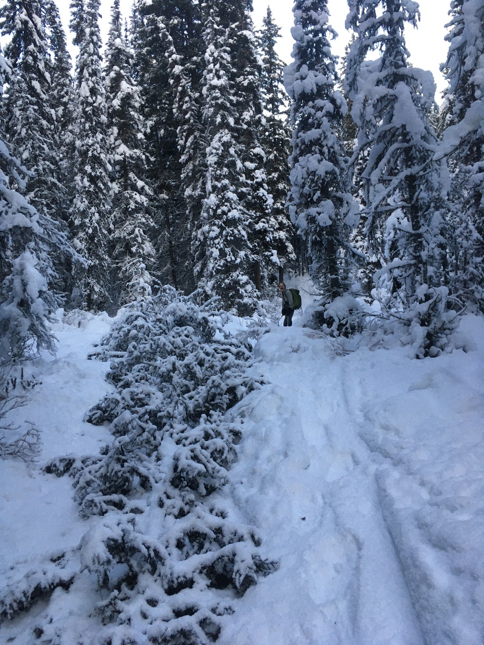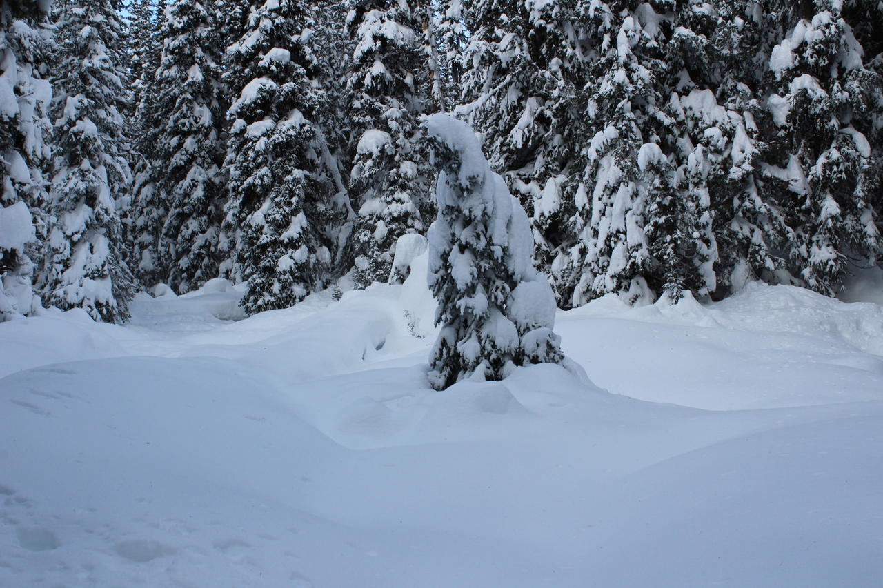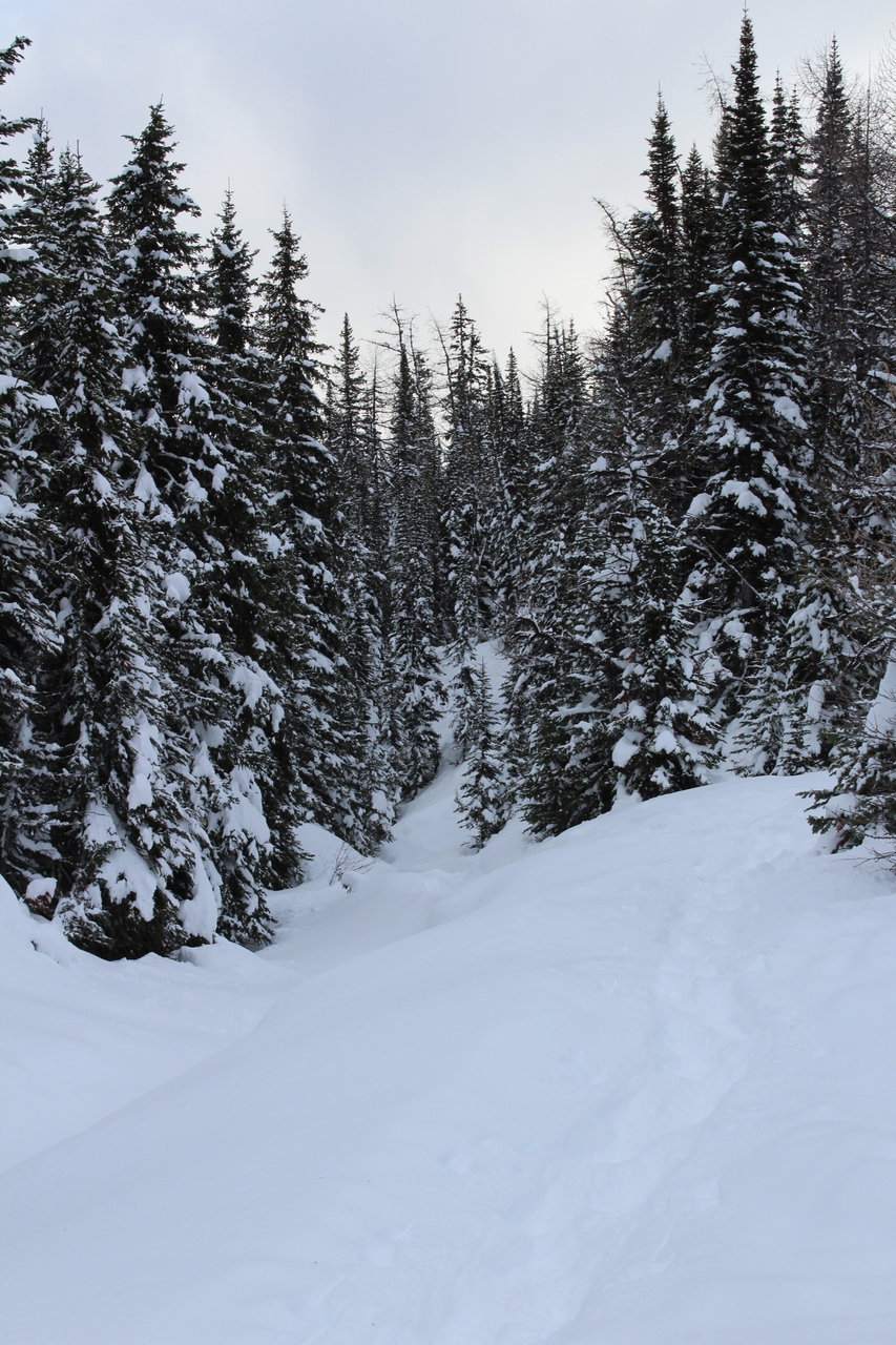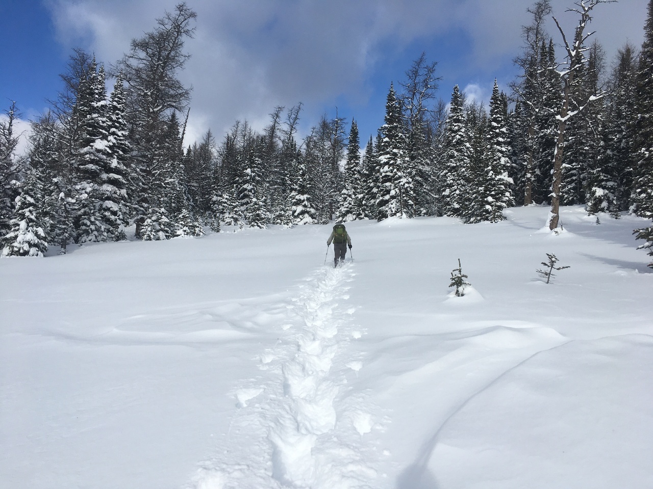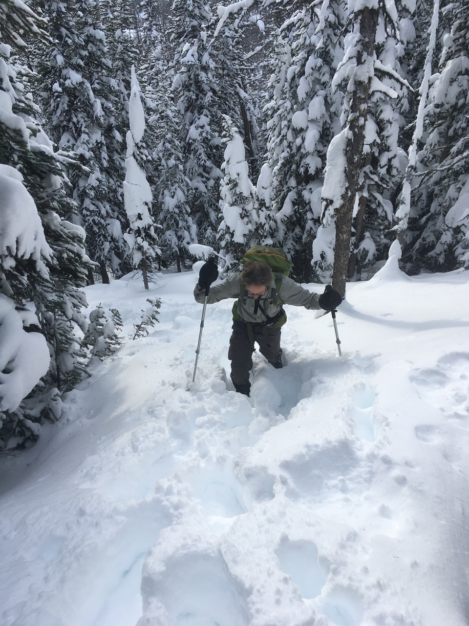 Plowing through deeper snow as we gain elevation, heading back into the trees!