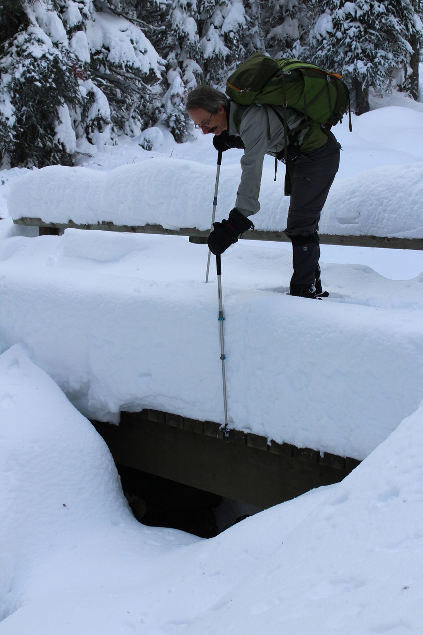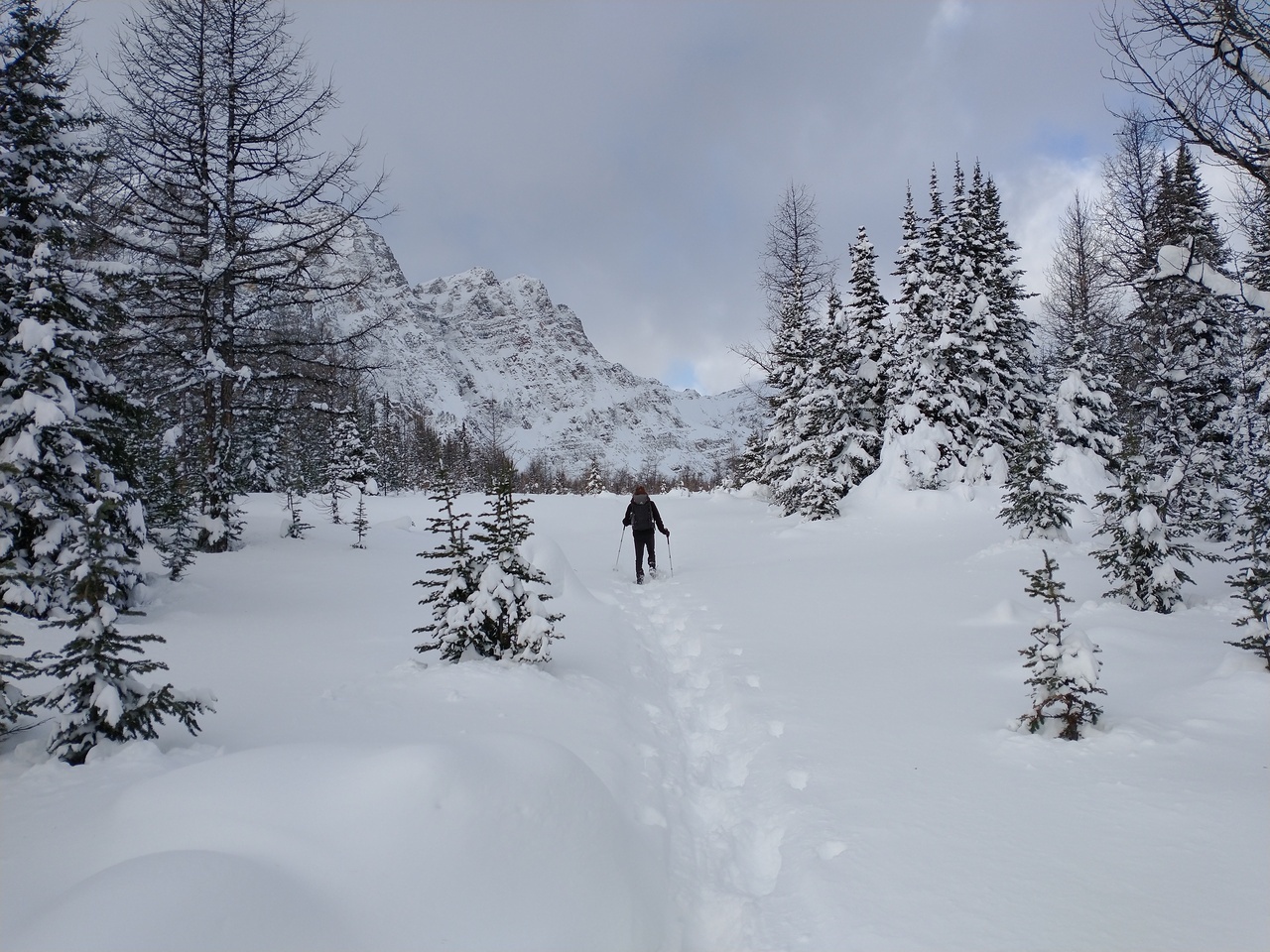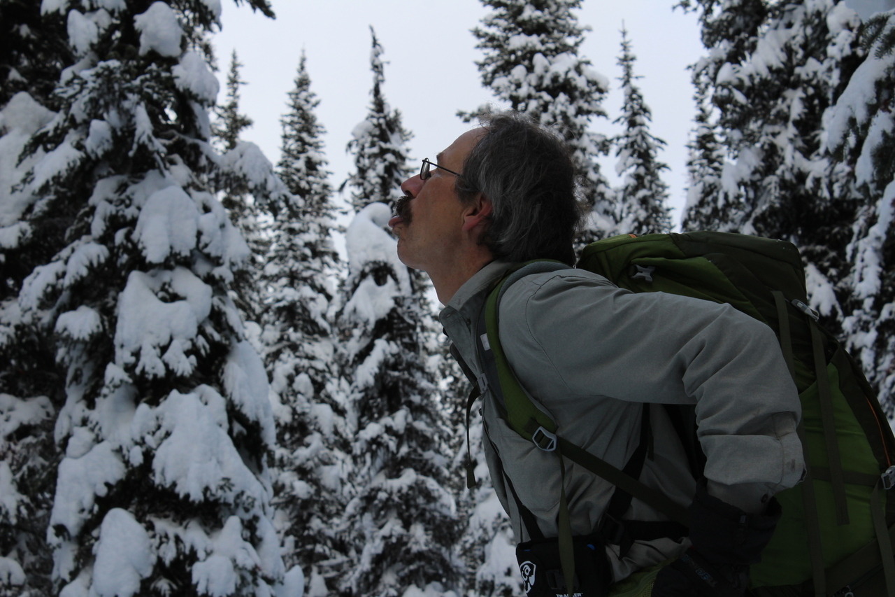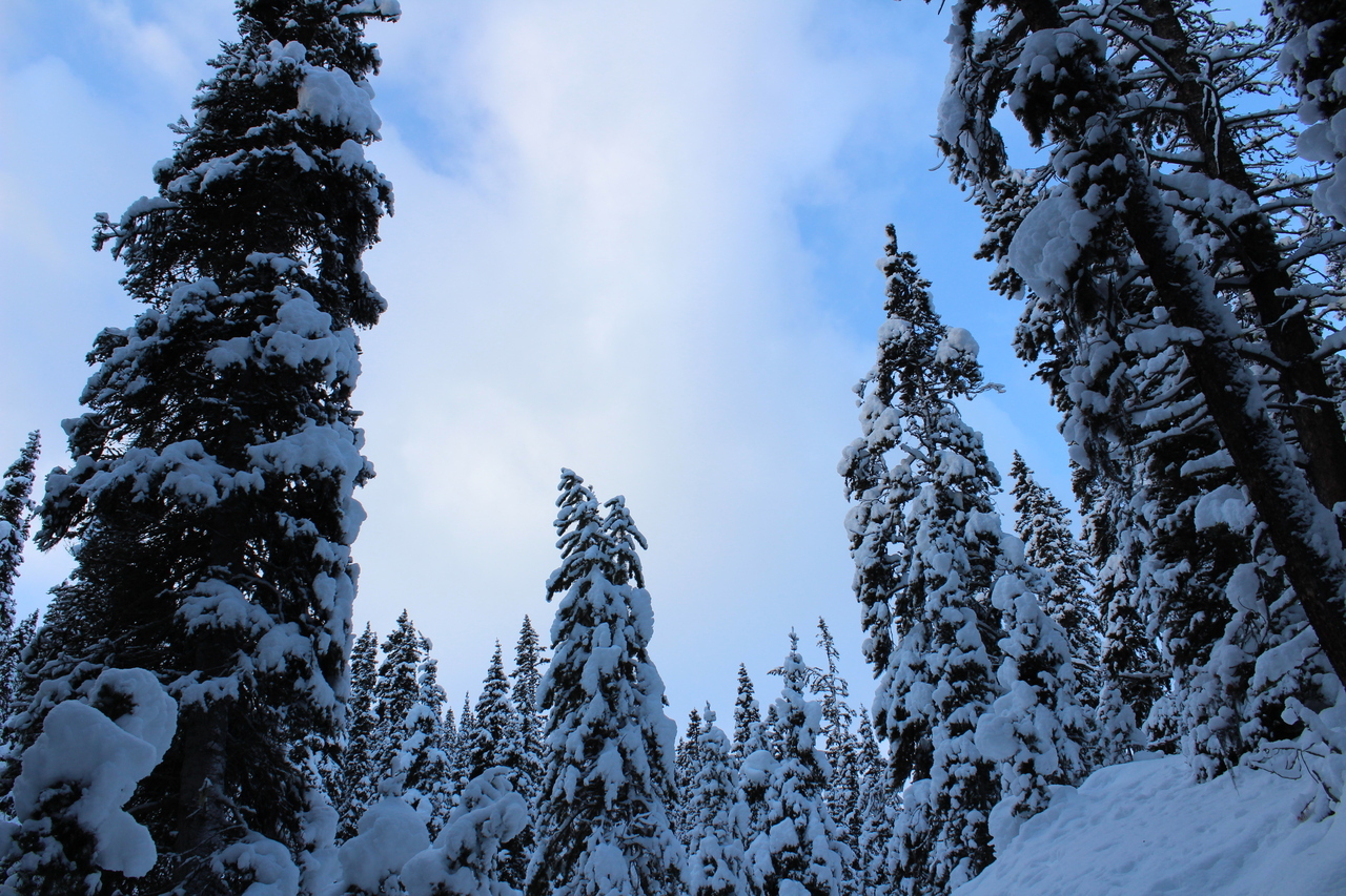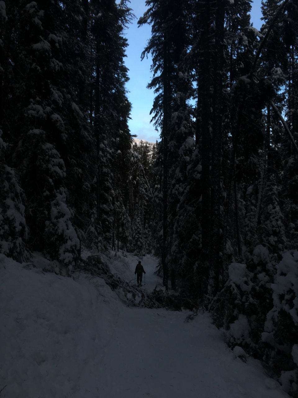 Plowing through deeper snow as we gain elevation, heading back into the trees!