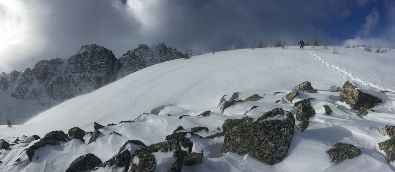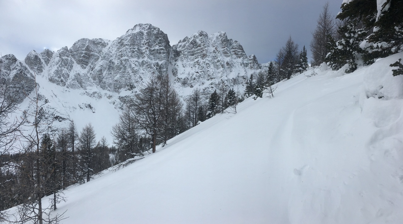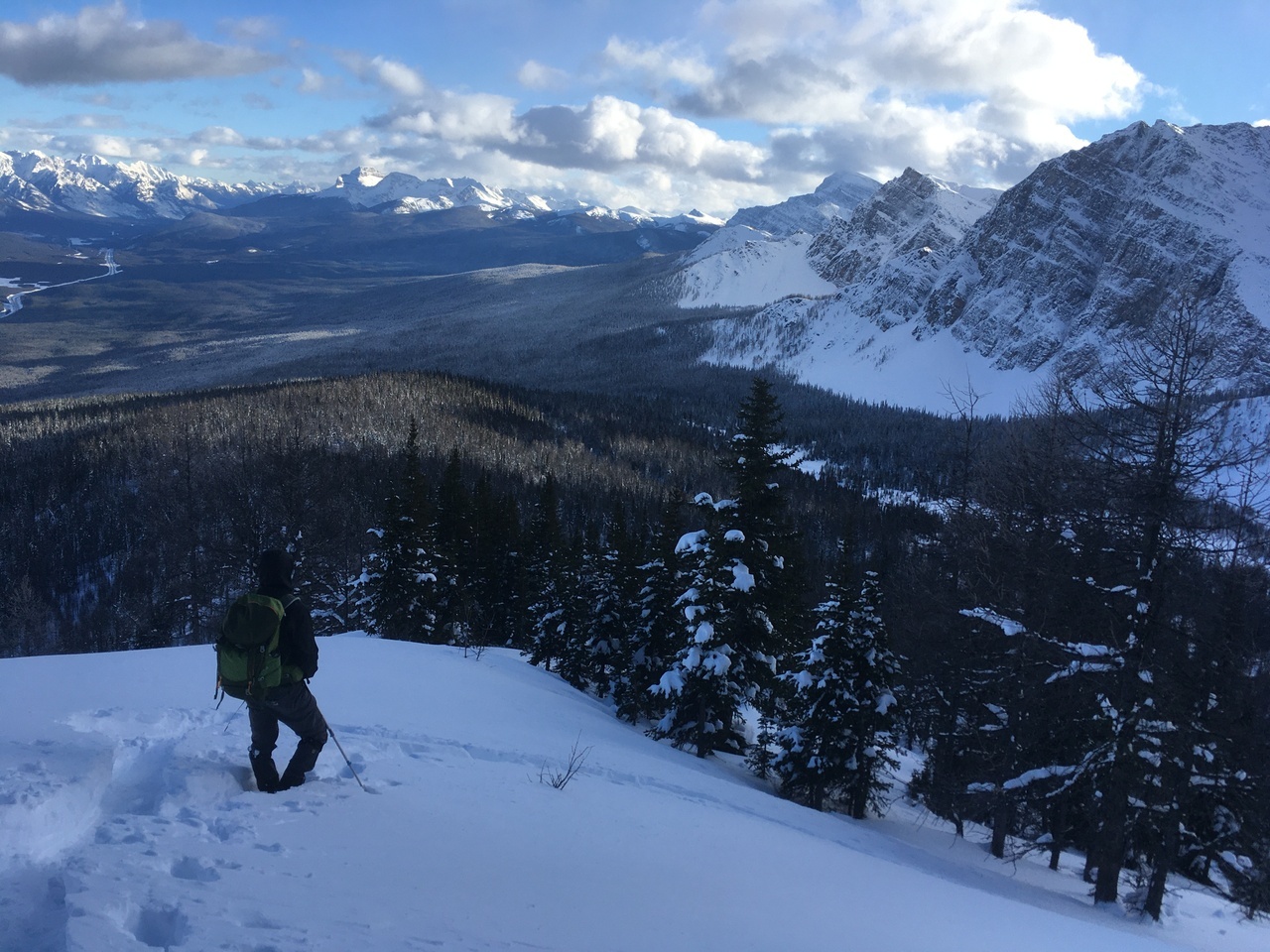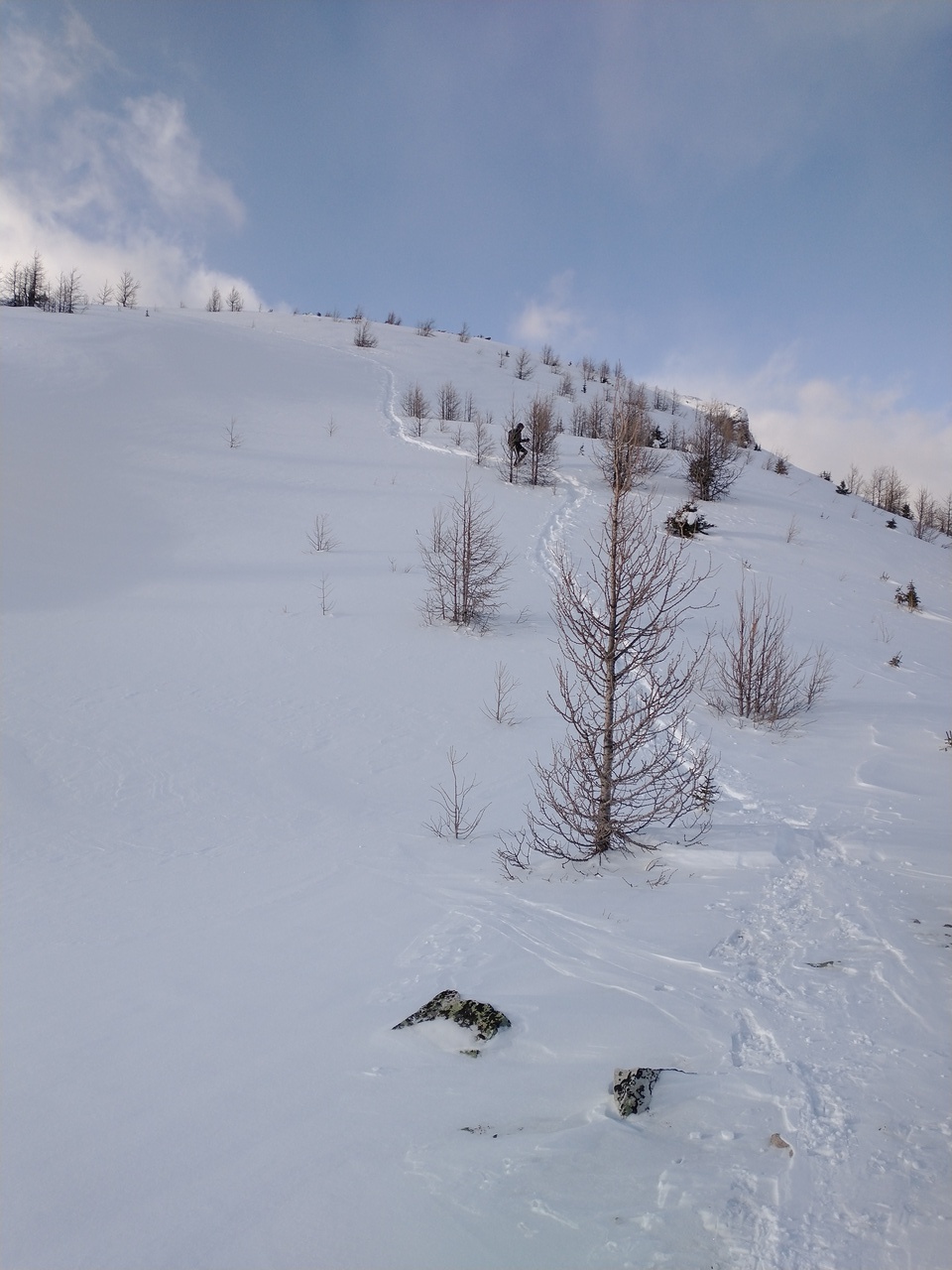 Descending the open slope, back to the treeline! Photo credit: Dad