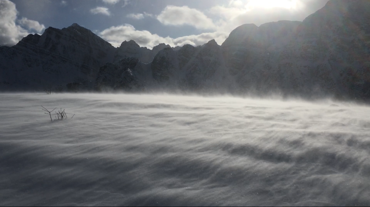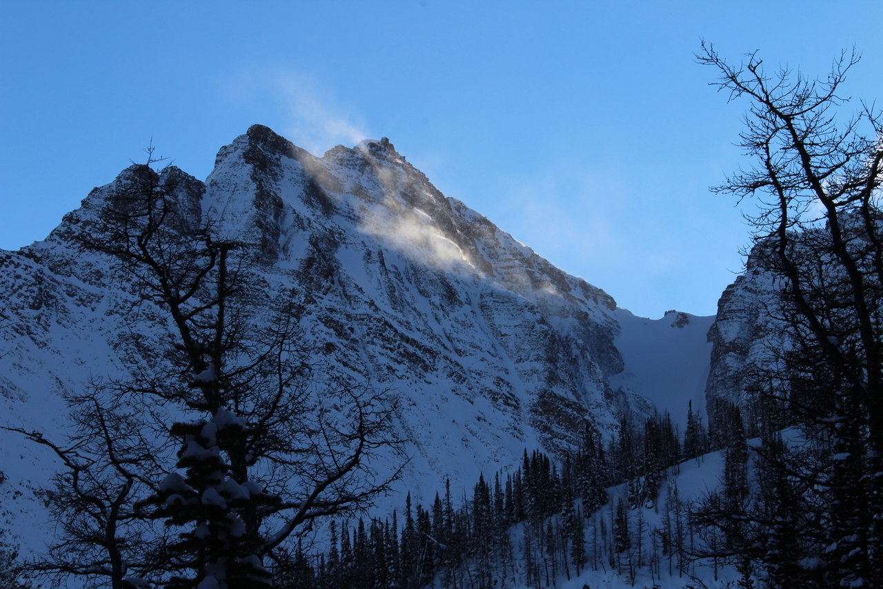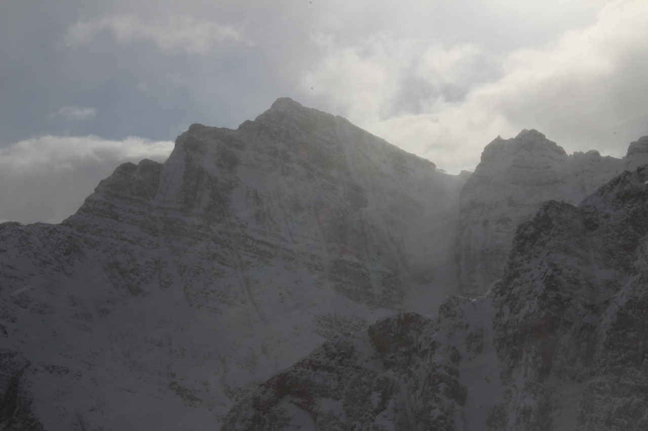 Note the streaks of snow, in front of Mount Bell, in the blasting wind!