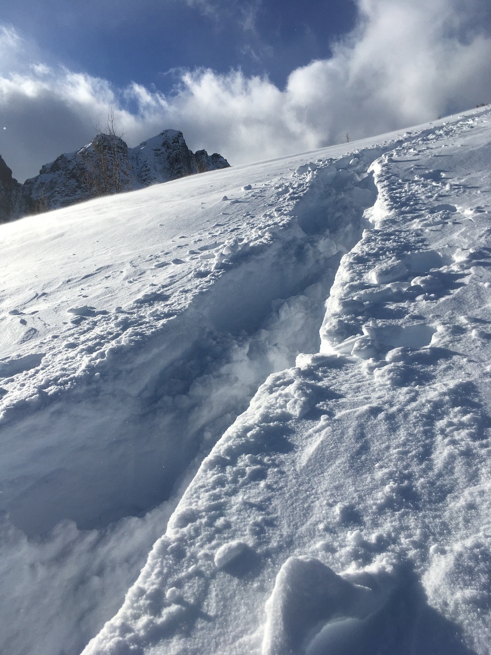 It's hard to believe, but this significant trail is new from our descent! Our tracks from our ascent had totally vanished in the snow-blasting winds!