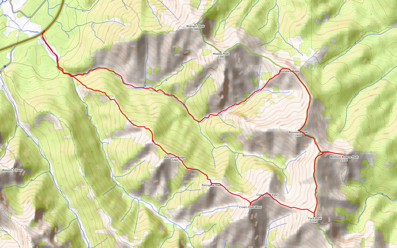 On our trip up Wasootch Ridge, a couple weeks prior, we had noticed a collection of surprisingly NAMED peaks, making up a long ridge, leading from Highway 40 all the way to Tiara Peak. Soon thereafter, I had my nose deep in a topo map, studying how many peaks I could bag in one big loop! The plan that resulted ascended the long ridge (starting with Porcupine Ridge) all the way to Tiara Peak, hitting all named points along the way. We would then traverse below Tiara's summit block, and scramble up it as well. This would be the apex of the loop, from which we would continue down the ridge (north), making a brief detour to Belmore Browne, before ascending Boundary Peak, and finishing it off with Boundary Ridge. The final descent would involve easily descending (I hope...) to the drainage below Boundary Ridge, and simply following this drainage back to the highway. I knew that most of this route would be relatively straightforward, thanks to a trip report from Vern Dewit, but couldn't find any beta on my final descent...(Vern continued on to Midnight and Midday, which we bagged earlier this season). Oh well! It'll probably work out ;)!