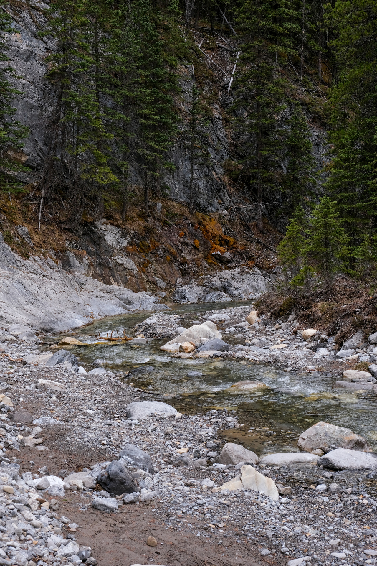 A little over a kilometer in, the creek splits in two, and the route ascends the steep, treed ridge directly in the middle.