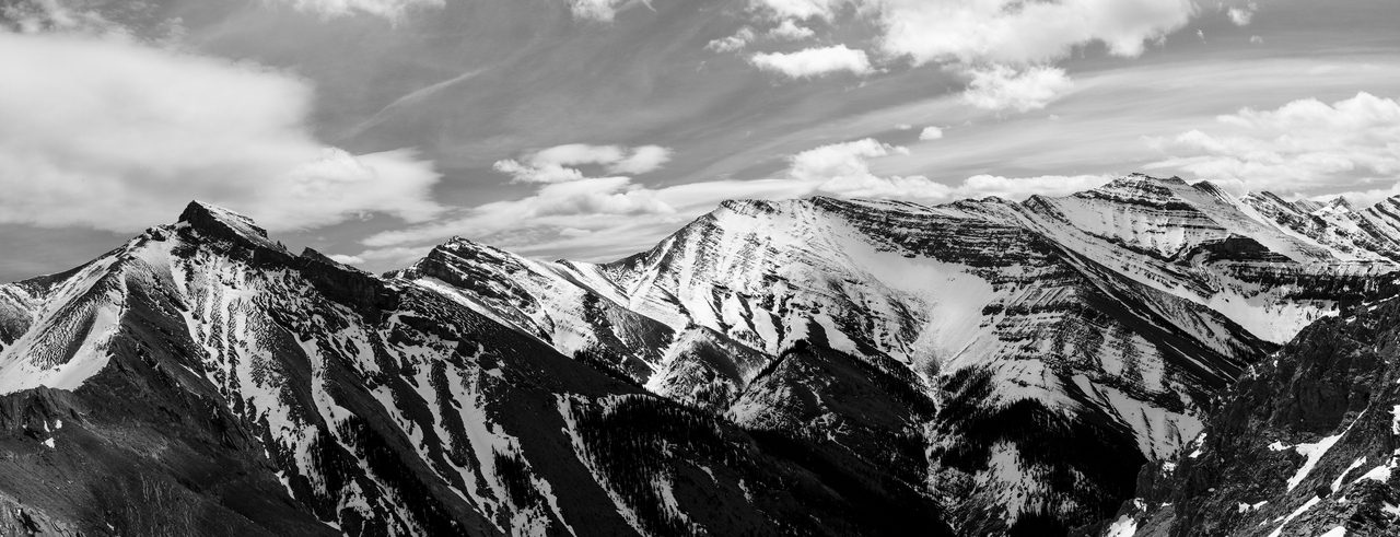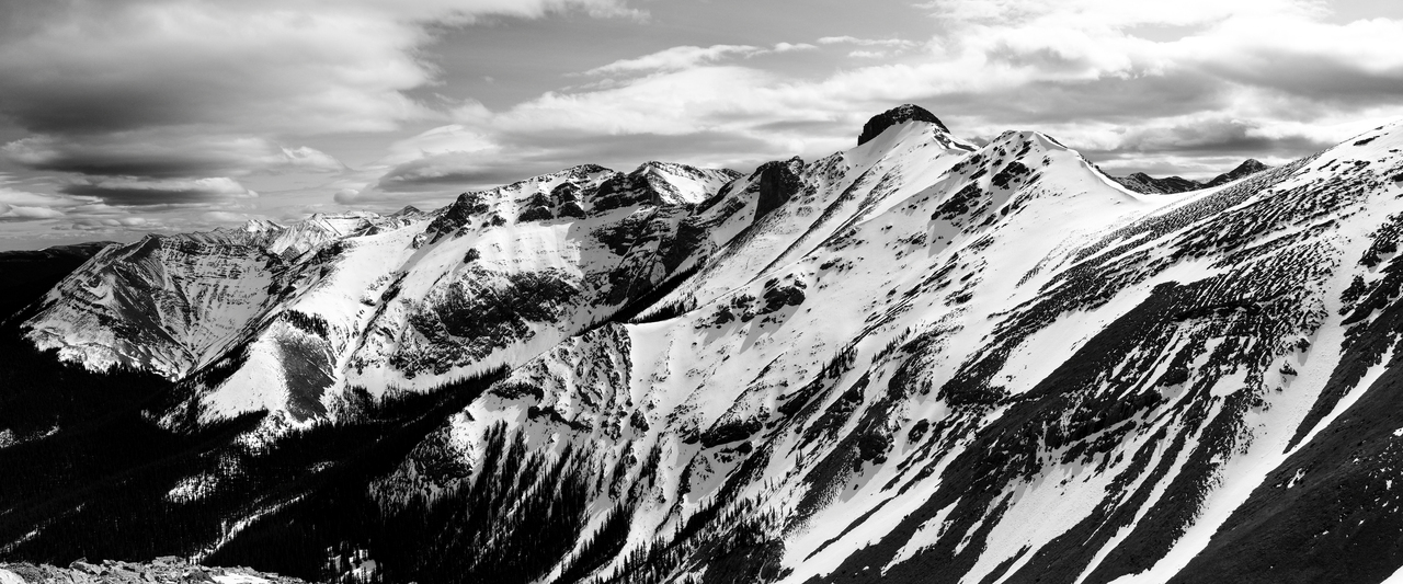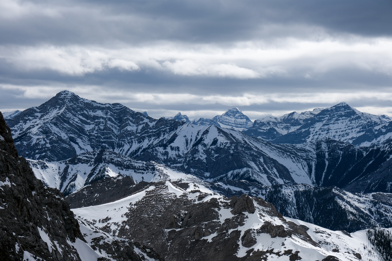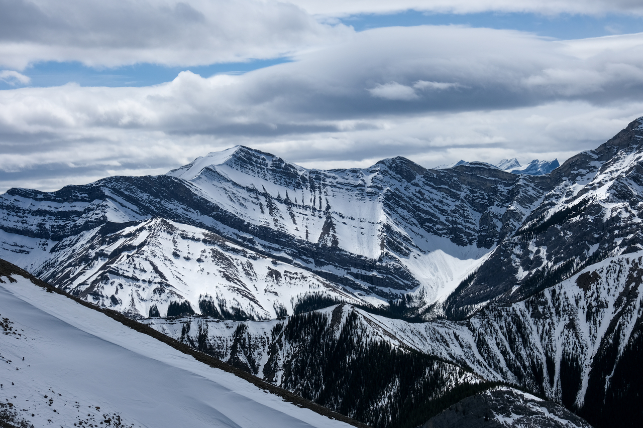 Bryant Ridge Peaks 5 and 6, Mount McDougall, Old Baldy, Kananaskis Peak, and Wasootch Peak, all rise over Wasootch Ridge, blending in in the foreground.
