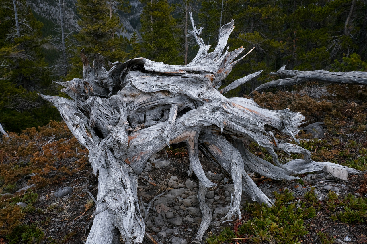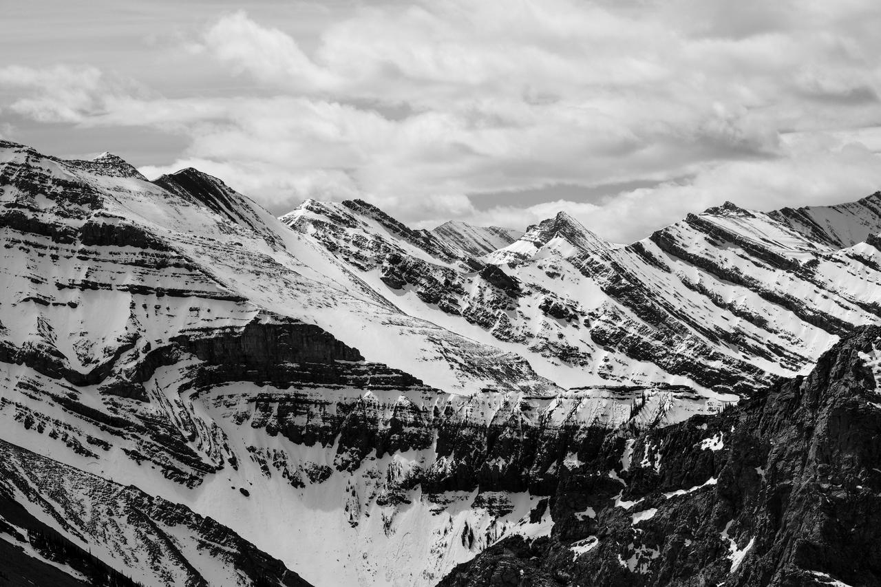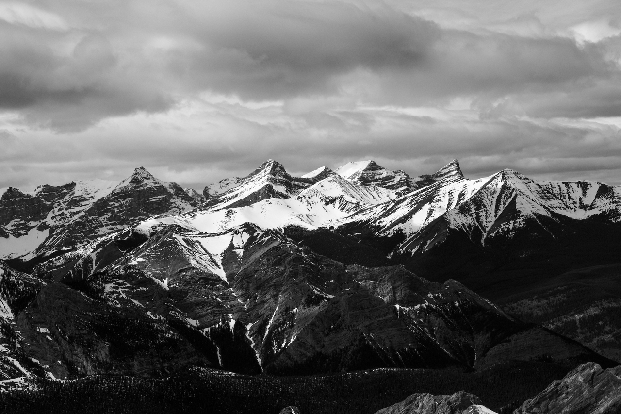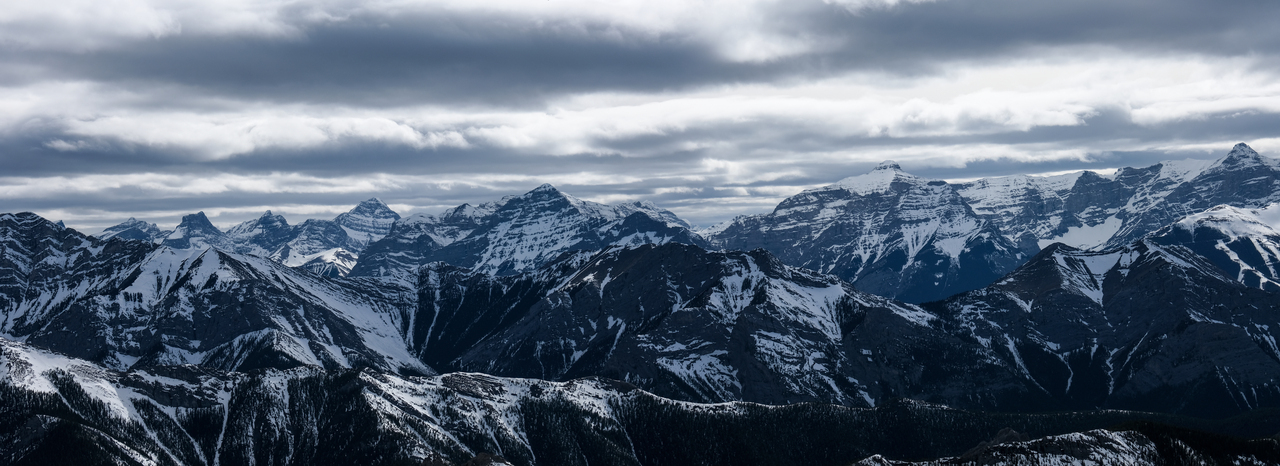 Bryant Ridge Peaks 5 and 6, Mount McDougall, Old Baldy, Kananaskis Peak, and Wasootch Peak, all rise over Wasootch Ridge, blending in in the foreground.