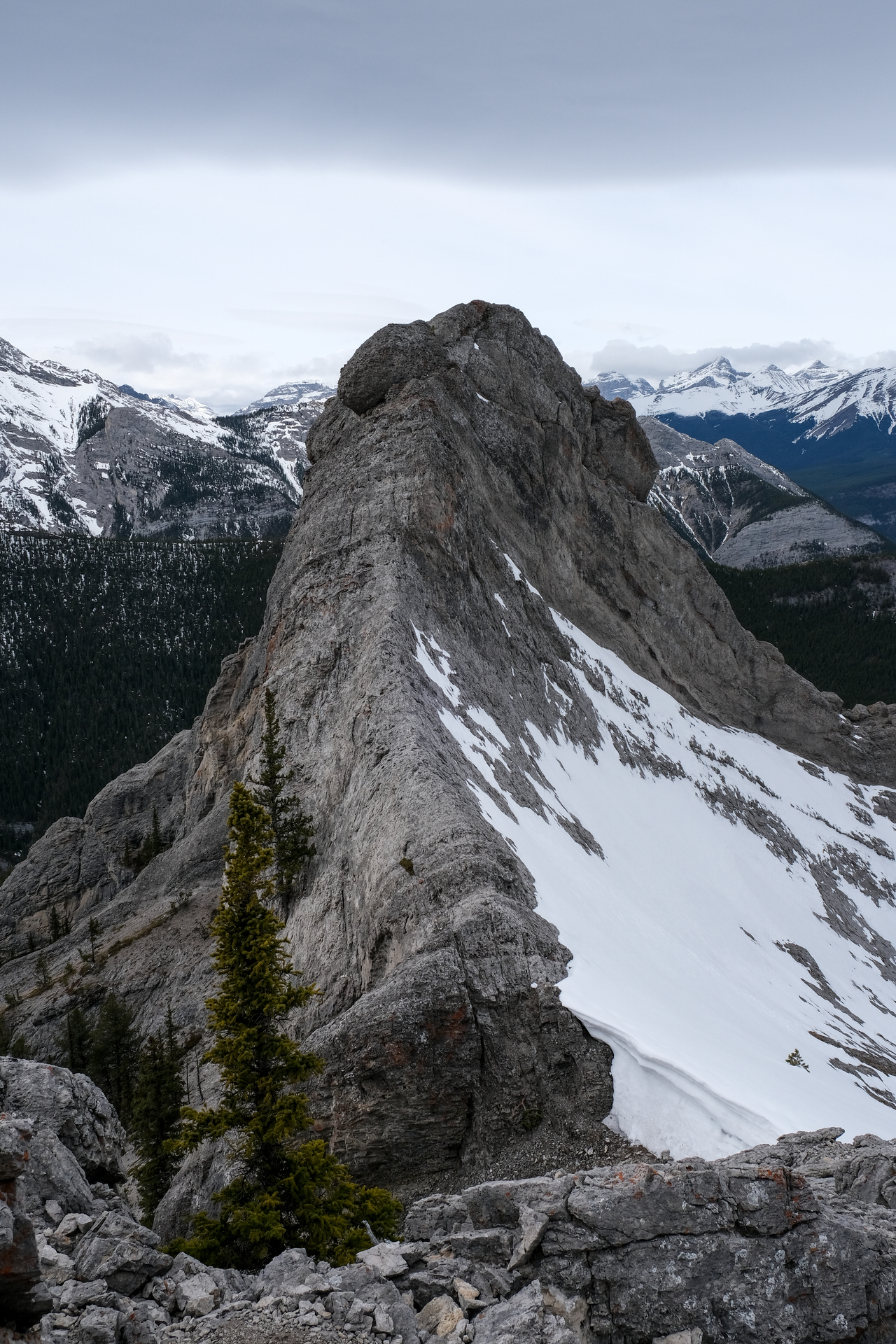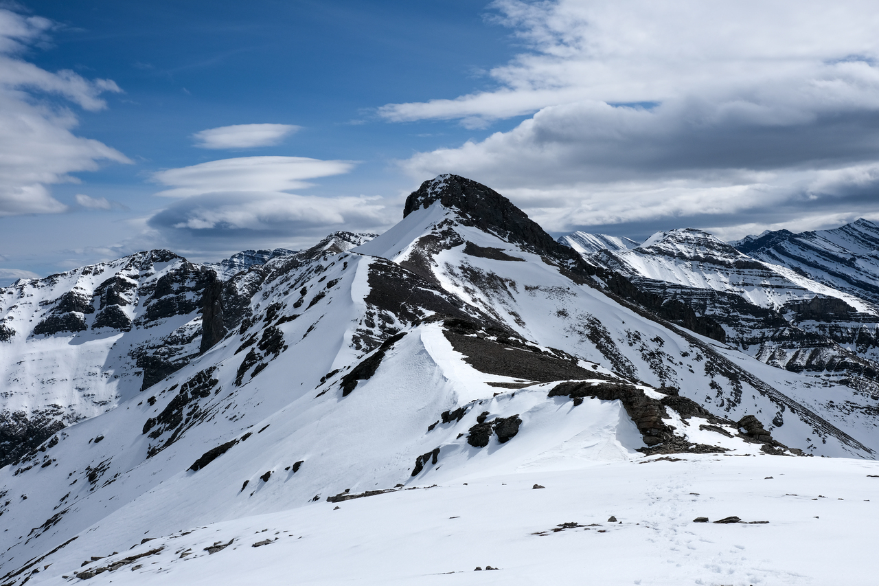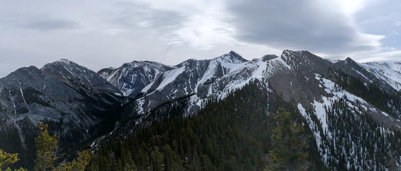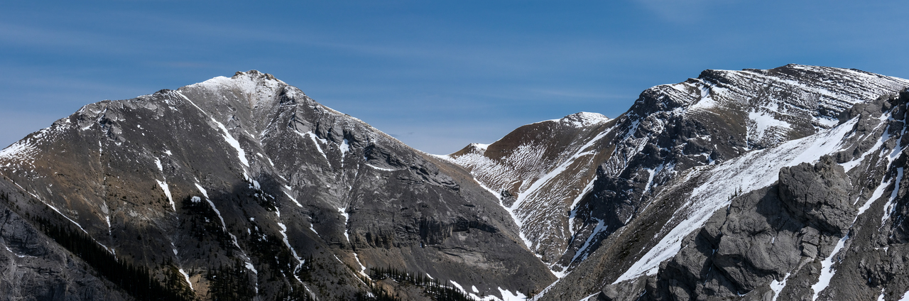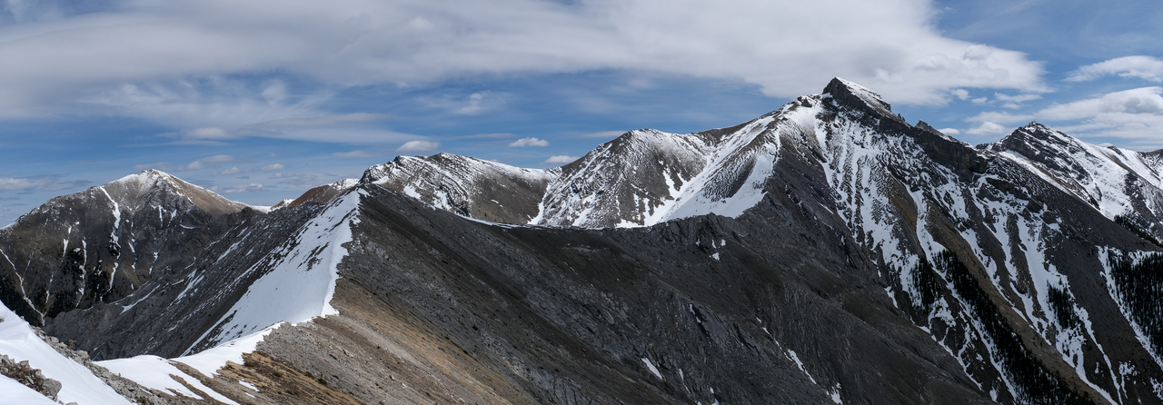 A wall of rock rises beyond Wasootch Peak, comprised of Mount Bogart, Ribbon Peak, Mount Sparrowhawk, Wind Mountain, and the other three peaks of Mount Lougheed!