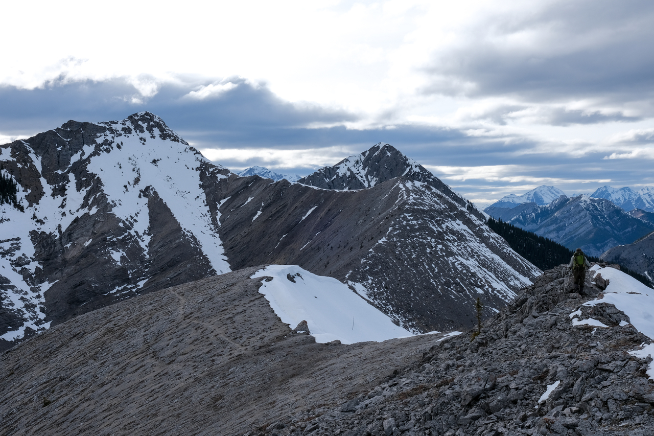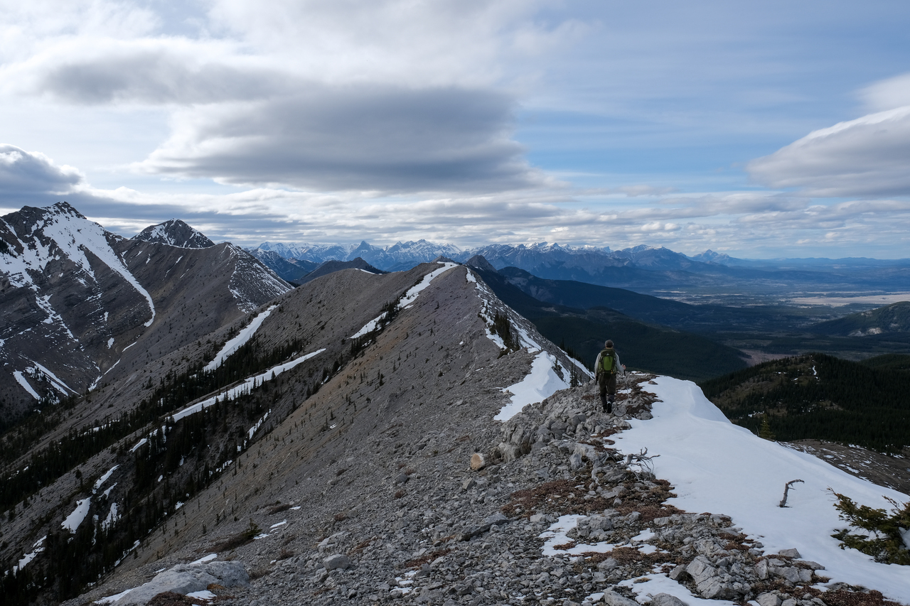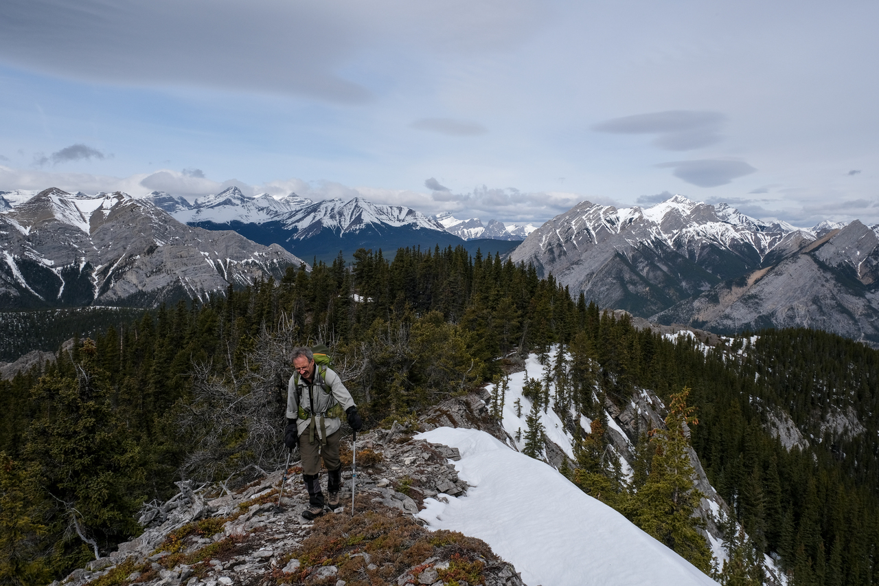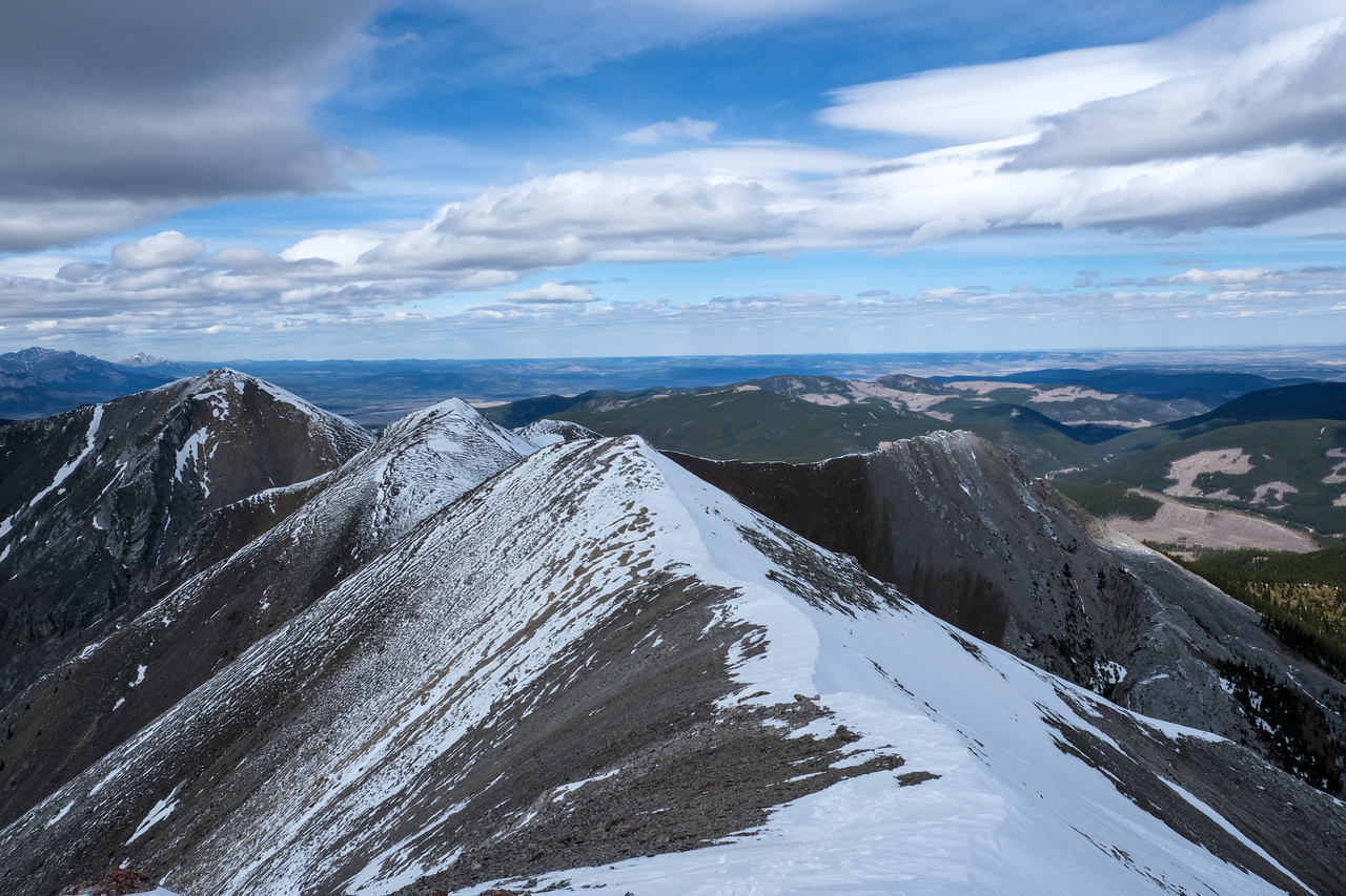 The Kananaskis Range rises in the distance, with the long, paralleling Porcupine and Wasootch Ridges in the foreground (left). The wide drainage, where we began our day, is visible to the right.