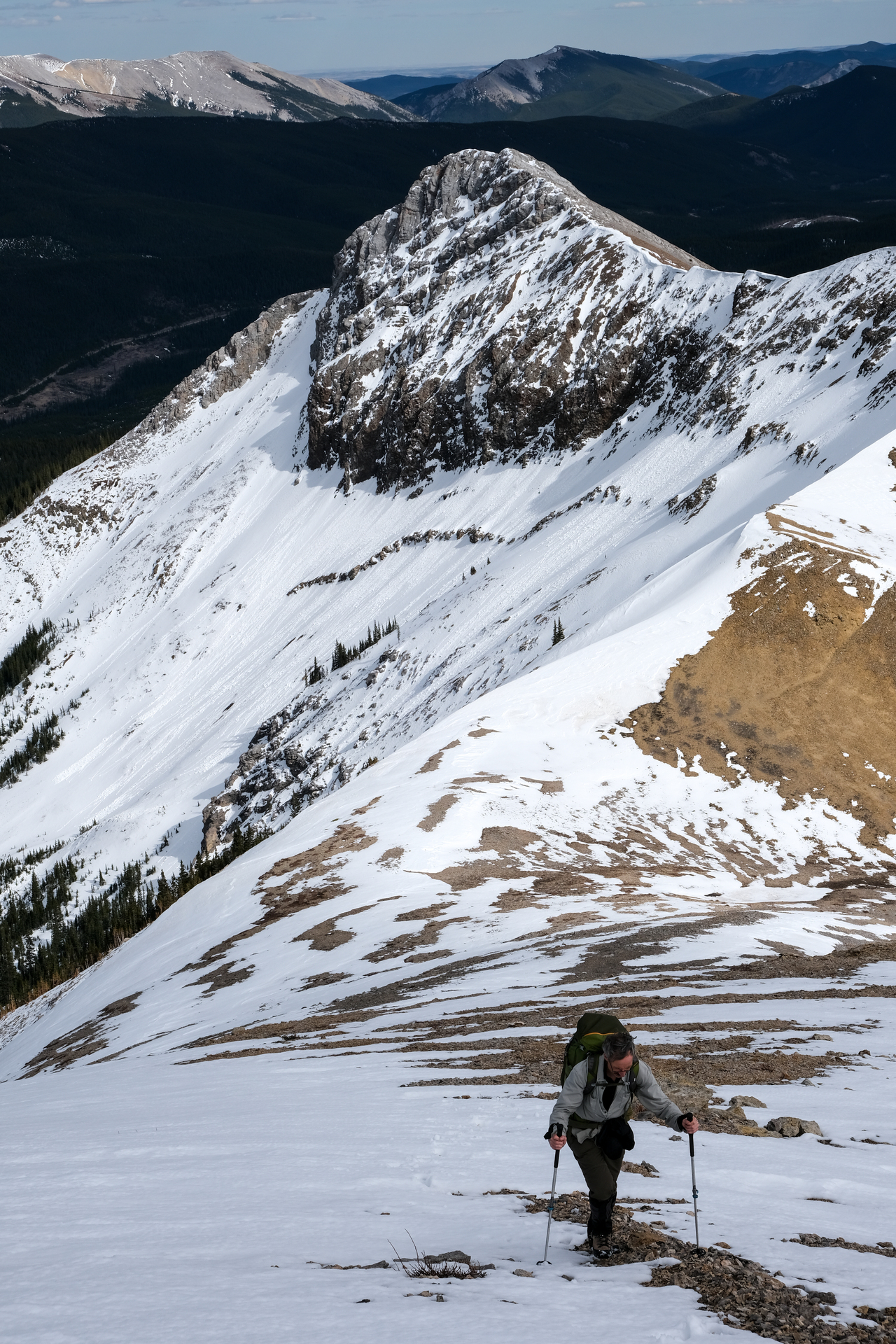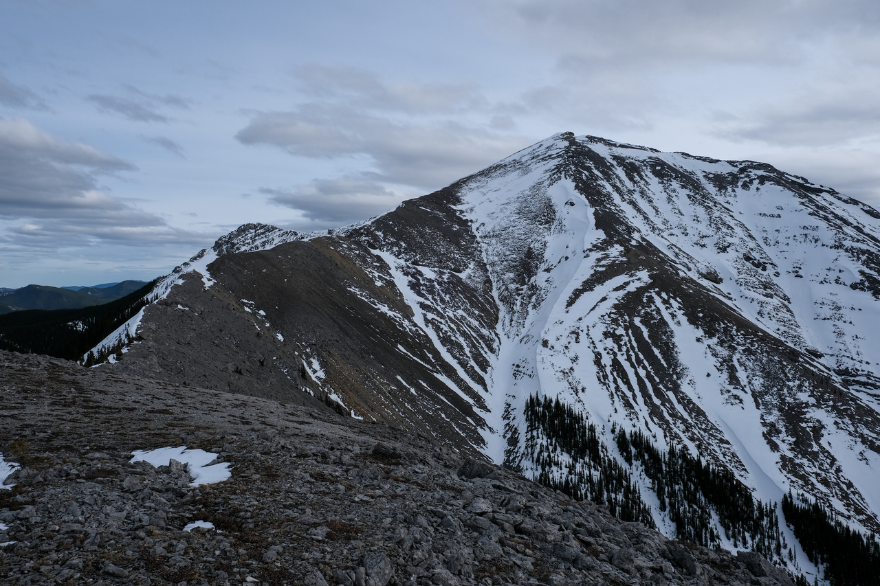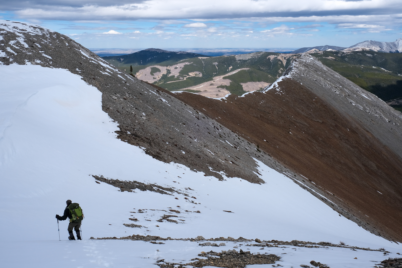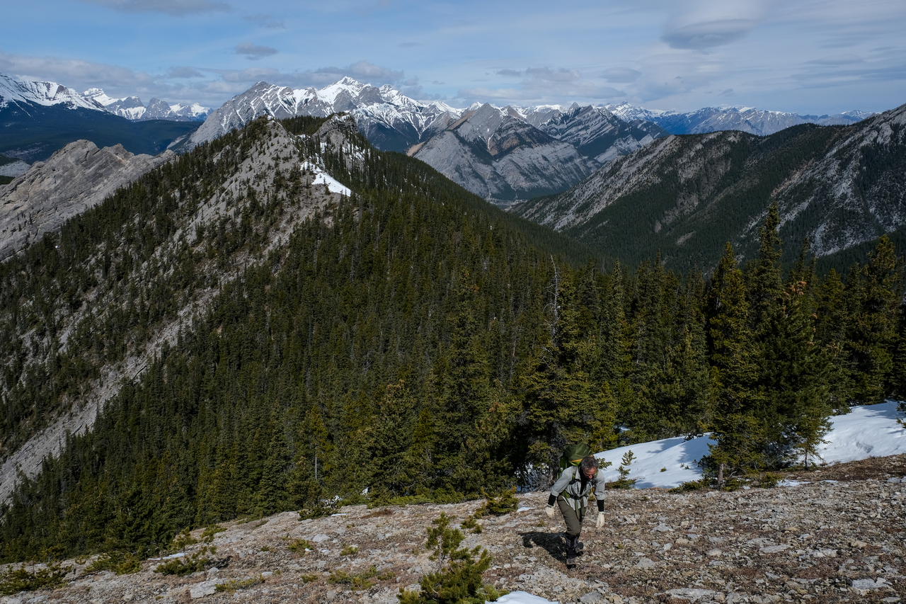 The Kananaskis Range rises in the distance, with the long, paralleling Porcupine and Wasootch Ridges in the foreground (left). The wide drainage, where we began our day, is visible to the right.