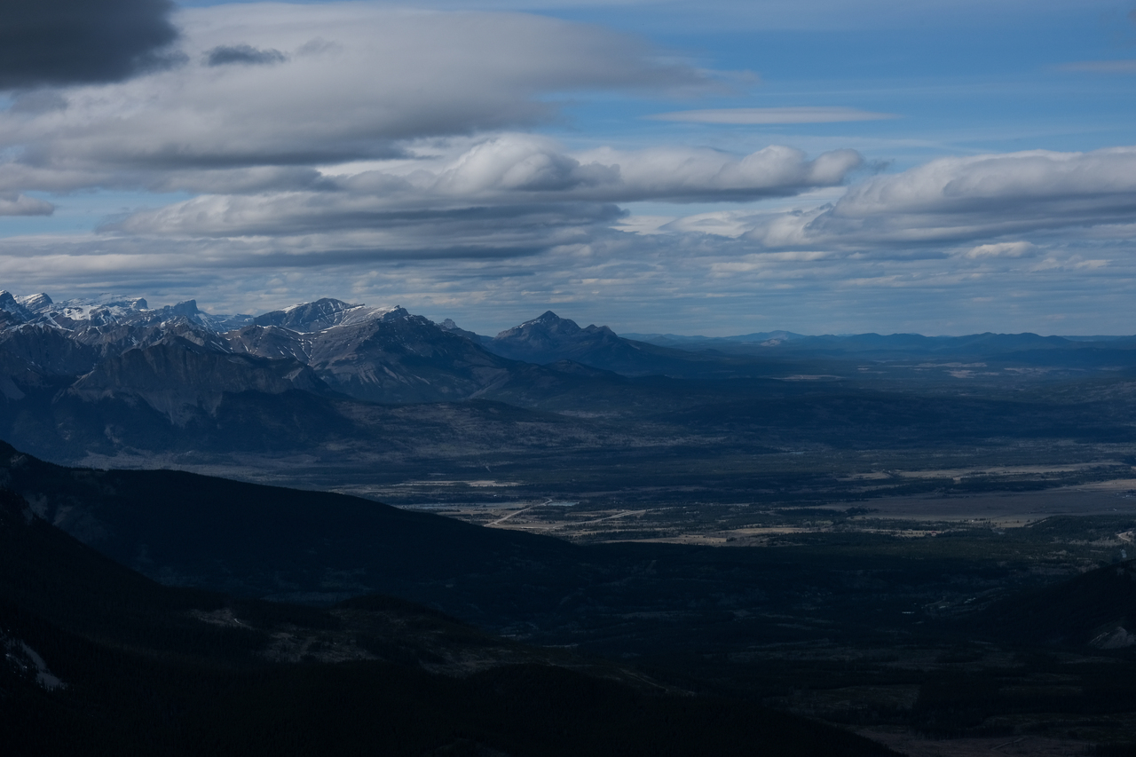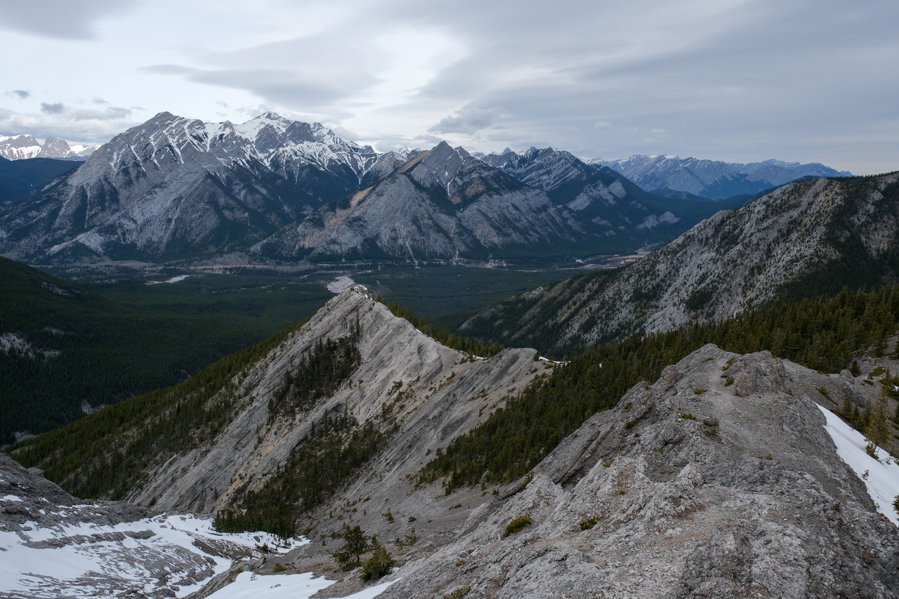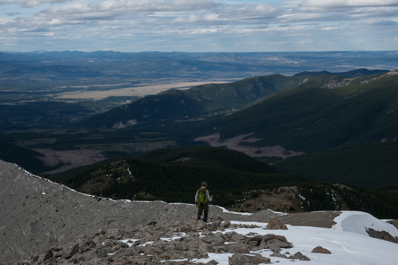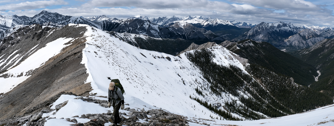 The Kananaskis Range rises in the distance, with the long, paralleling Porcupine and Wasootch Ridges in the foreground (left). The wide drainage, where we began our day, is visible to the right.