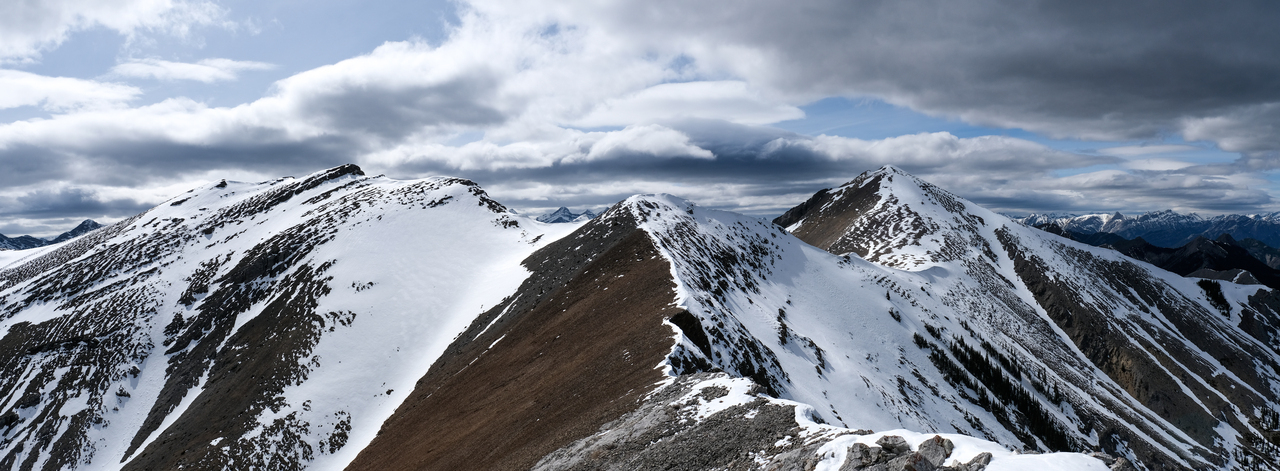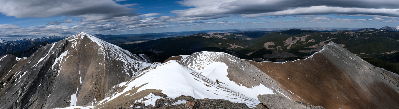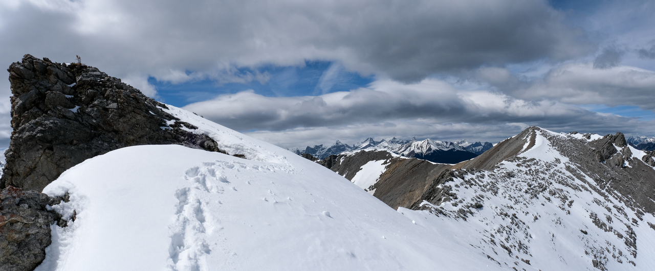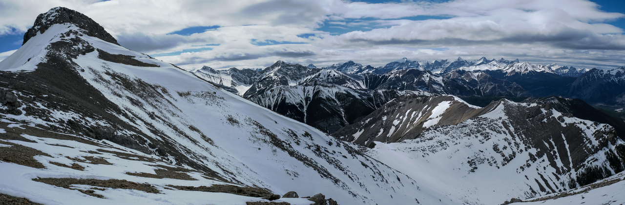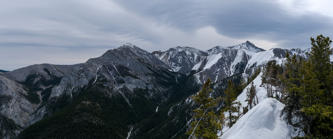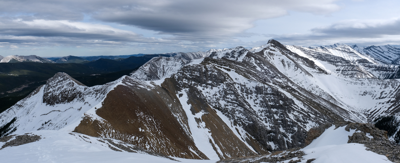 Pano to the west is nearly identical to that of Porcupine Ridge, and includes some of "The Bryants", McDougall, Old Baldy, Kananaskis and Wasootch, with Wasootch Ridge blending in below them.