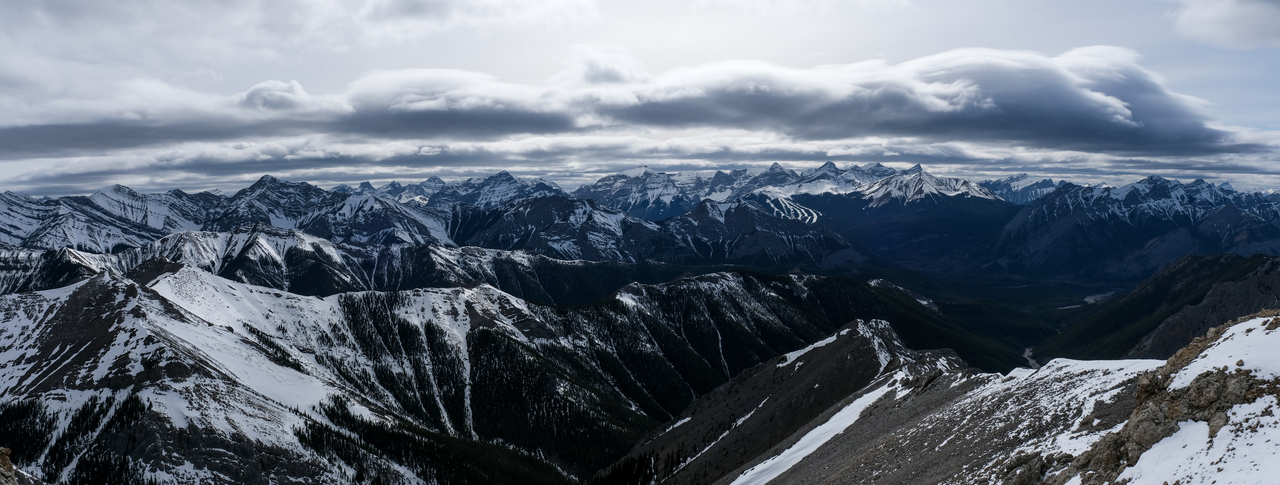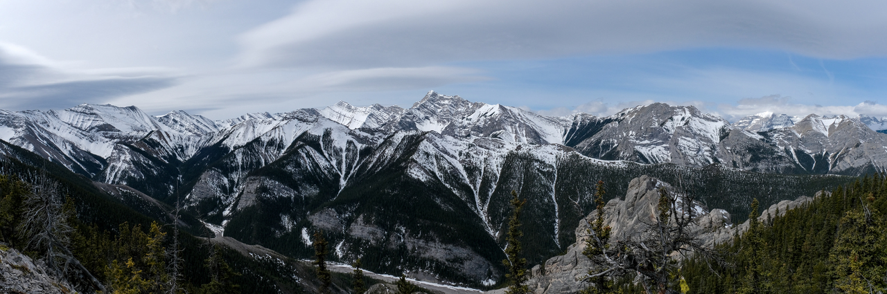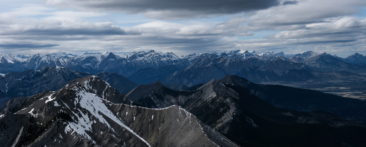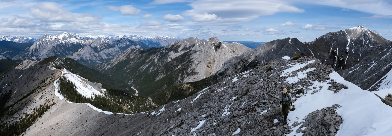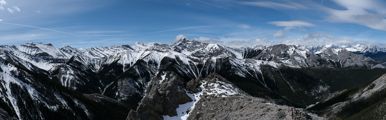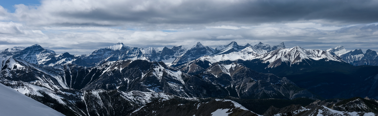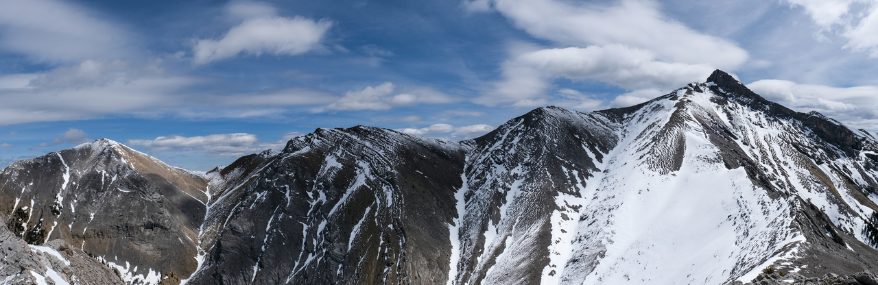 Pano to the west is nearly identical to that of Porcupine Ridge, and includes some of "The Bryants", McDougall, Old Baldy, Kananaskis and Wasootch, with Wasootch Ridge blending in below them.