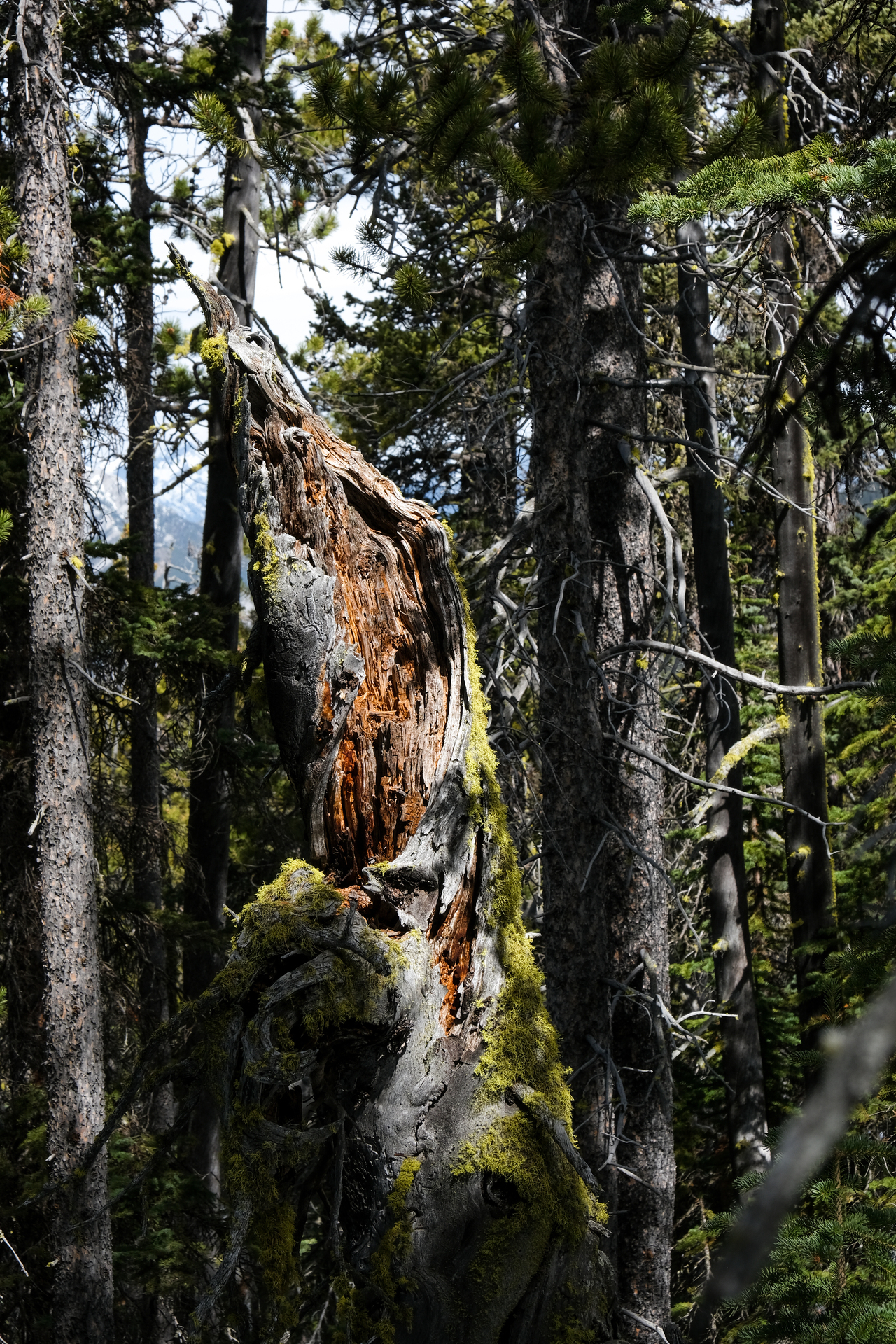 The previously mentioned sunlight illuminates a unique tree stump along the way.
