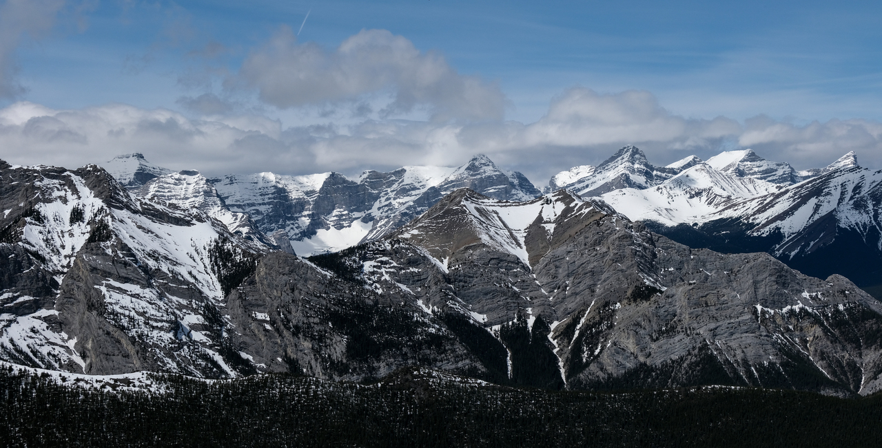 Zooming-in to the aforementioned Kananaskis Range. Visible are, Fortress, Gusty, Galatea, Kidd, Bogart, Ribbon, and Sparrowhawk!