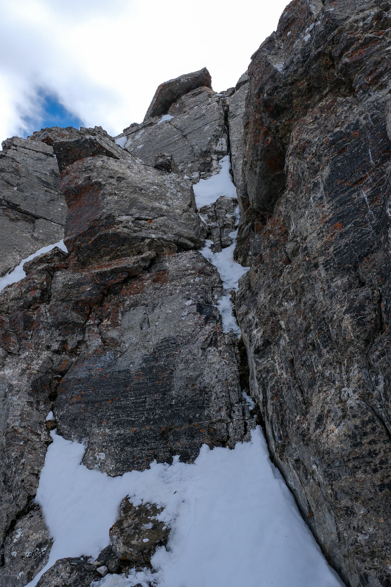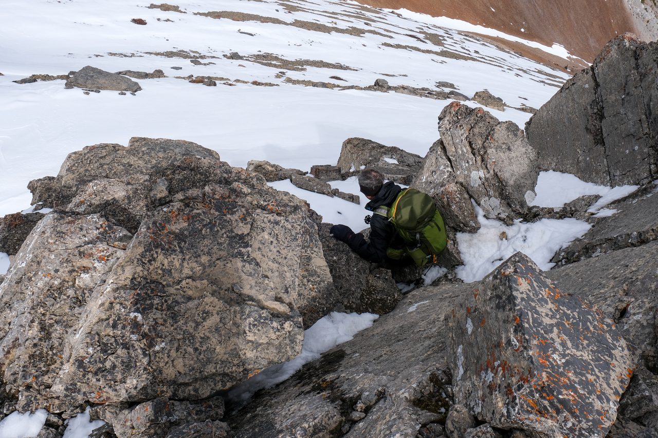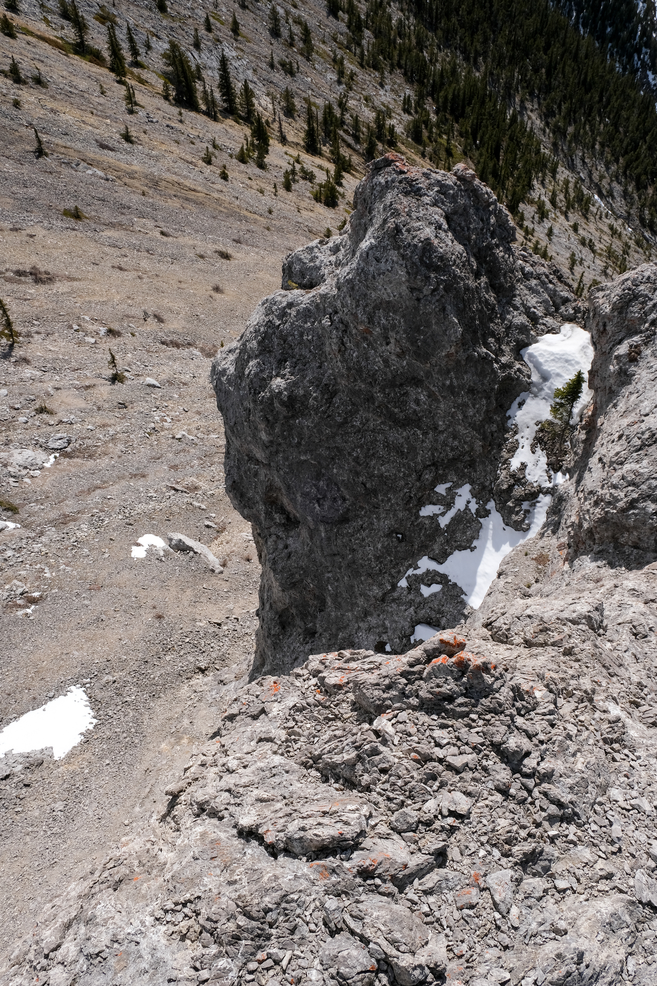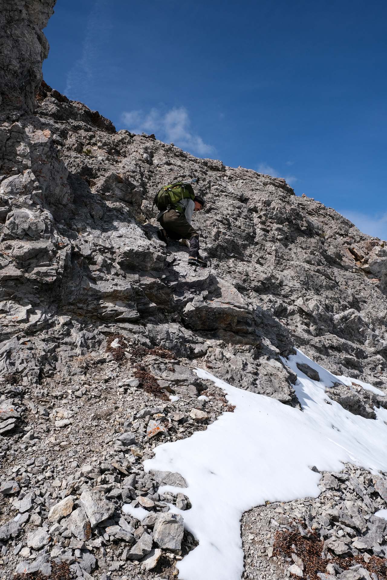 The descent gully we chose (between the two "summit blocks") was quite steep, and required some moderate downclimbing to avoid some slick, lingering snow patches.