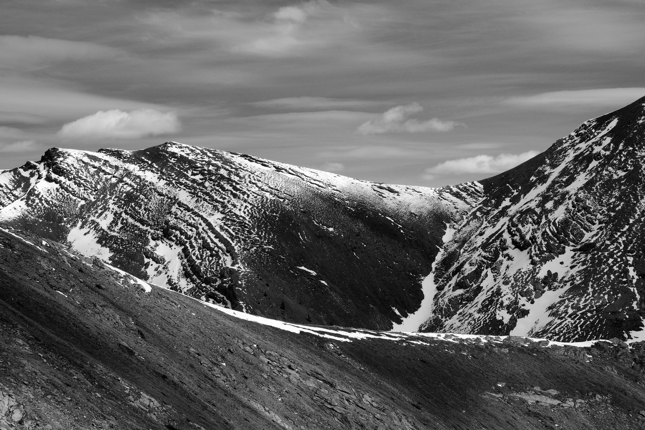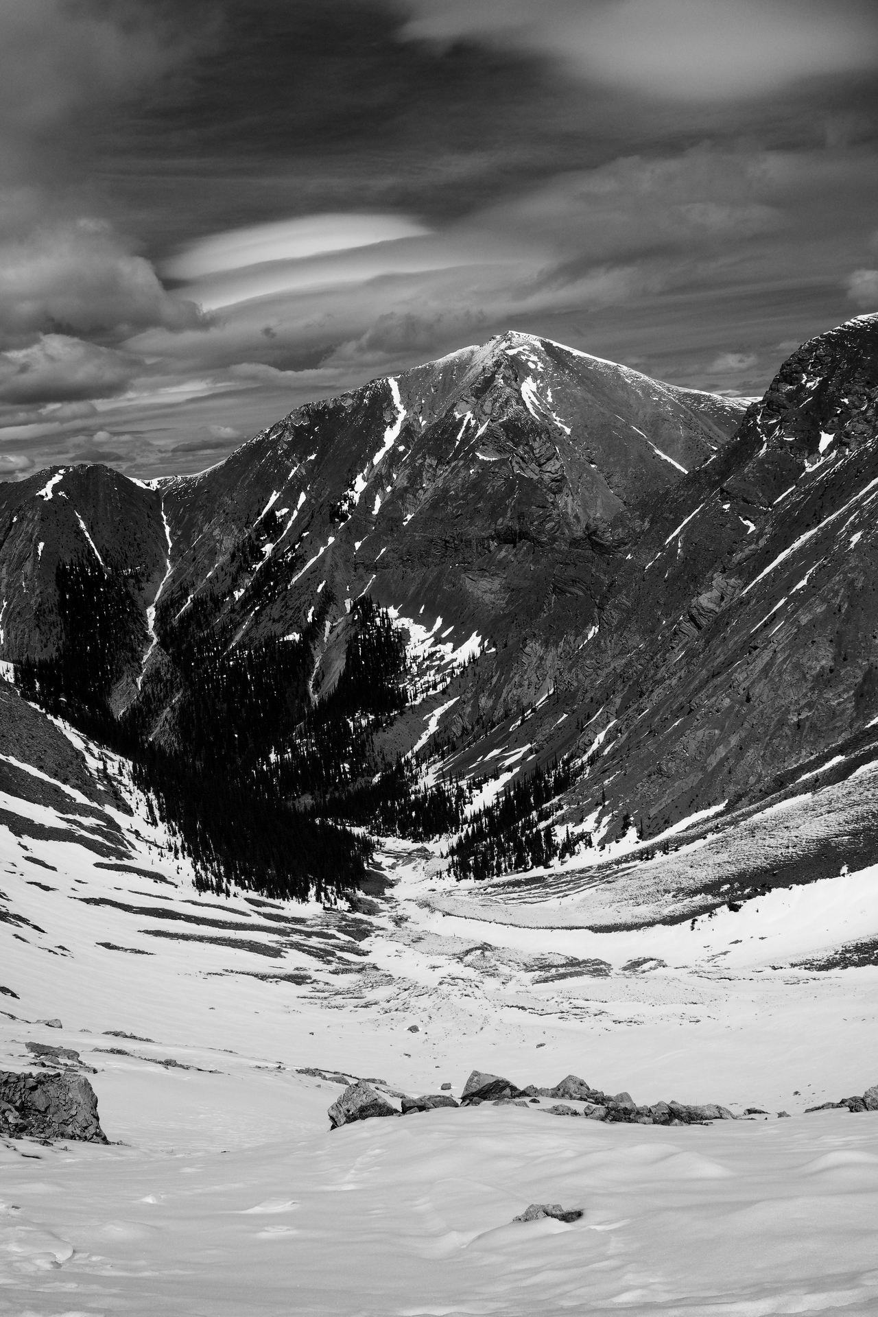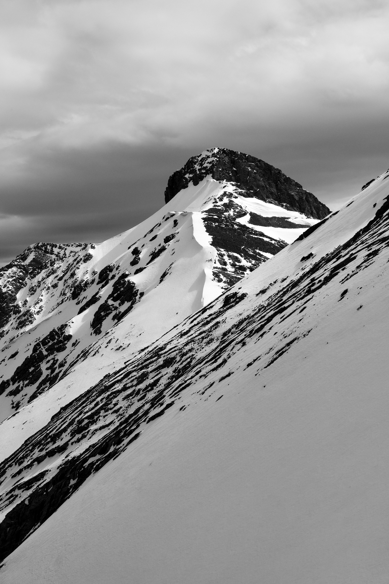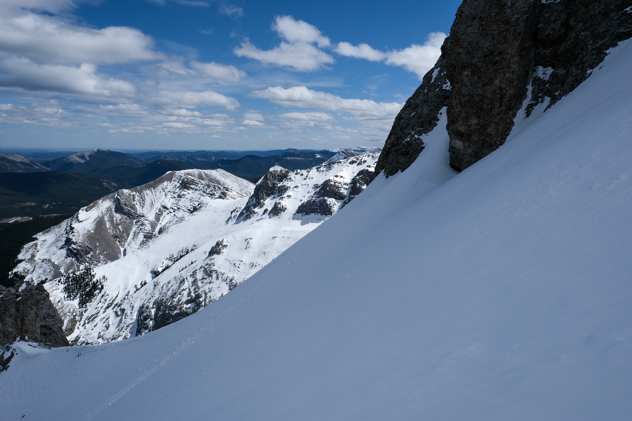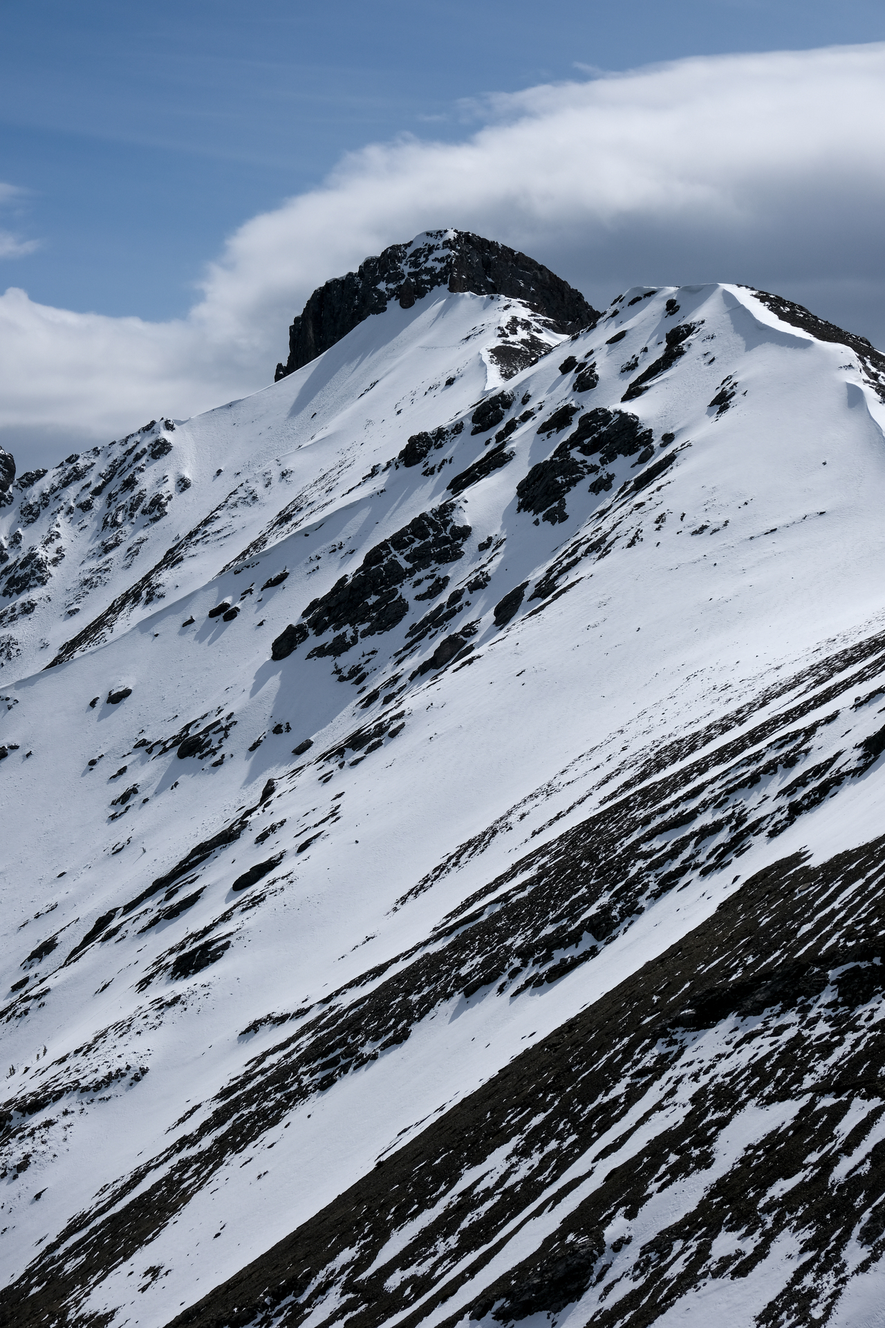 Boundary Peak rises beyond a wide, snowy chute, leading to the drainage below. (Note the interesting clouds above!)