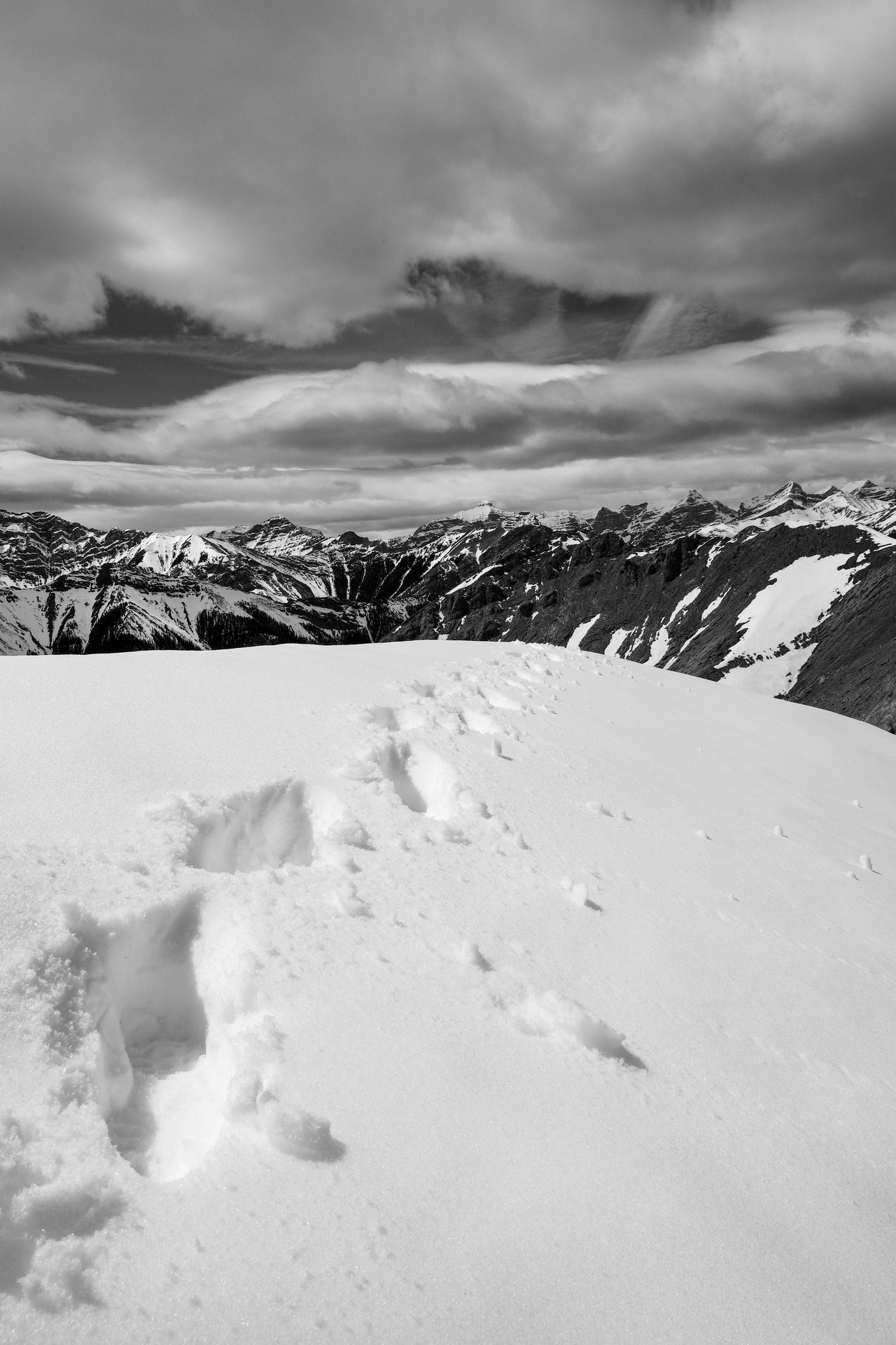 Looking back to the traverse. Note the tracks venturing a short ways before ending abruptly. We noticed a small group returning down the ridge ahead of us, and concluded that they'd also planned on scrambling up Tiara, but came to the same conclusion as us.