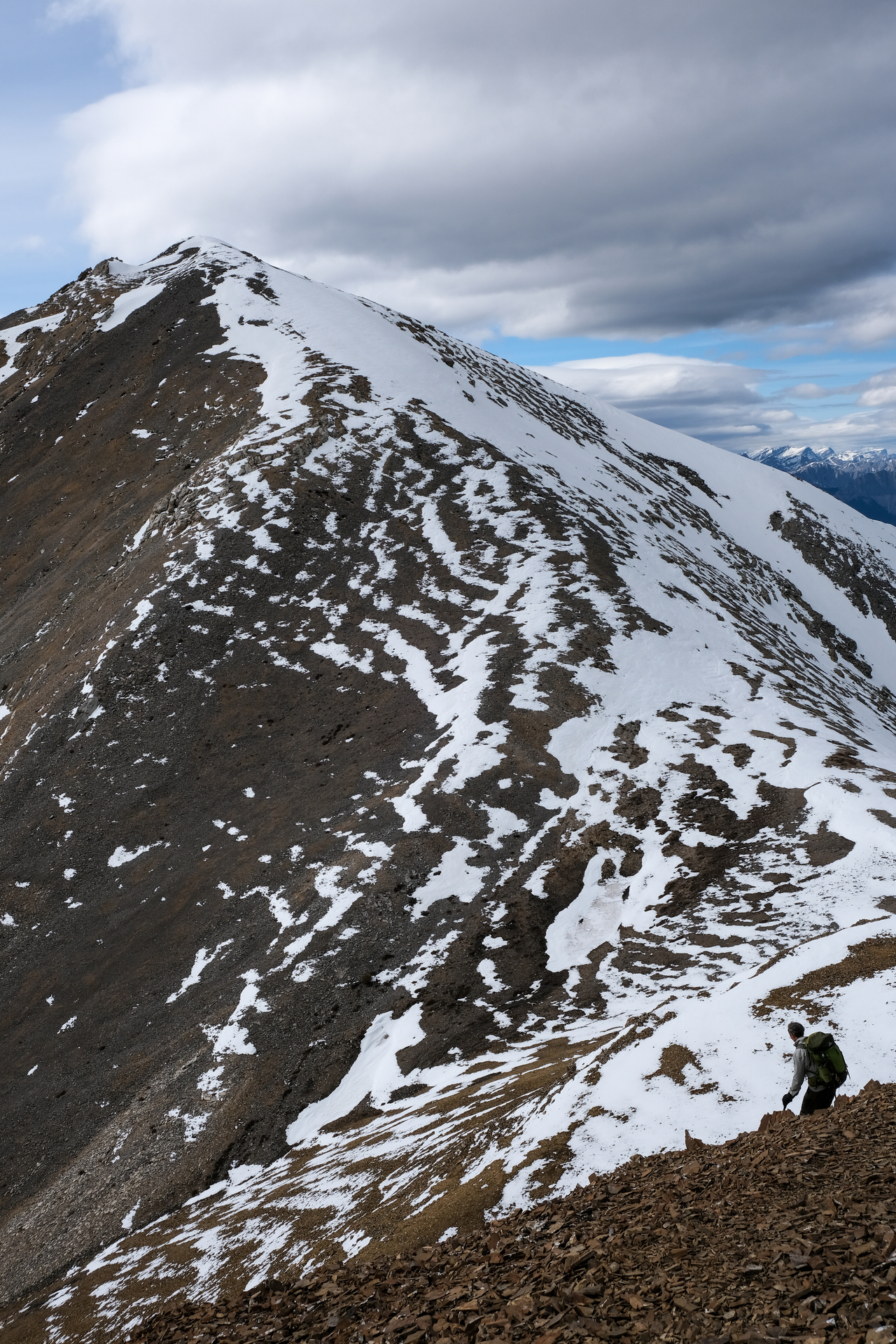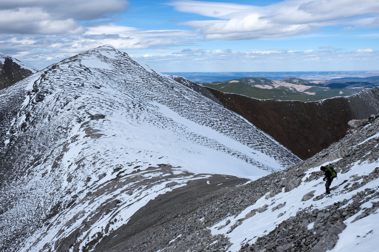Walking along the summit of Boundary Ridge, with a unique view of Midday (left) and Midnight (right) beyond. Both can be bagged as part of this loop (as described in Vern's trip report), but since we knocked them off back in March, we had no need to gain multiple hundred more meters, and instead looked for a place to descend to the drainage below (west).