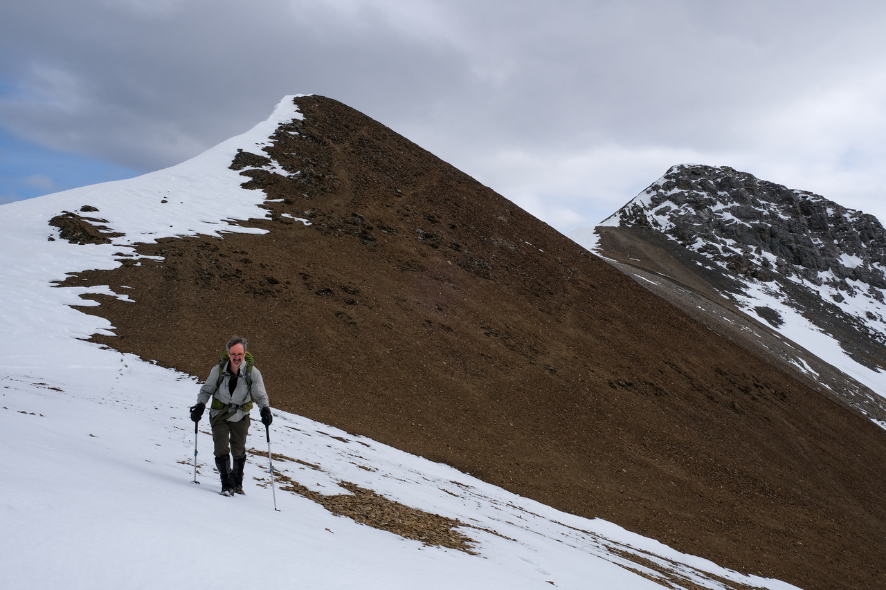 Making the final steps along the summit ridge, with the ridge we just ascended to the left.