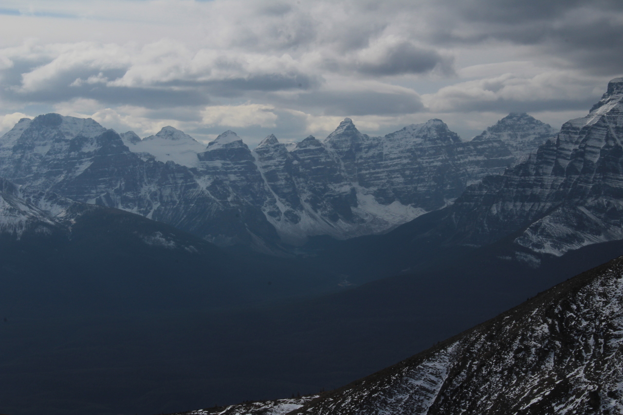 The same group of eight from The Valley of Ten Peaks (that we saw from Lipalian) tower above the barely visible Moraine Lake!