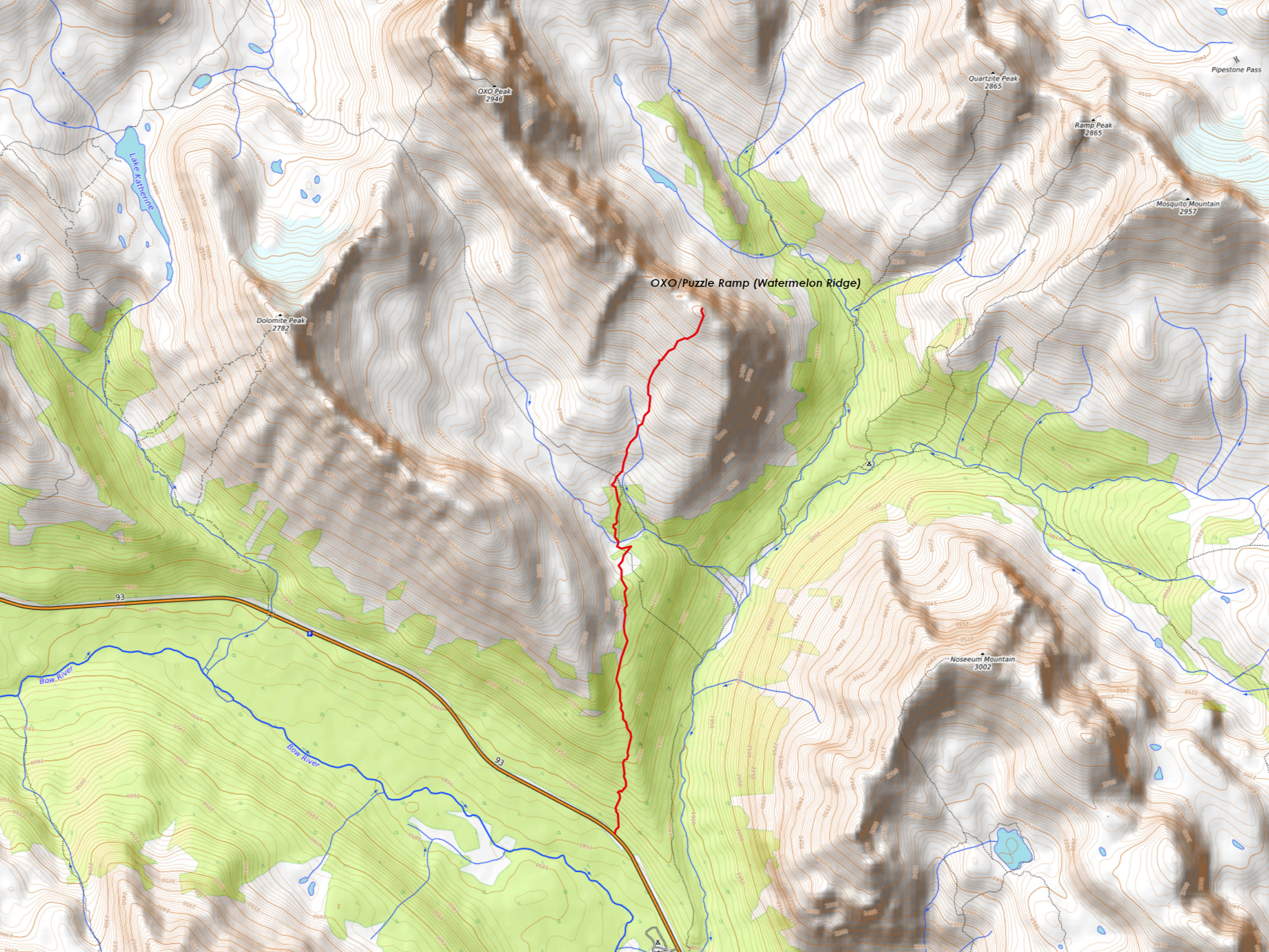 Tuesday's stormy weather found my dad and I lapping Observation's lower SW slopes, and while the ski conditions were great fun, the whiteout that we found ourselves in for most of the day left something to be desired. While the forcast wasn't looking the most promising for the following day, the sky was slowly starting to clear as we hunkered down for the night and I fell asleep hoping the weather would hold up enough for us to go for a summit the next day. My wish came true, and Wednesday morning dawned crisp and clear, with not a cloud in the sky! To say I was a little bit excited would be a major understatement! I immediately had my nose deep in my phone's topo map, in search of a ski objective that would benefit from this major improvement in weather, and the skier's summit of OXO/Puzzle Peak (aka Watermelon Ridge) - the furthest peak on the southeastern end of the impressive OXO Peak "wedge" - immediately stood out thanks to its ramp-like ascent slopes (perfect for a ski descent), its SW aspect (same aspect as Observation where we found great turns the previous day), and its prime location, smack dab in the middle of the Mosquito Creek valley (a beautiful area I'd never visited before)!