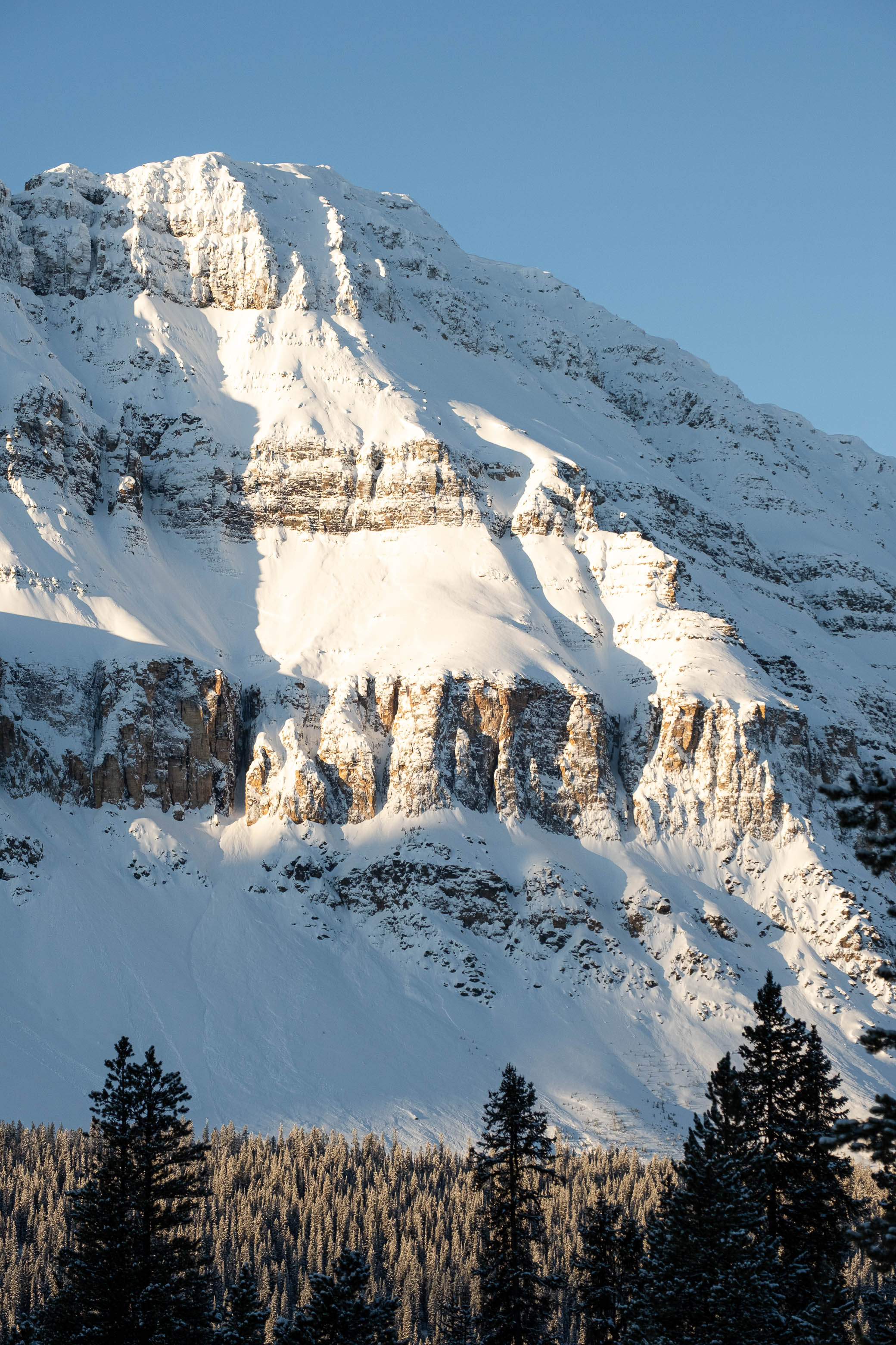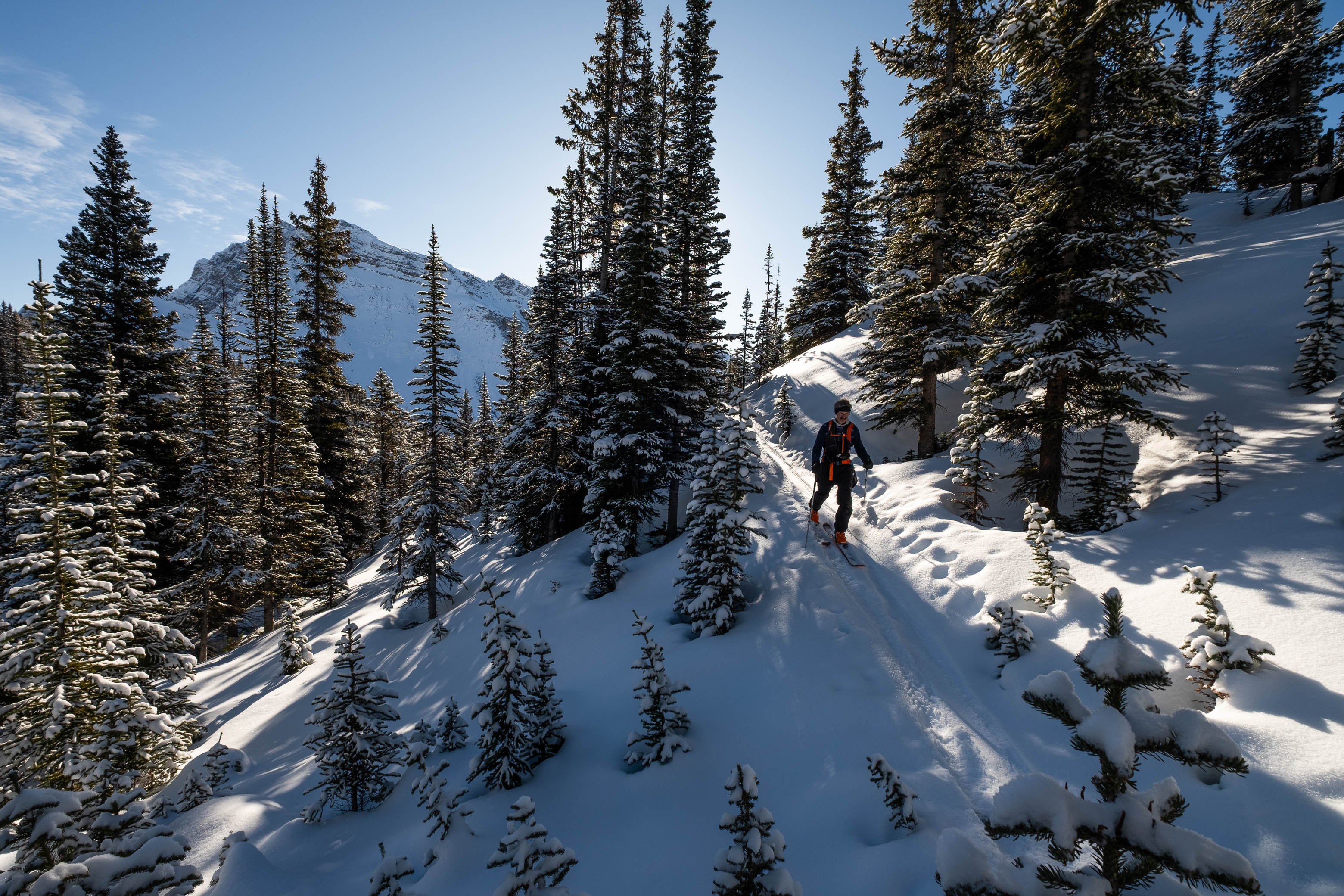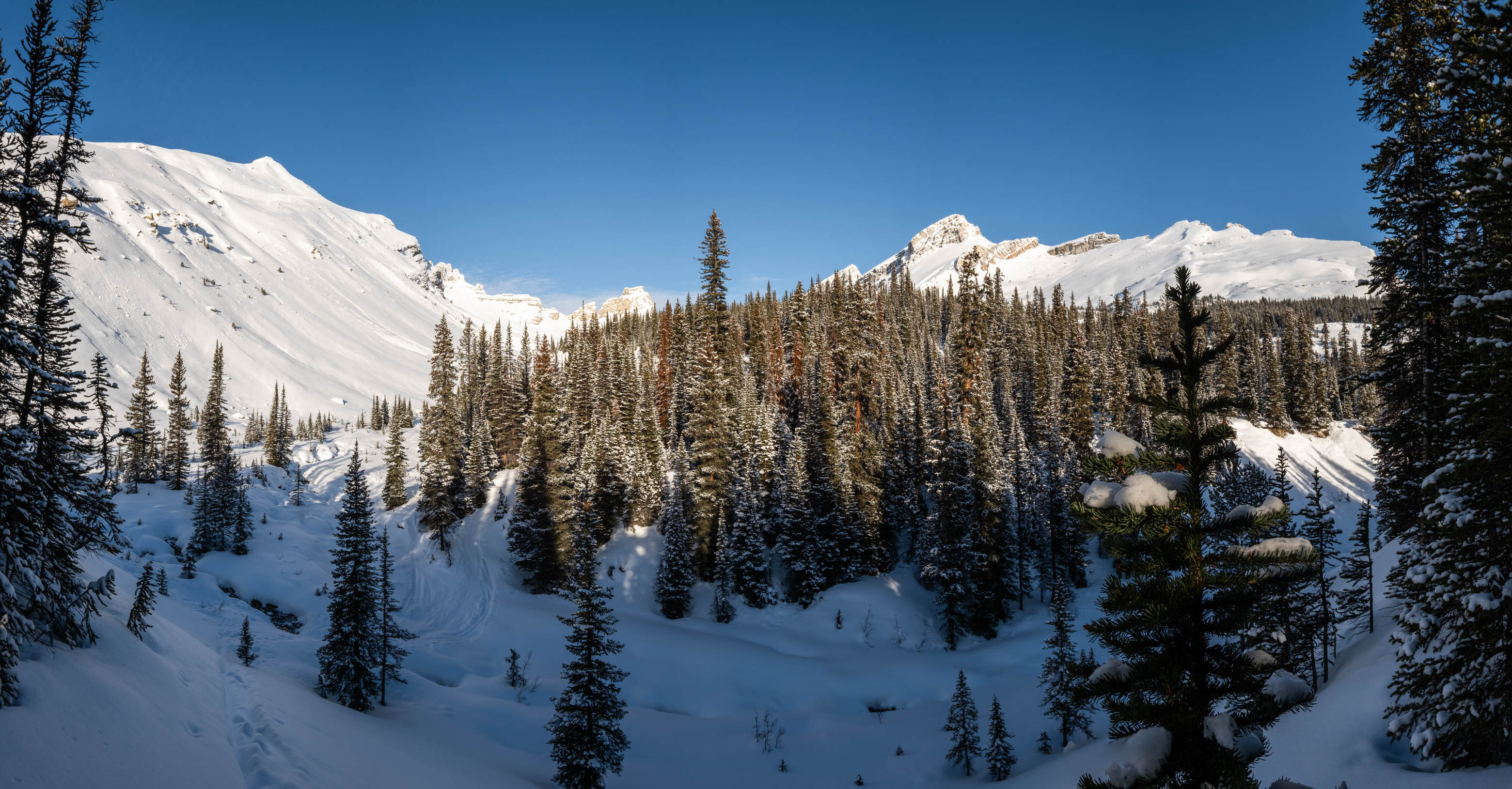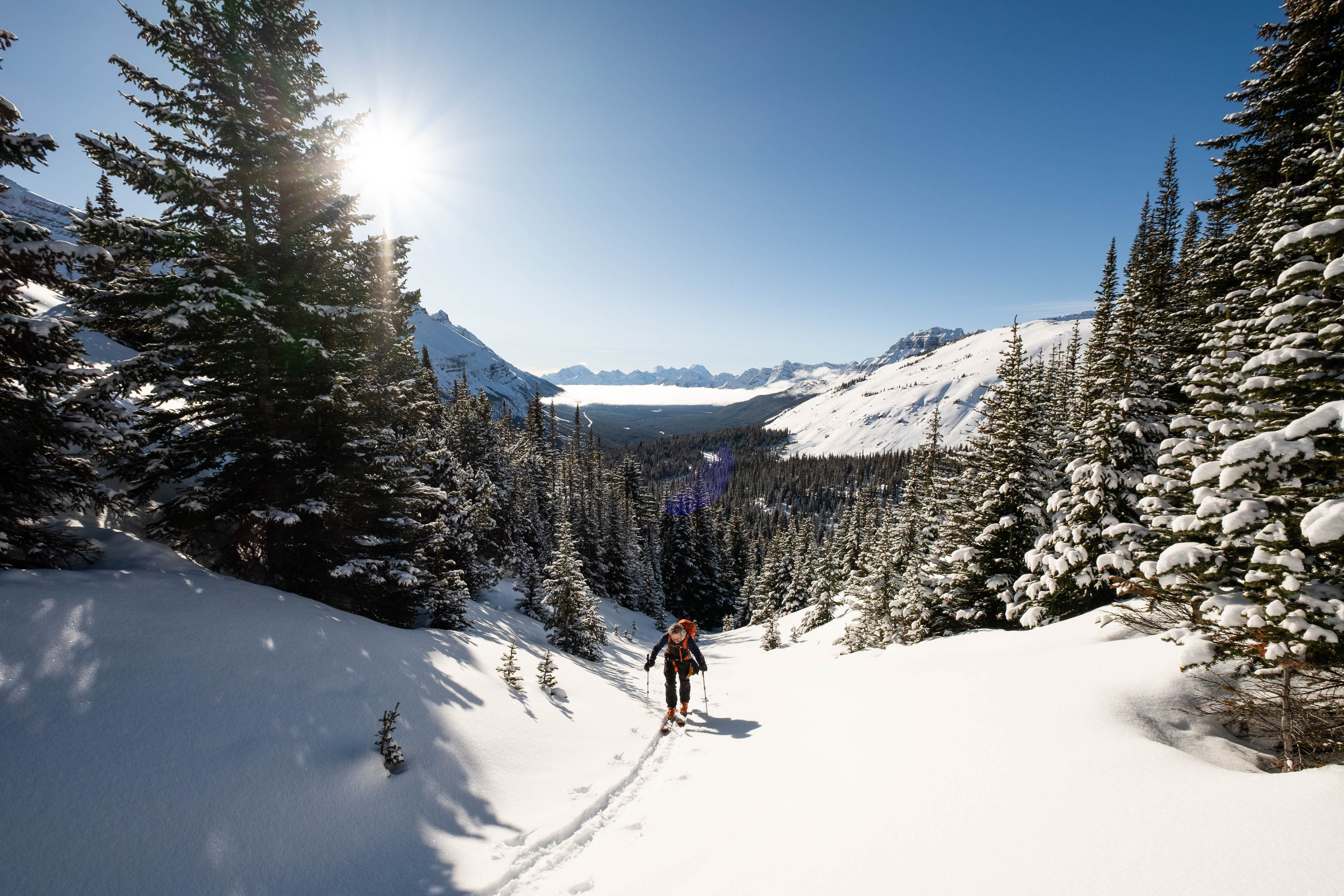 We got lucky with a freshly plowed Icefields Parkway and were easily able to park on the wide shoulder where we noticed some ski tracks entering - and exiting - the forest. (Note that this route is not the same as the summer route up Mosquito Creek and starts about 1 km north of the Mosquito Campground turn-off.) It was an absolutely perfect morning as we geared up for the day, with beautiful sunlight just starting to illuminate Bow Peak's snowy east face across the highway, and I have to admit, I was a little bit disappointed we already had to leave these views behind as we started up into the dense forest.