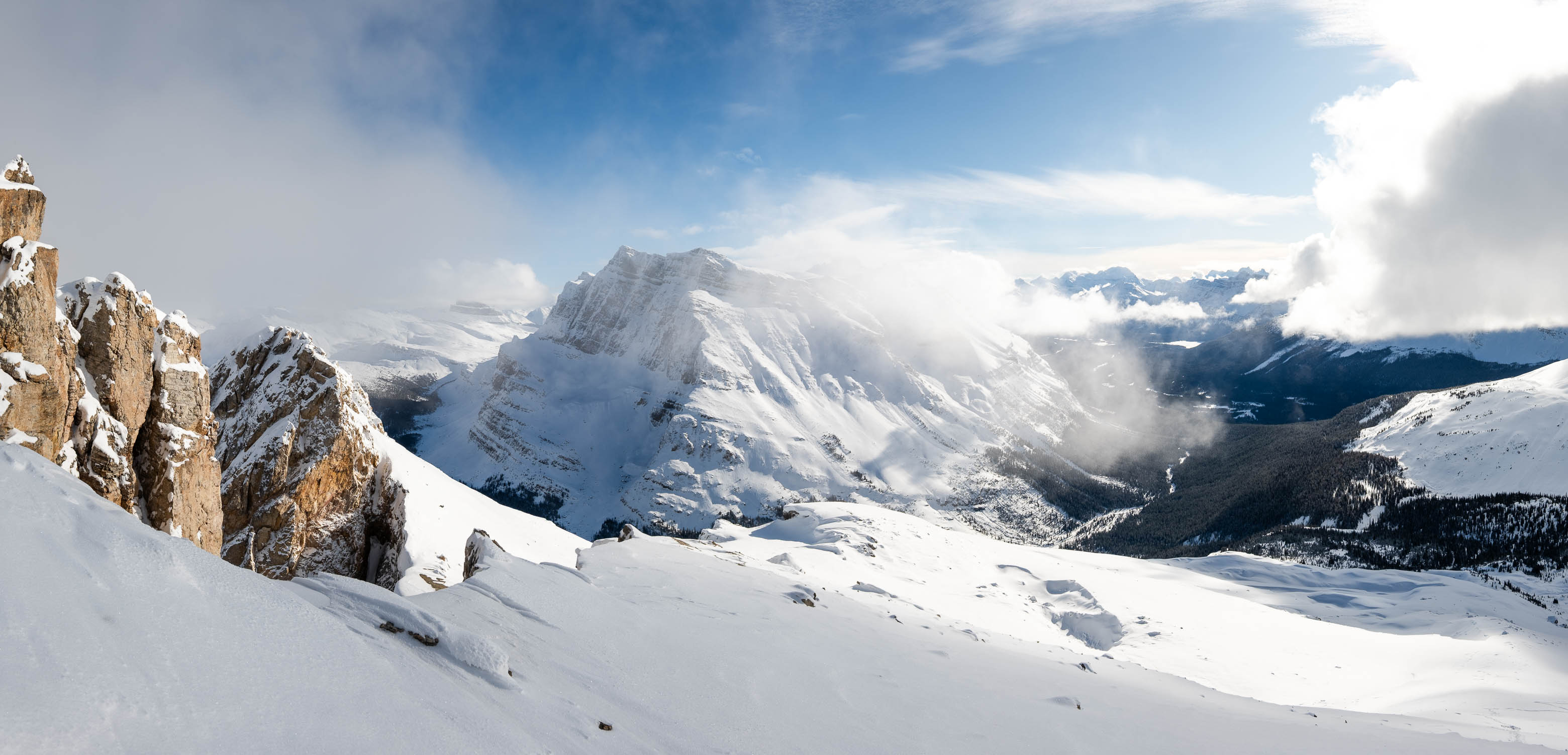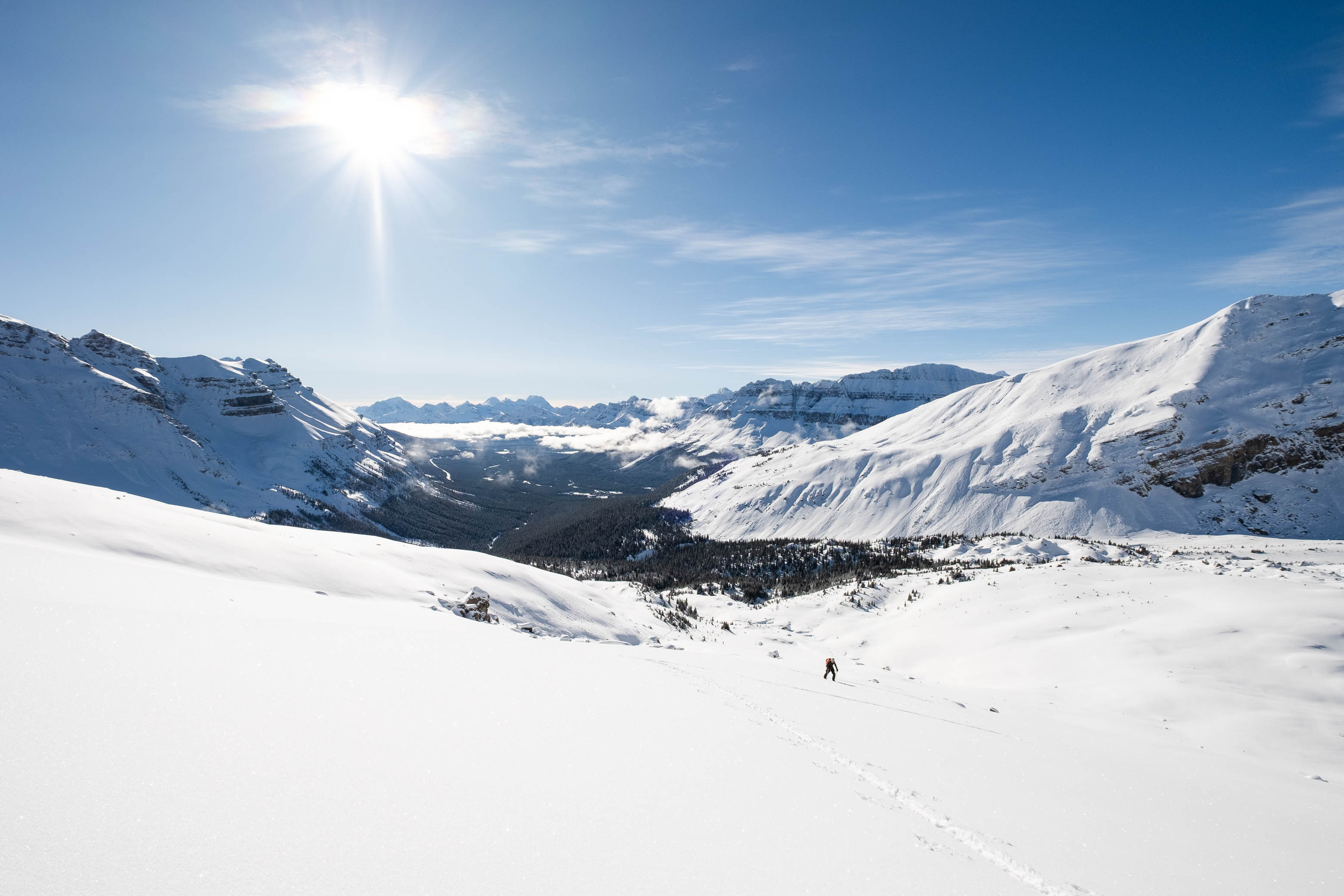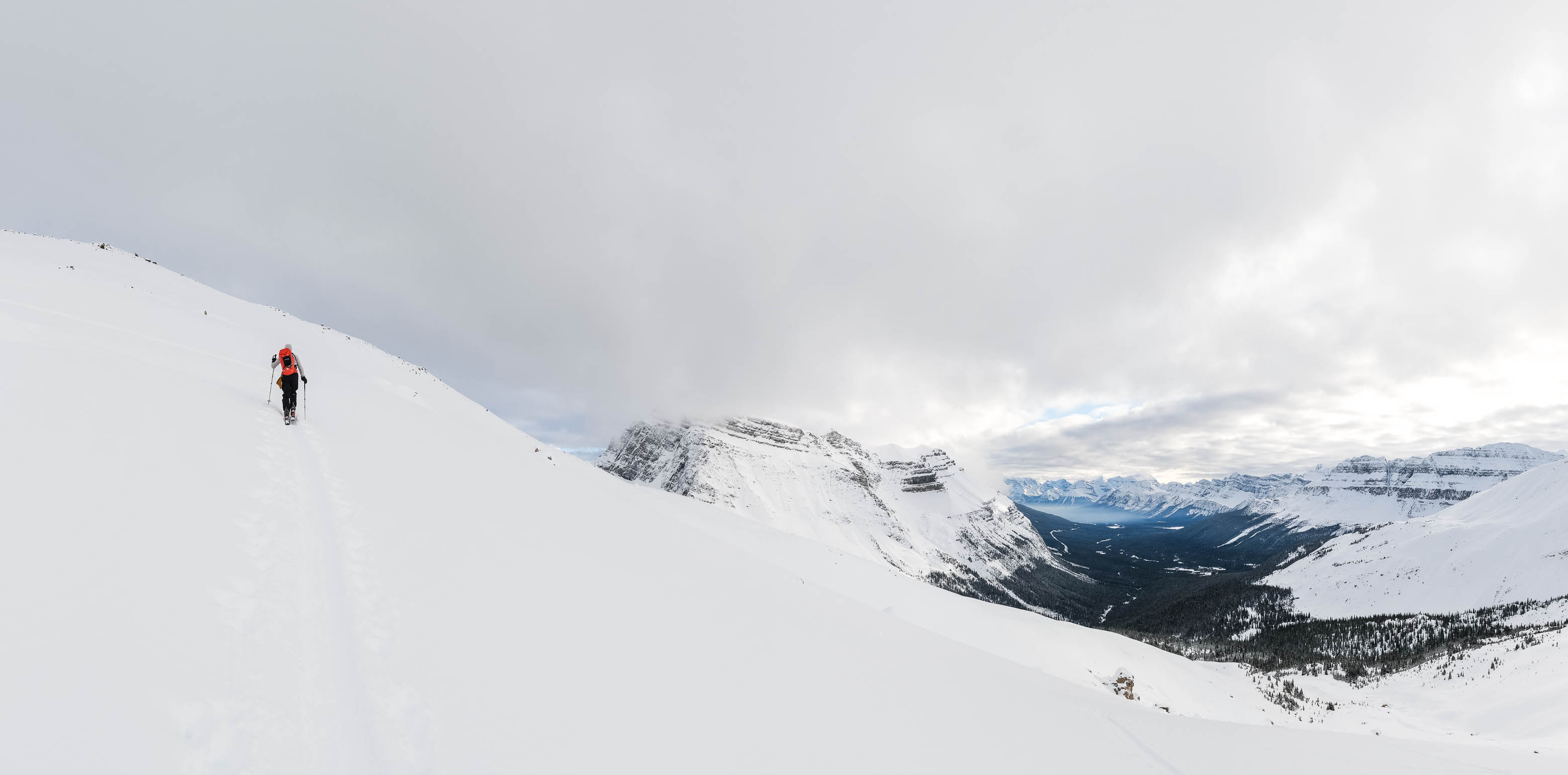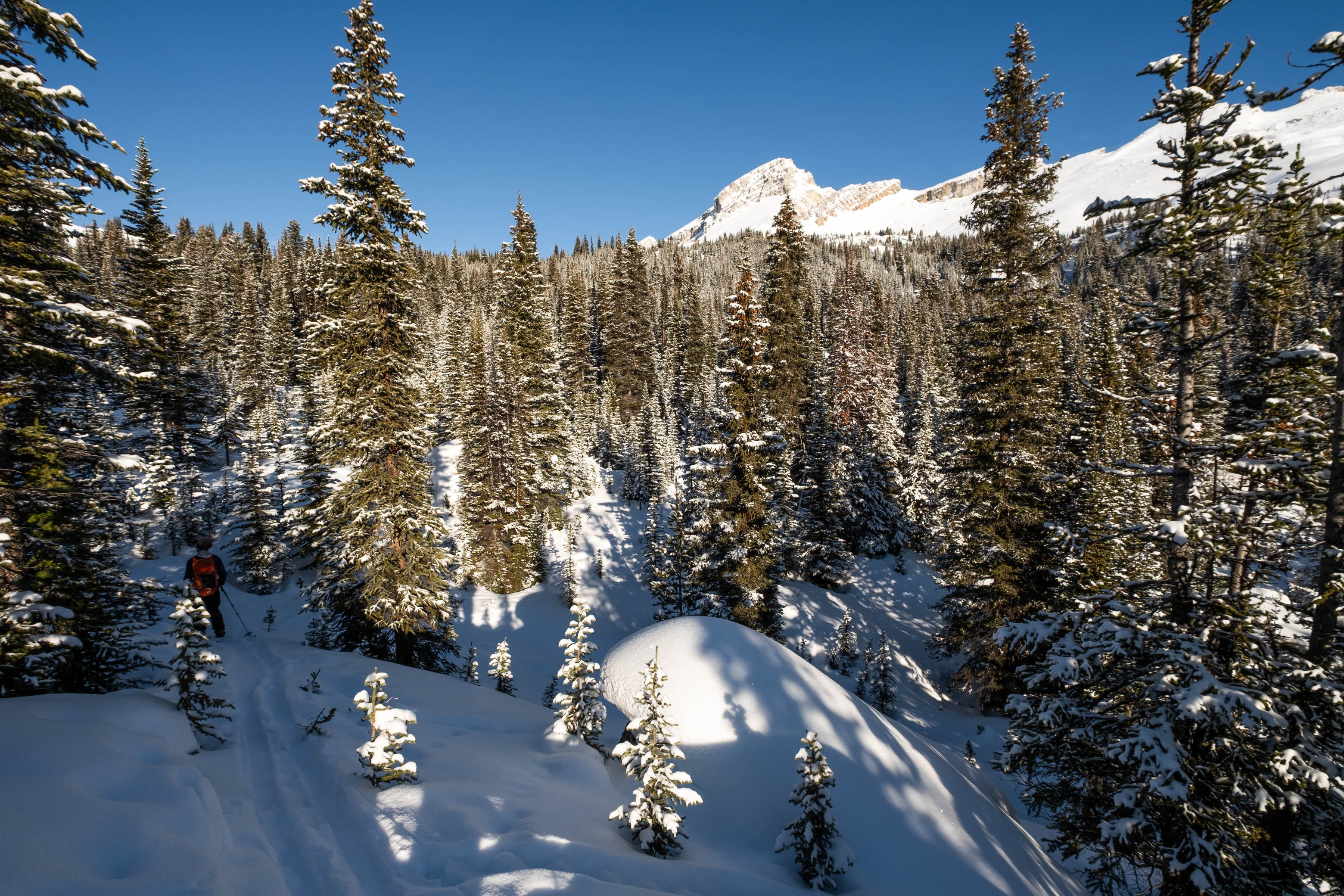 The views opened up spectacularly behind us as we broke into the alpine, with the distant Lake Louise group rising over a partial inversion in the valley, Noseeum's west face towering across Mosquito Creek, and a deep blue sky overhead! This was shaping out to be one of those magical winter days you don't forget!