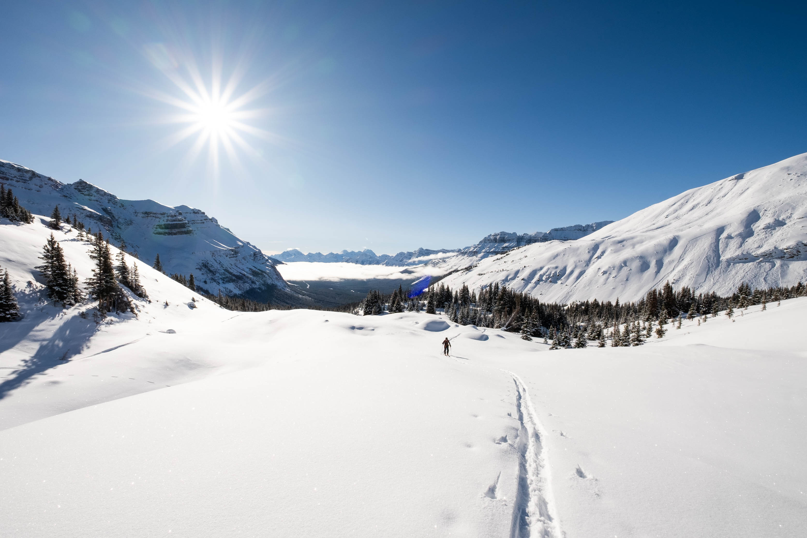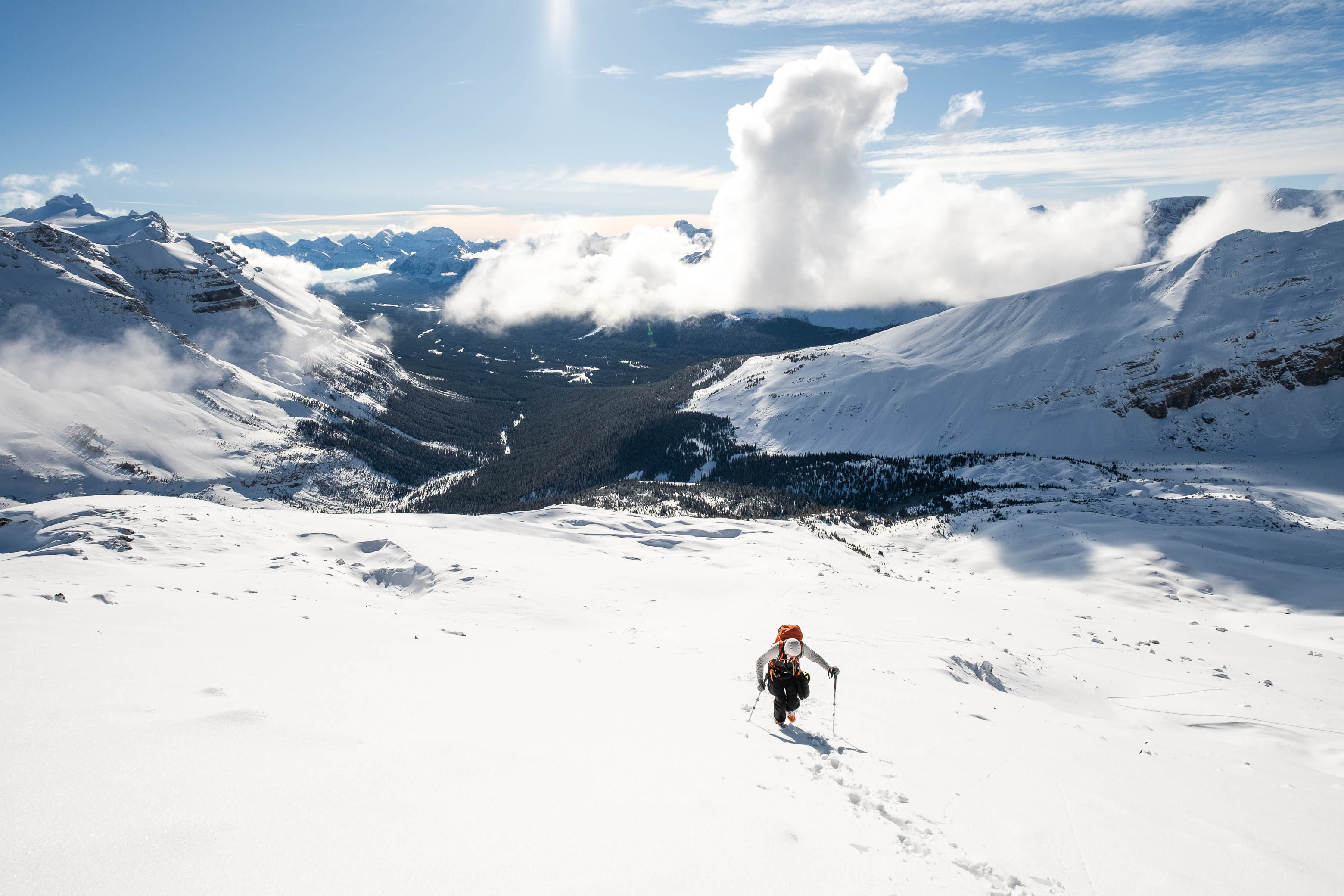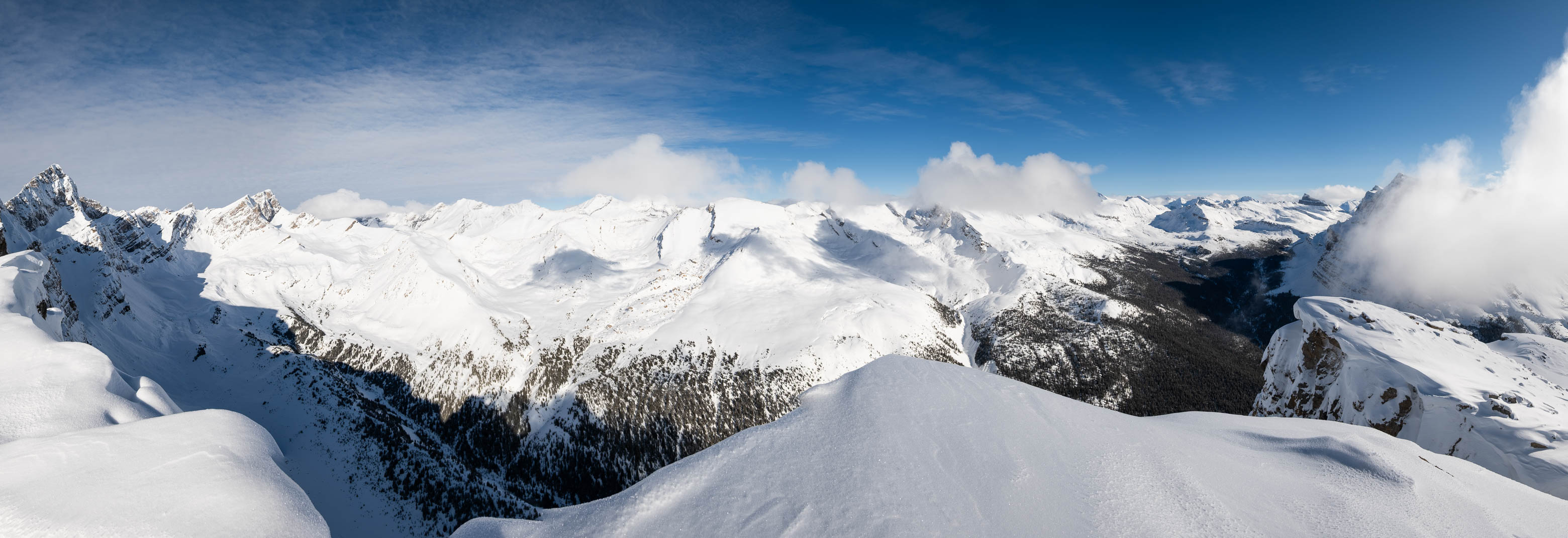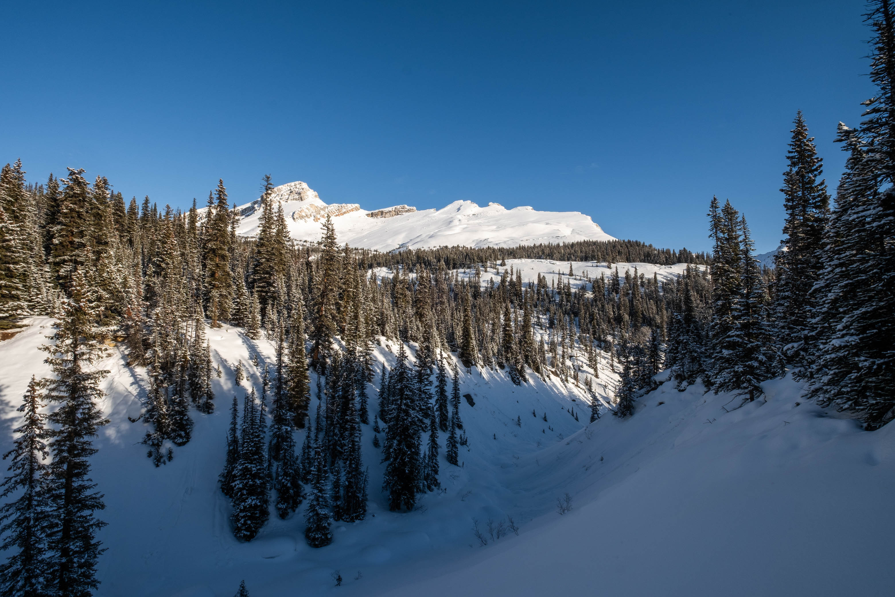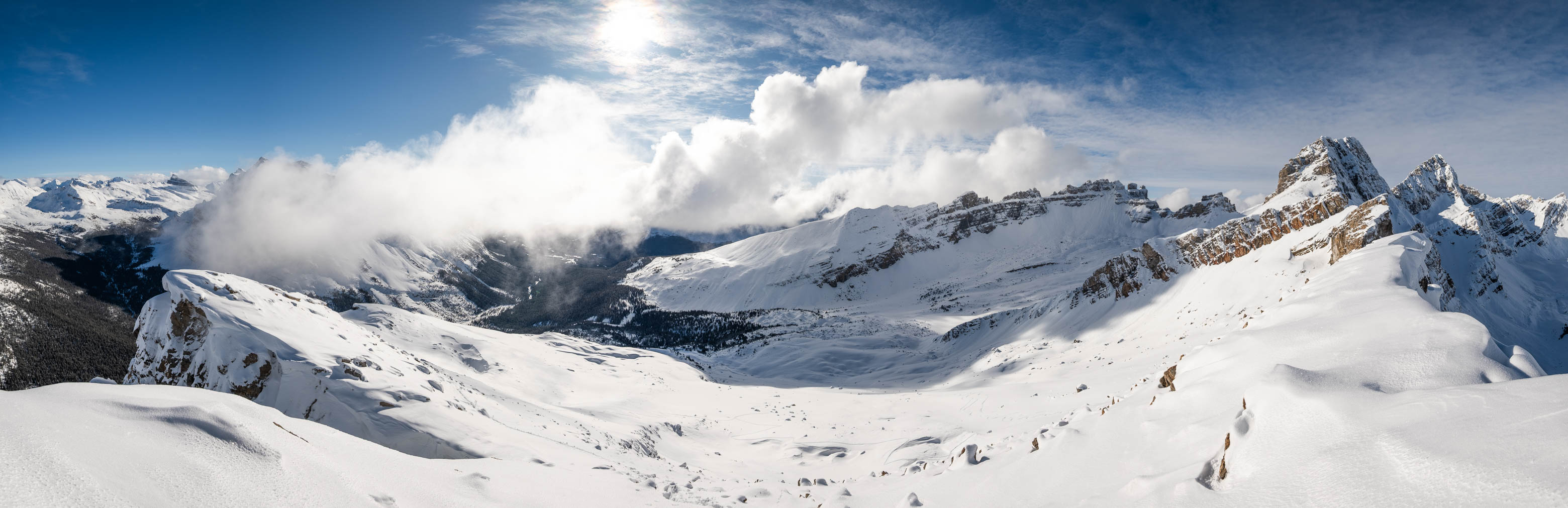 The views opened up spectacularly behind us as we broke into the alpine, with the distant Lake Louise group rising over a partial inversion in the valley, Noseeum's west face towering across Mosquito Creek, and a deep blue sky overhead! This was shaping out to be one of those magical winter days you don't forget!