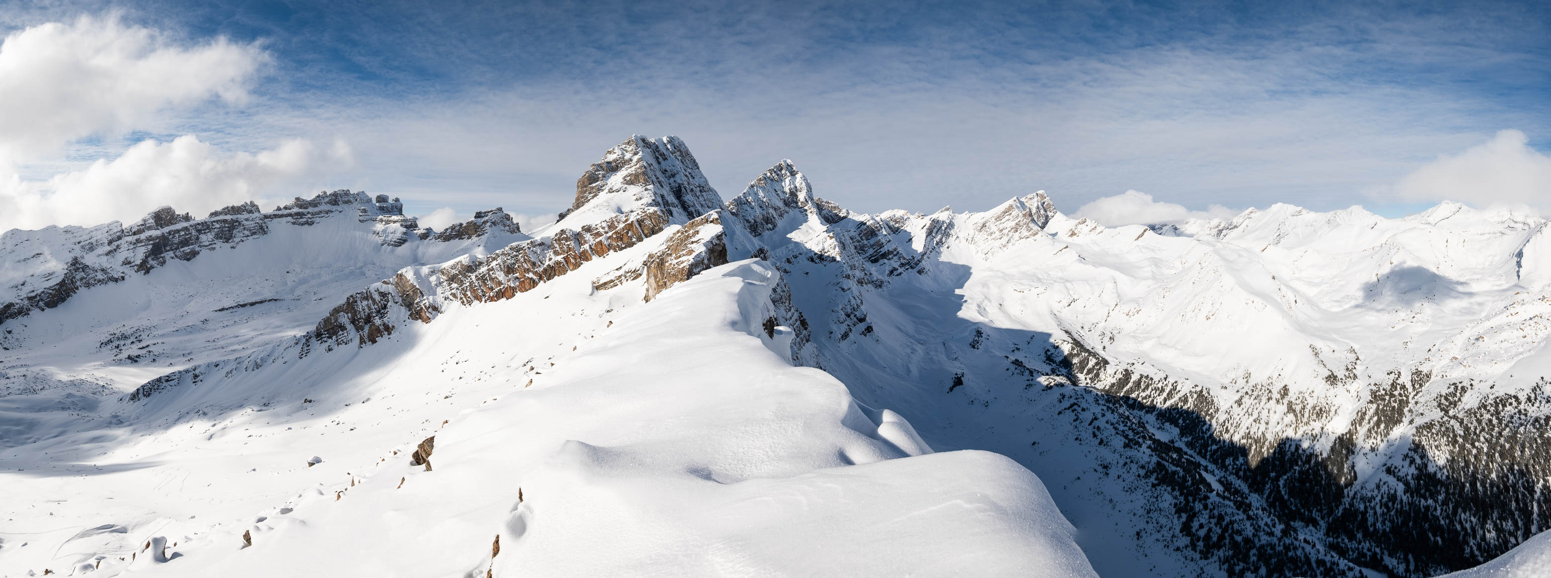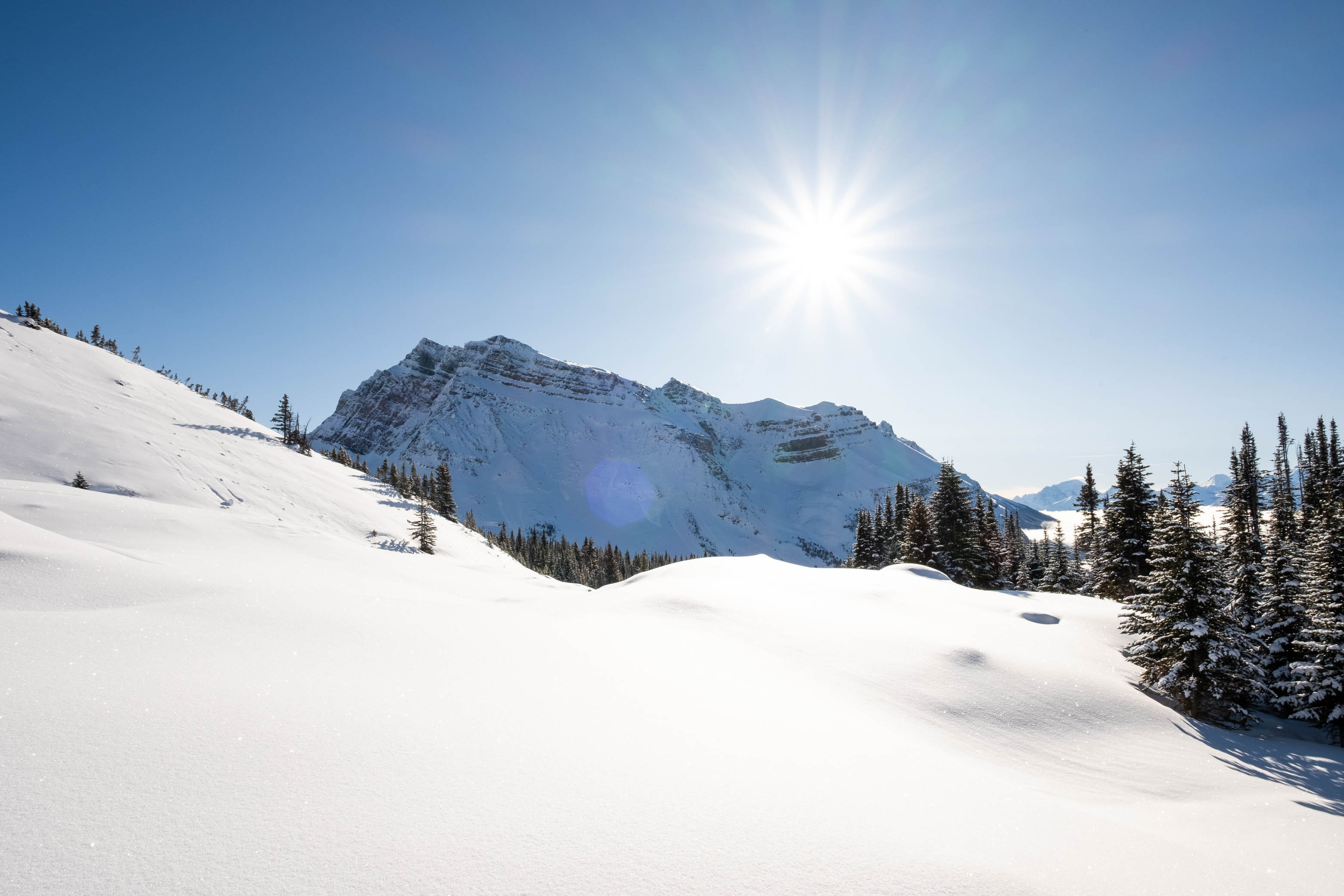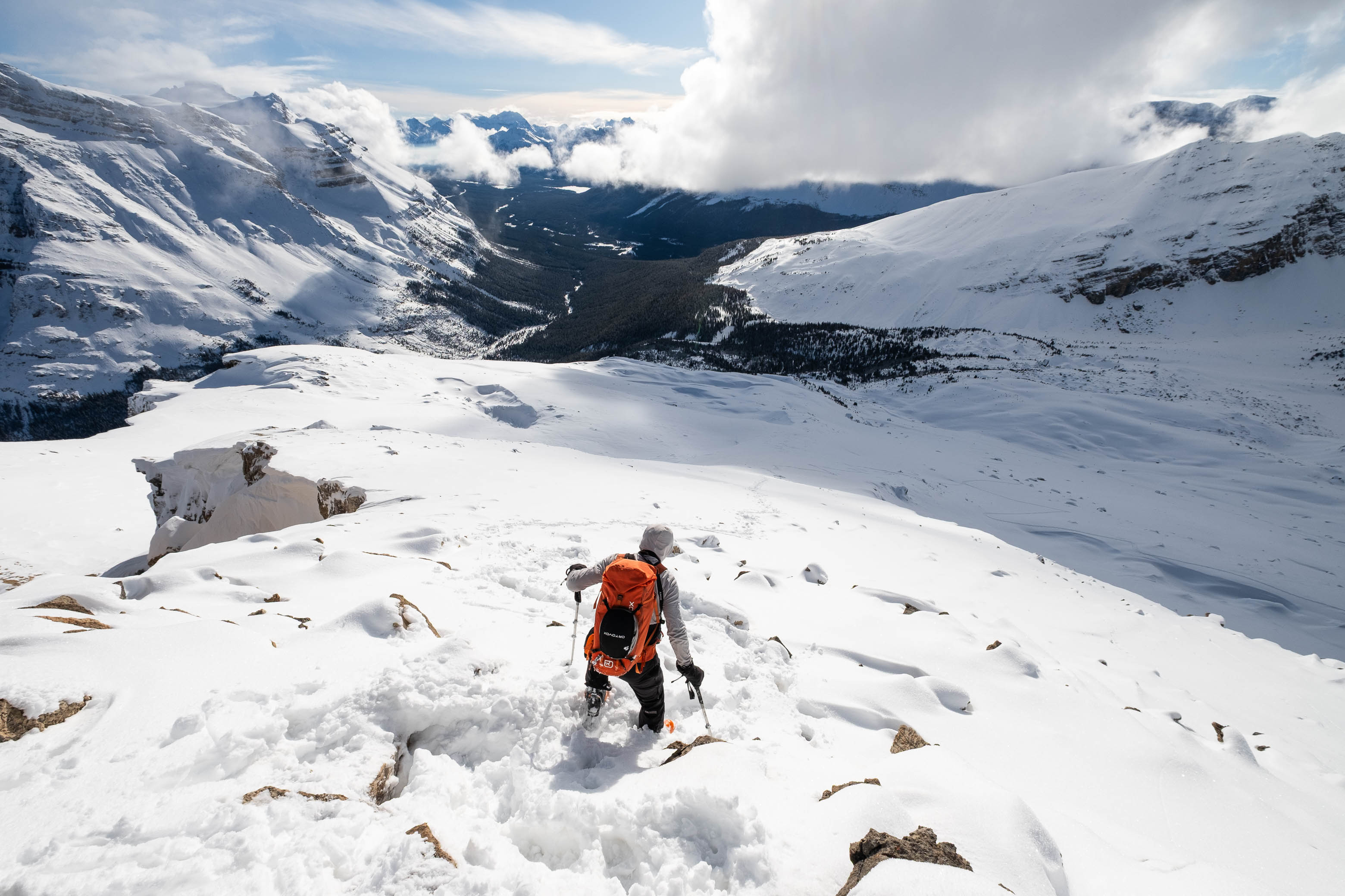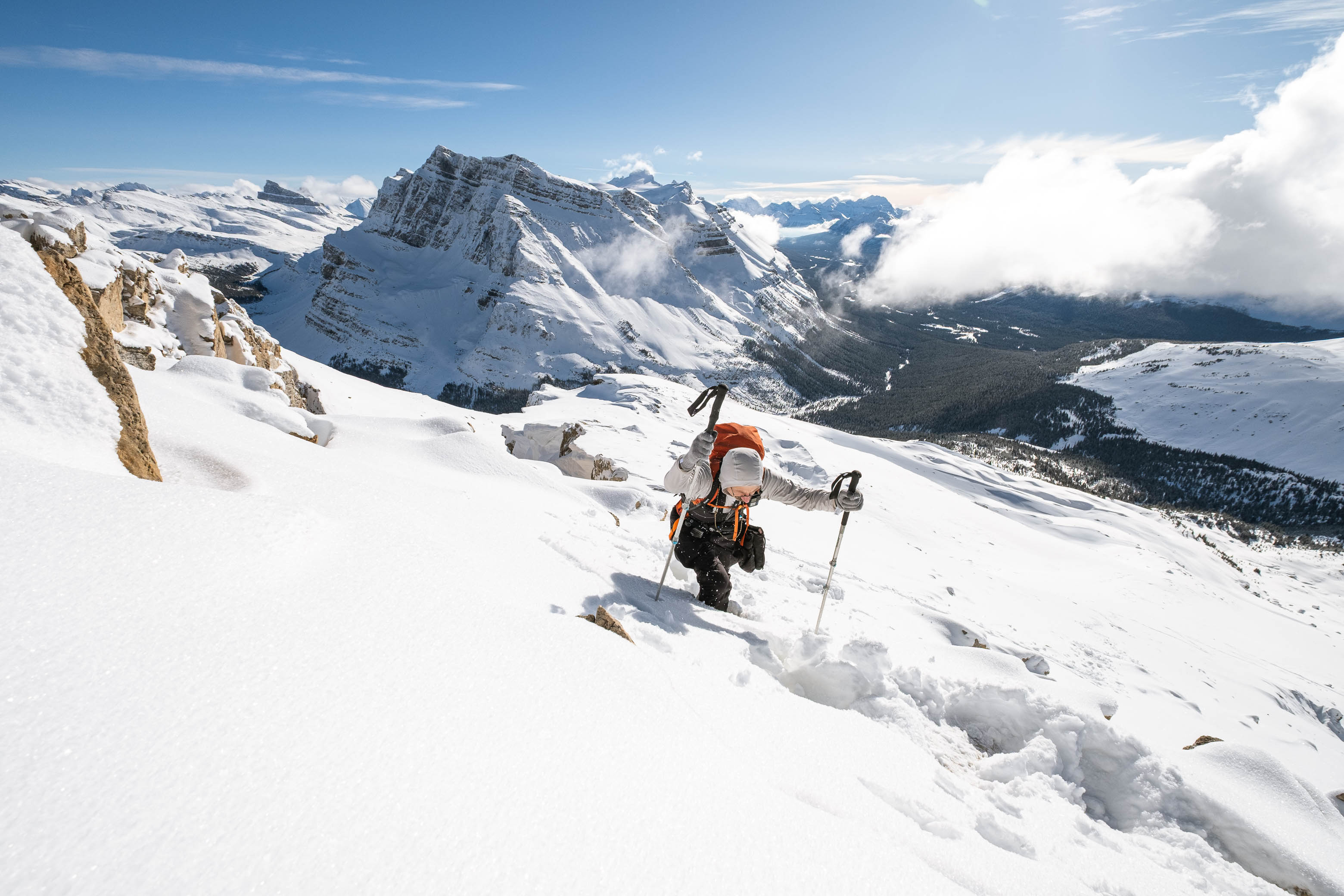 The views opened up spectacularly behind us as we broke into the alpine, with the distant Lake Louise group rising over a partial inversion in the valley, Noseeum's west face towering across Mosquito Creek, and a deep blue sky overhead! This was shaping out to be one of those magical winter days you don't forget!