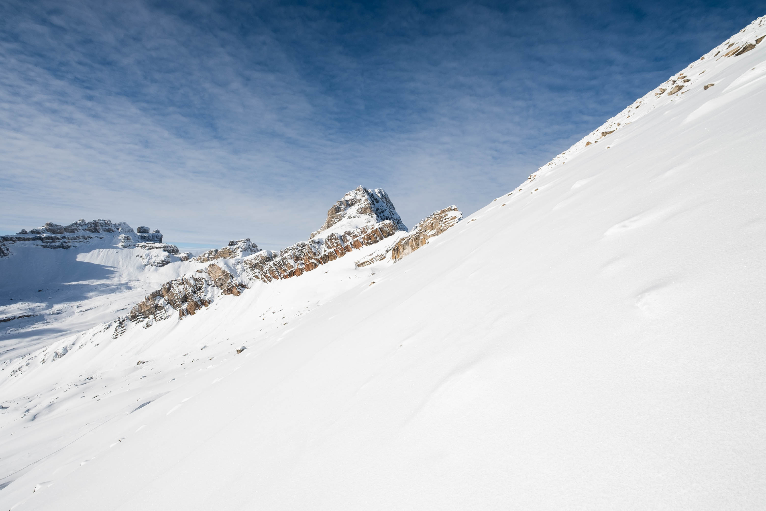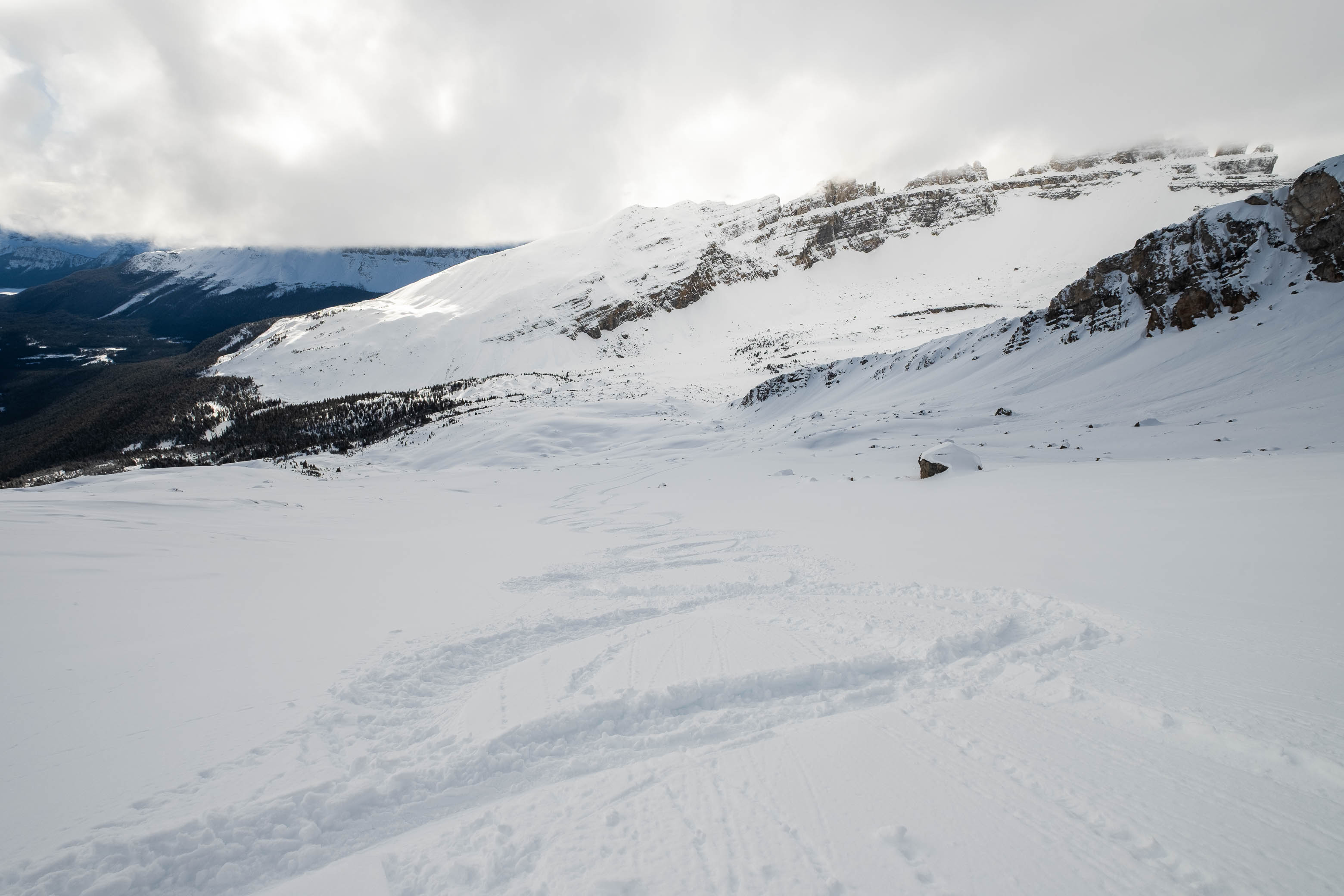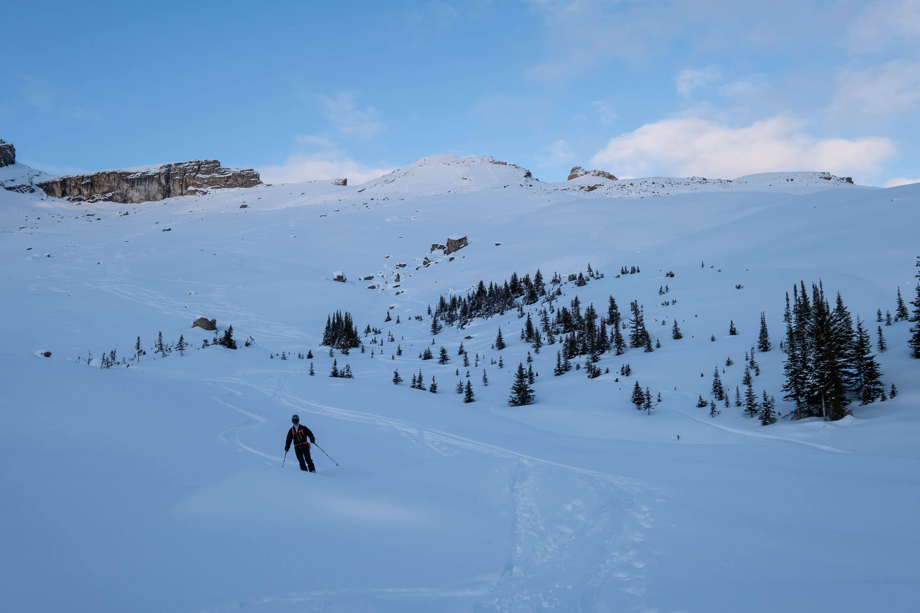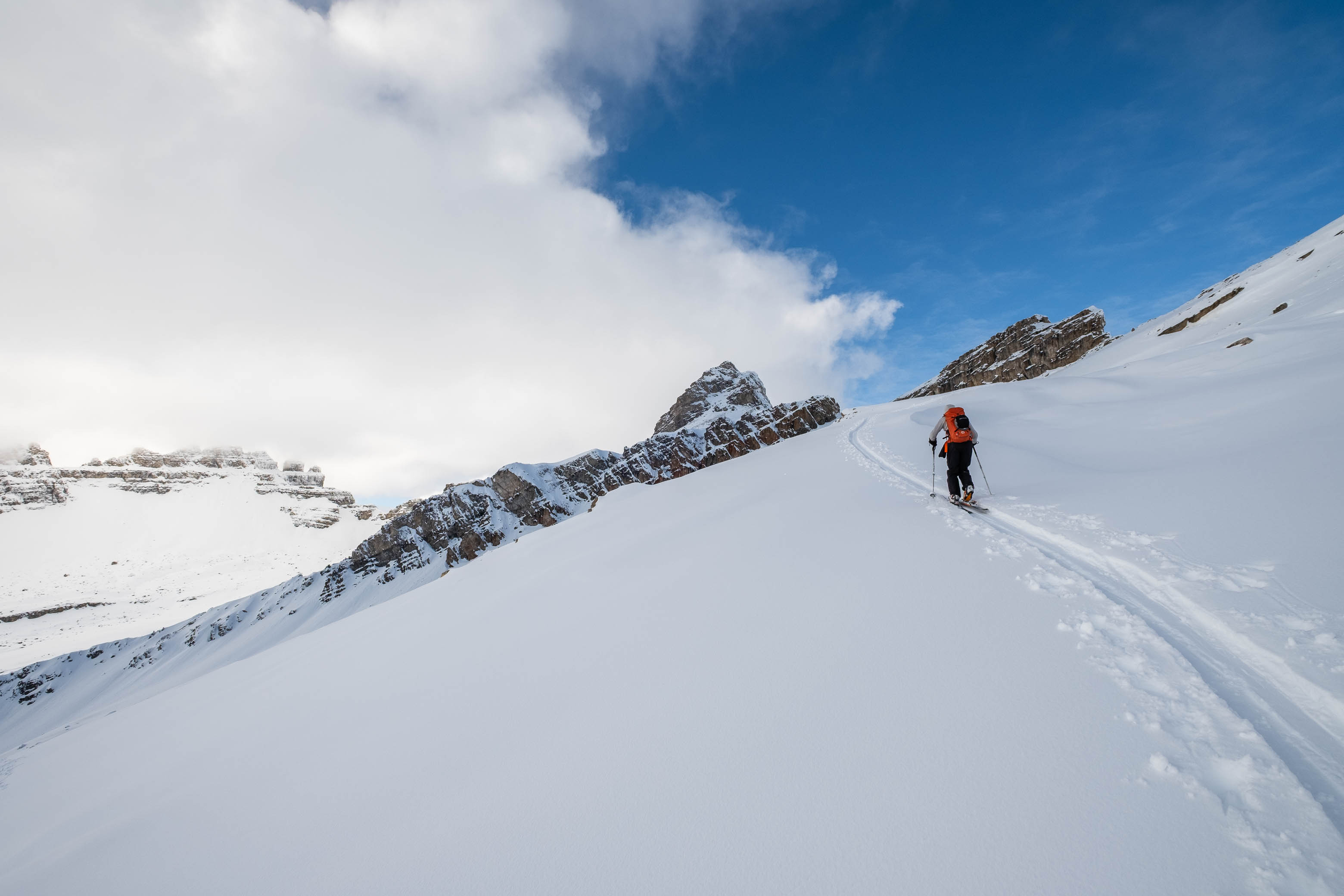 Luckily we had a fresh skin track paving the way for us (probably no more than a day or two old) and made short work of the initial "steep" section, before the slope flattened out and we continued around the base of Dolomite Shoulder's steep SE slopes. Depending on where you round the shoulder you might (like us) find yourself at the edge of a steeply walled drainage, but don't trouble yourself with crossing it! Instead, backtrack along the edge of the drainage towards Dolomite Shoulder, where it becomes much less "aggressive" and easier to cross.