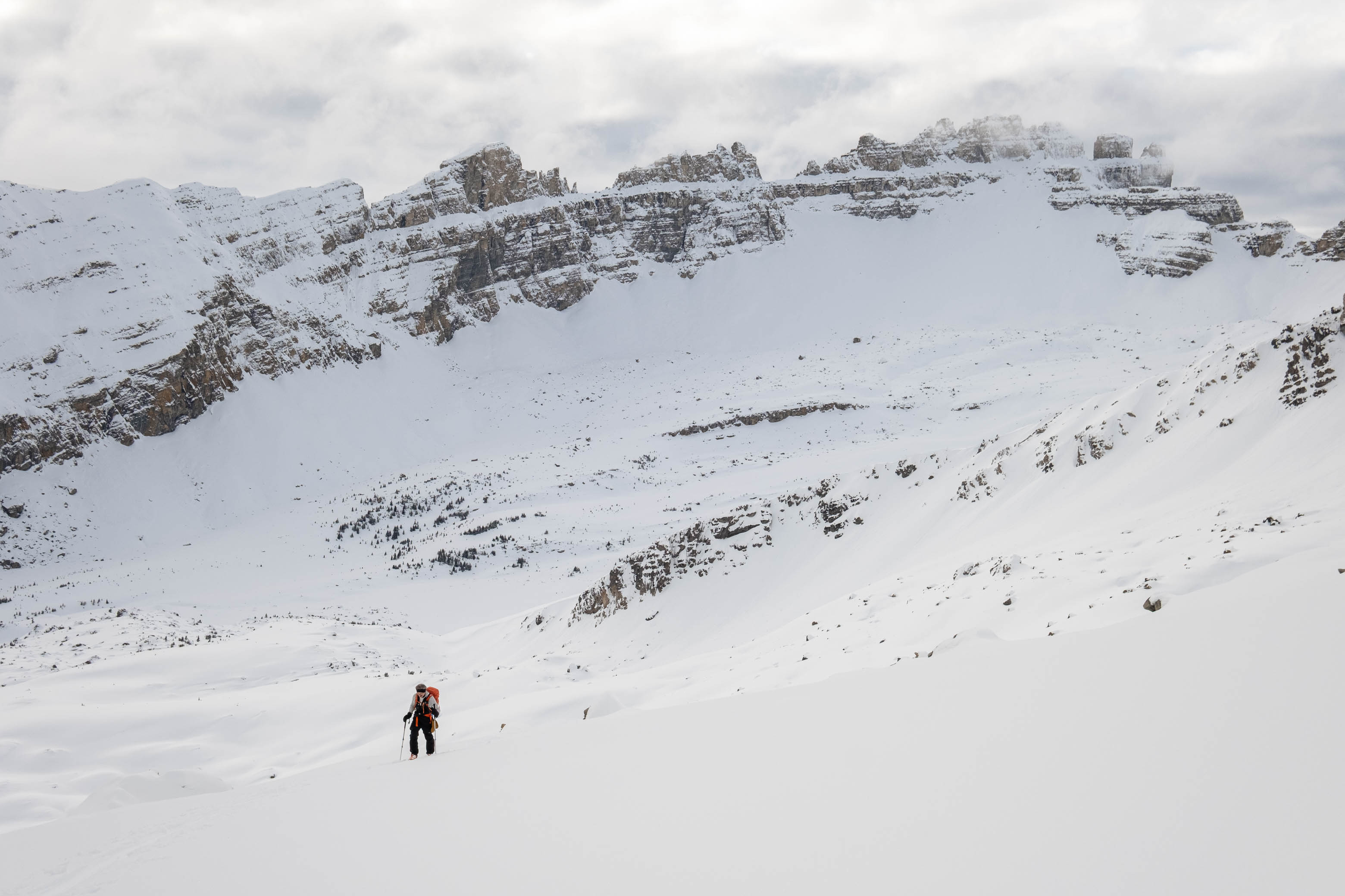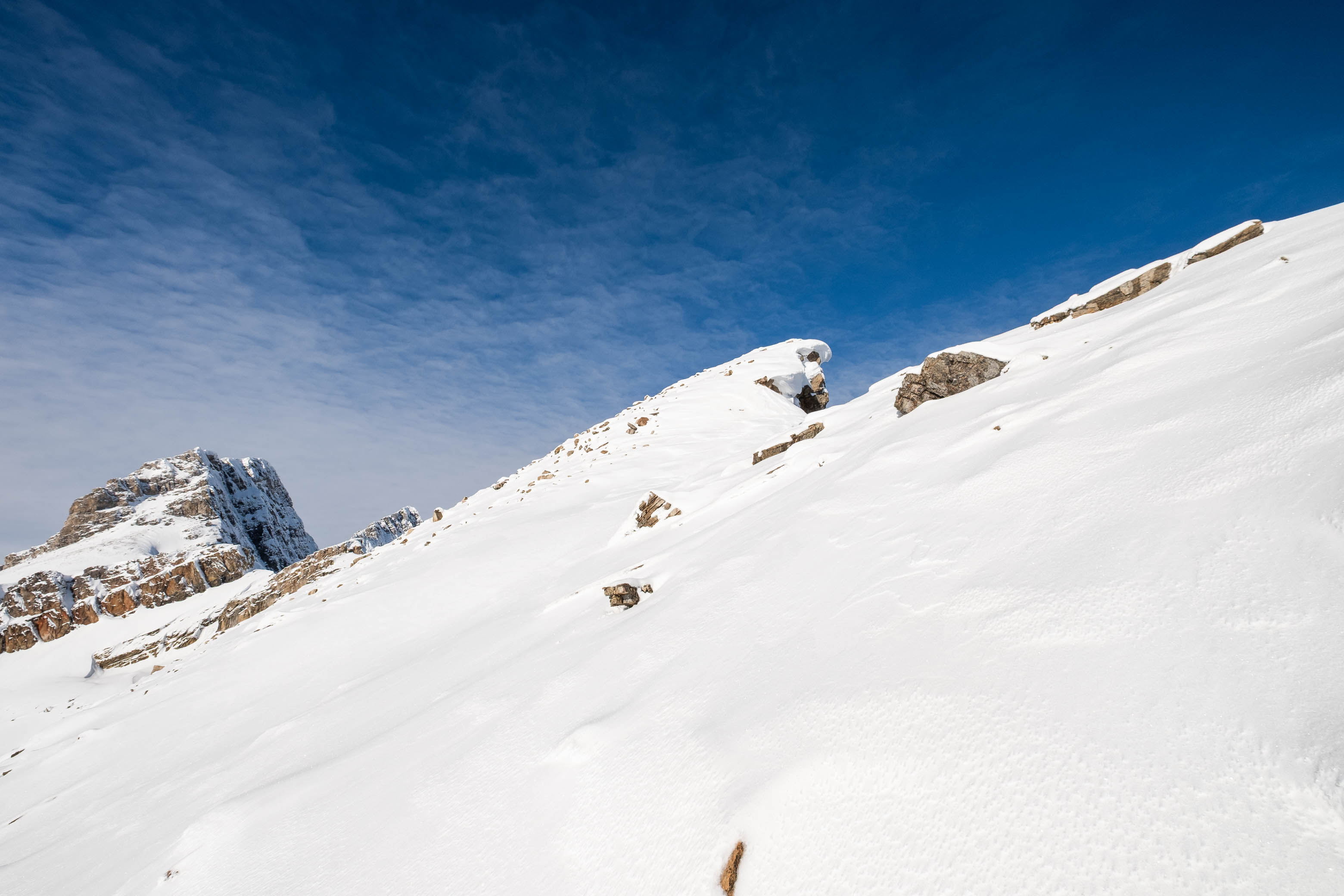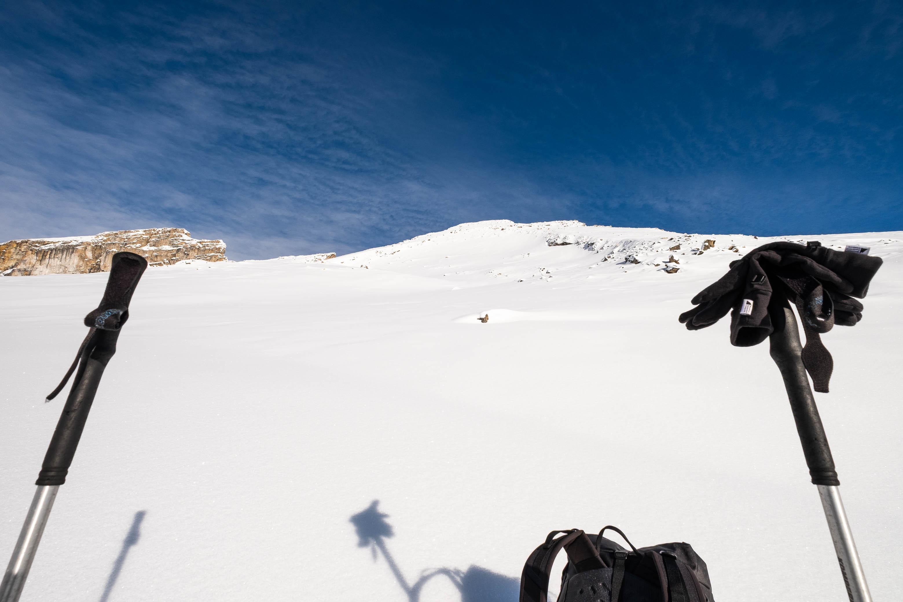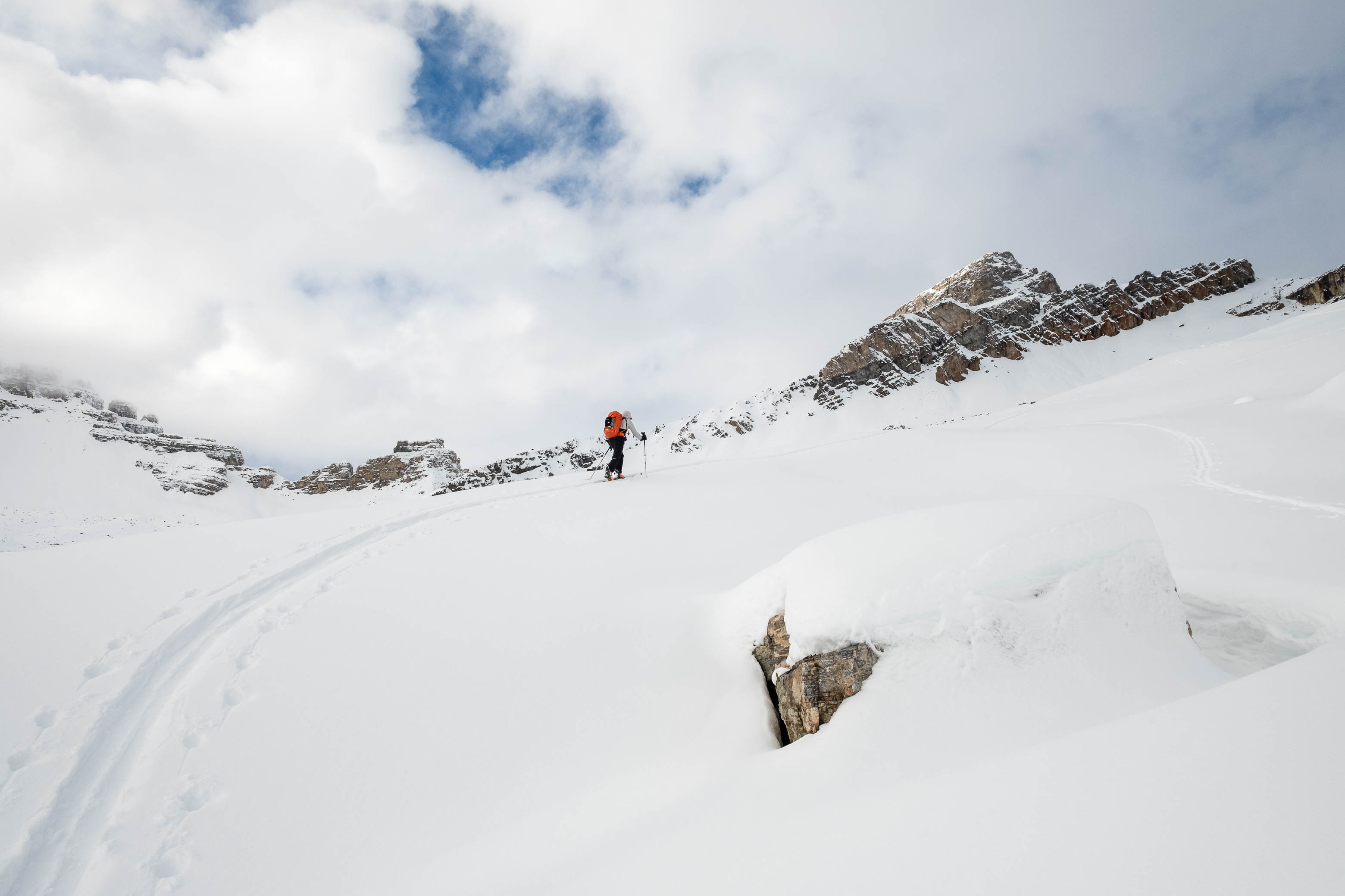 Luckily we had a fresh skin track paving the way for us (probably no more than a day or two old) and made short work of the initial "steep" section, before the slope flattened out and we continued around the base of Dolomite Shoulder's steep SE slopes. Depending on where you round the shoulder you might (like us) find yourself at the edge of a steeply walled drainage, but don't trouble yourself with crossing it! Instead, backtrack along the edge of the drainage towards Dolomite Shoulder, where it becomes much less "aggressive" and easier to cross.