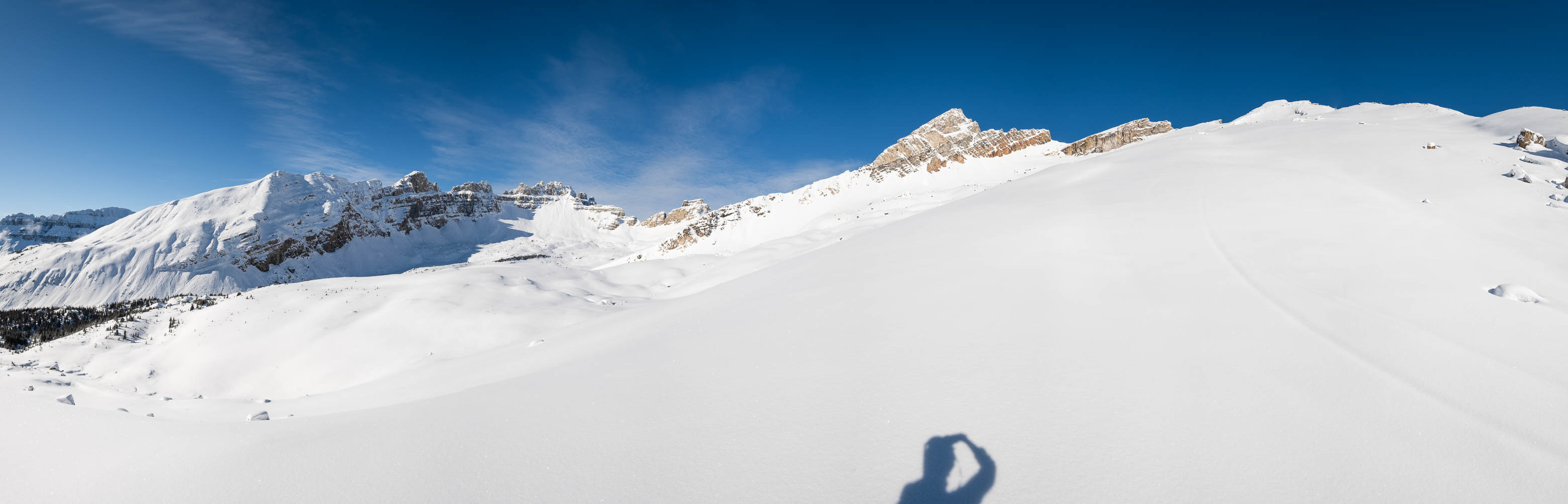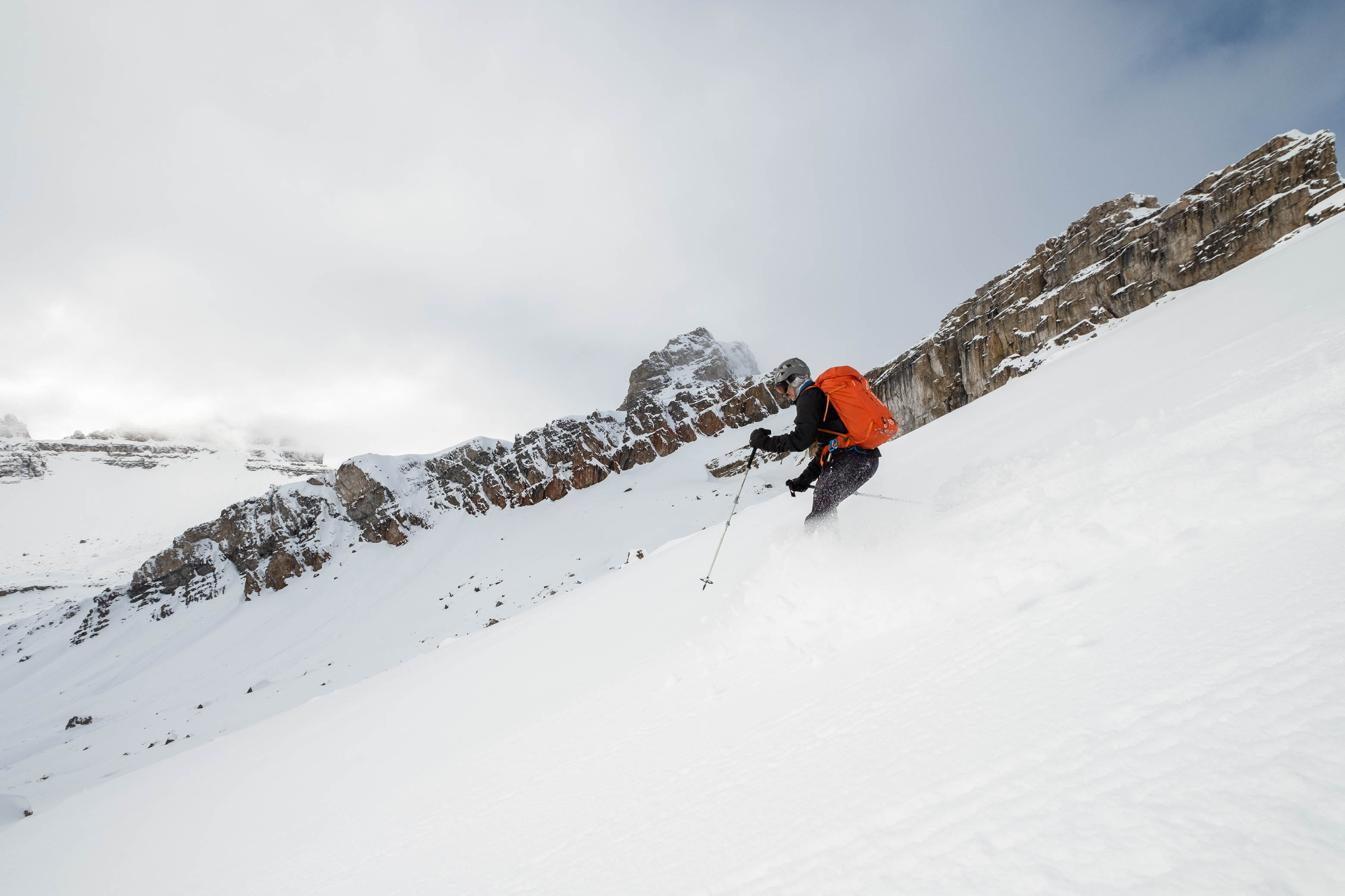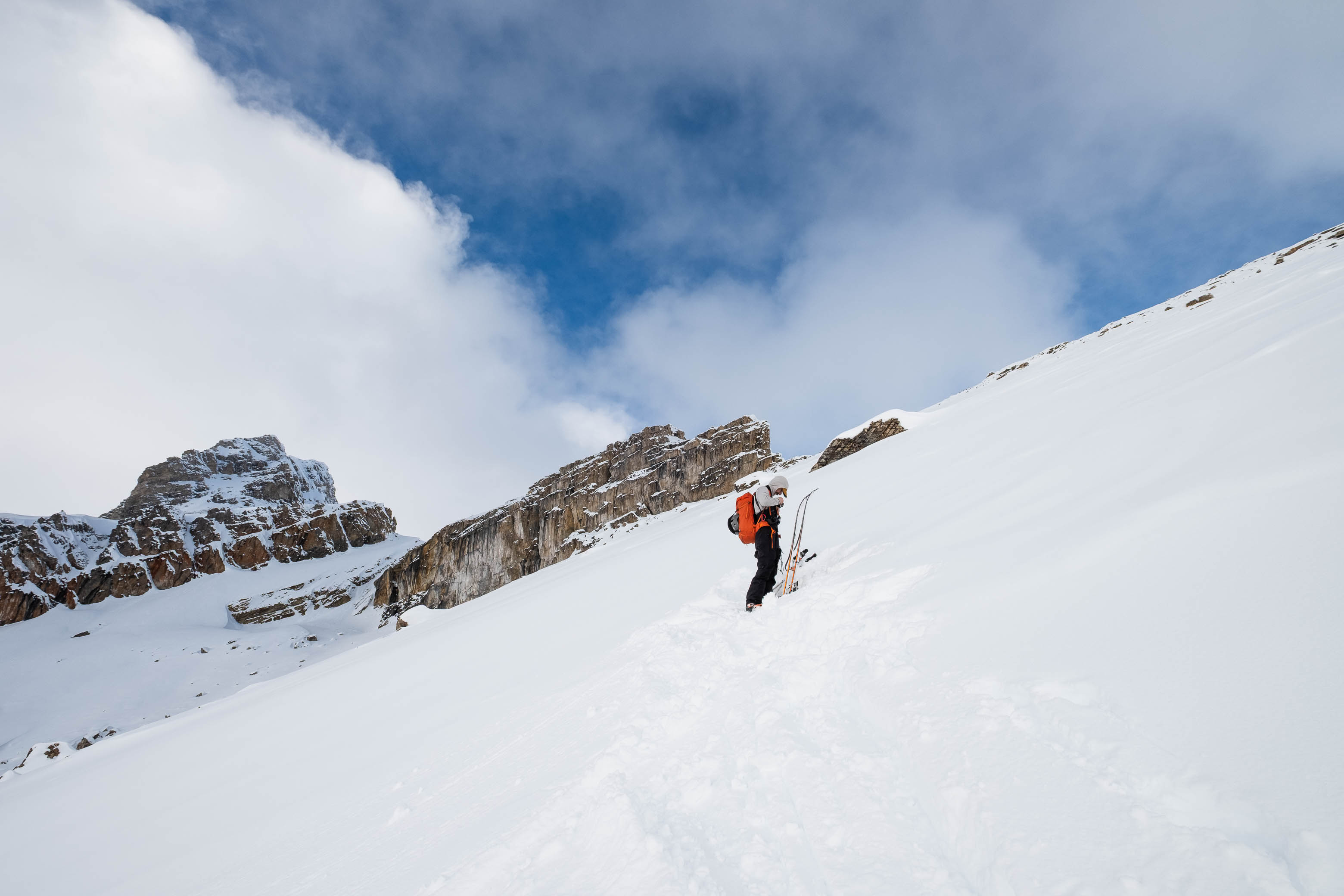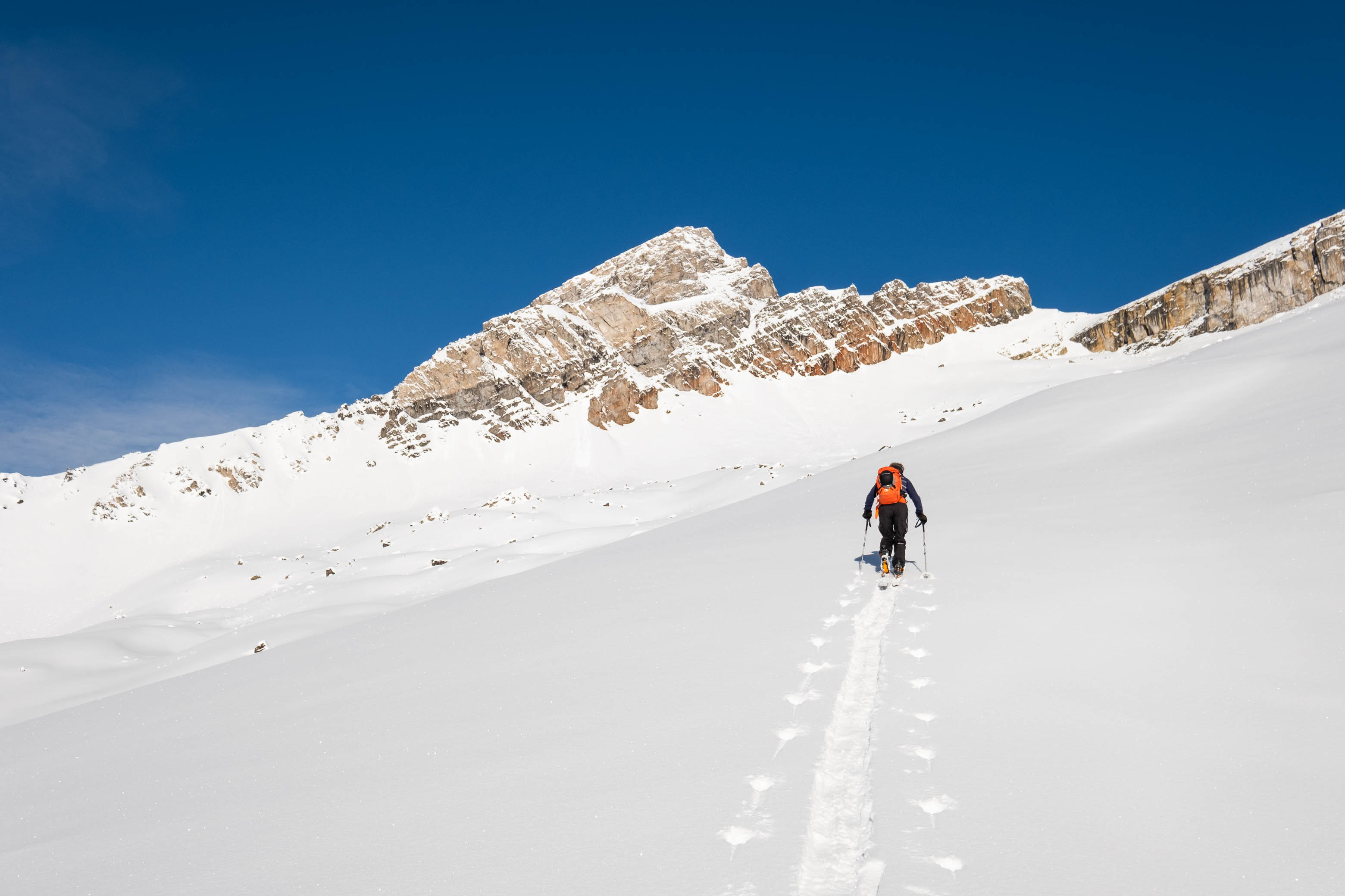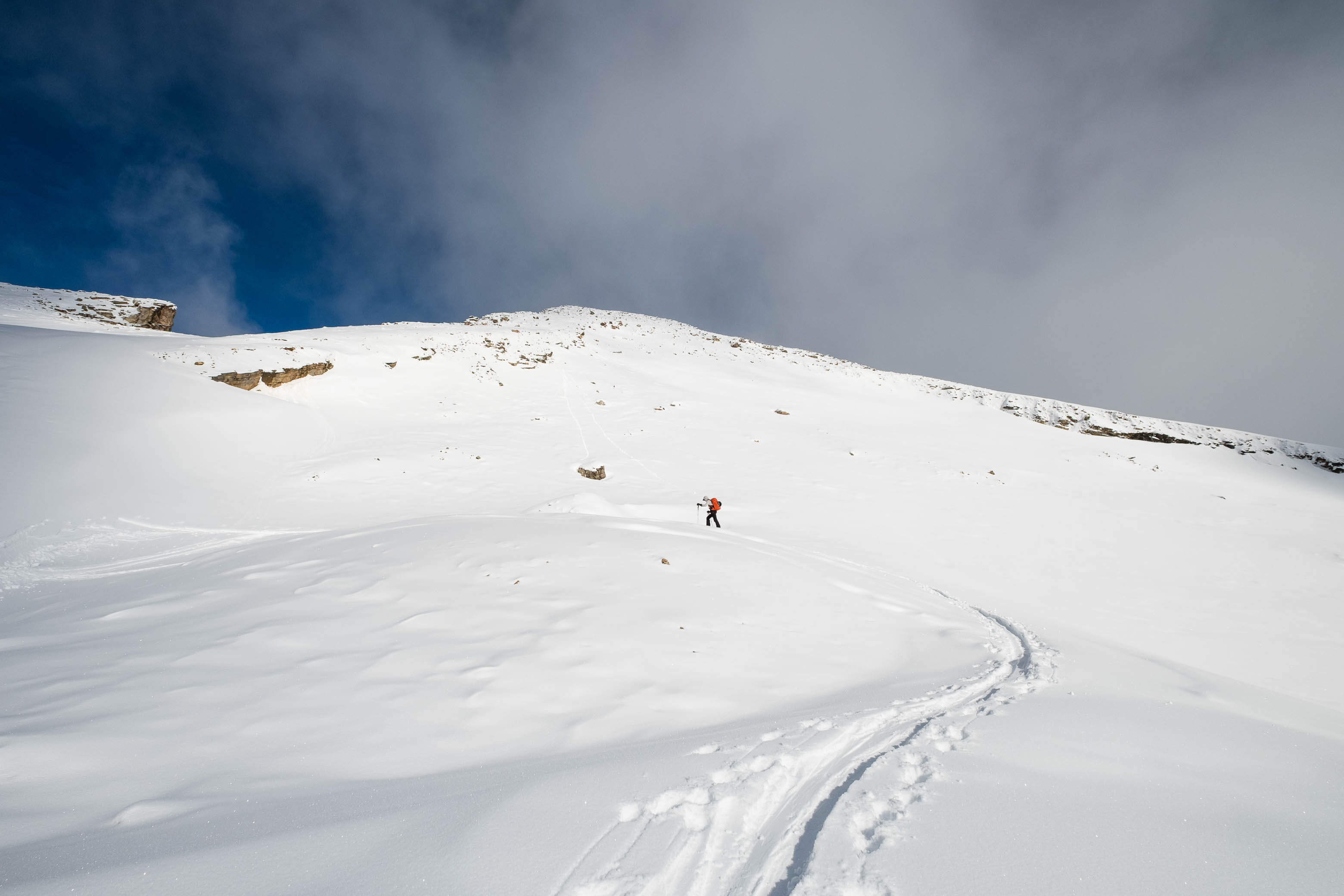 Luckily we had a fresh skin track paving the way for us (probably no more than a day or two old) and made short work of the initial "steep" section, before the slope flattened out and we continued around the base of Dolomite Shoulder's steep SE slopes. Depending on where you round the shoulder you might (like us) find yourself at the edge of a steeply walled drainage, but don't trouble yourself with crossing it! Instead, backtrack along the edge of the drainage towards Dolomite Shoulder, where it becomes much less "aggressive" and easier to cross.