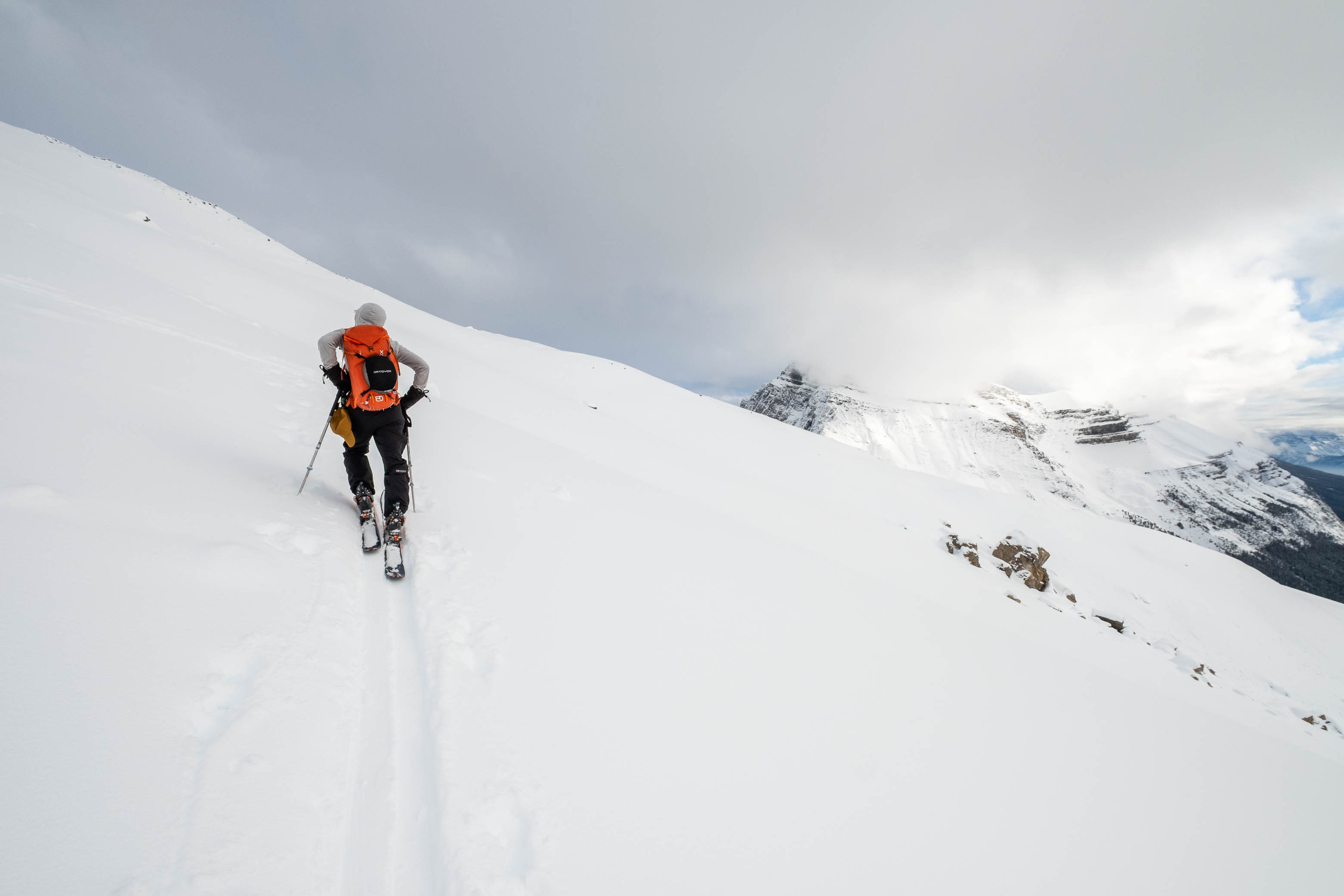 At this point my dad threw out the idea of forgoing the summit and spending the extra time lapping the lower ramp instead - since it was now obvious we wouldn't be getting any turns on the upper mountain - but with the slow start to the winter I was itching to bag a summit (even if it was an unofficial one!), and led the awkward march up the slippery, snow-covered scree slopes in ski boots, determined to tag the summit and get a second lap in! As we made our way up the final climb, we noticed another party reach the top of our skin track, break trail a little bit further up the ramp (not the ridge) and transition for what appeared to be a stellar ride back down. I honestly expected to meet them later in the day, but they must have headed out after the one lap, because we never saw them again. (I later found out that this was once again Marcus Baranow - the author of the Confessions of a Ski Bum guidebooks - who I had also just narrowly missed meeting the previous day at Bow Summit! What are the odds!)