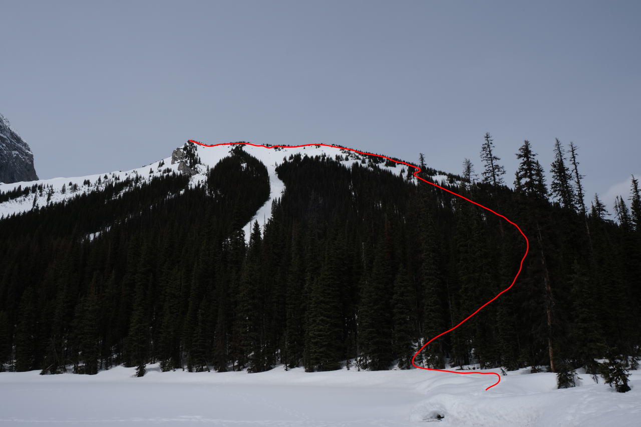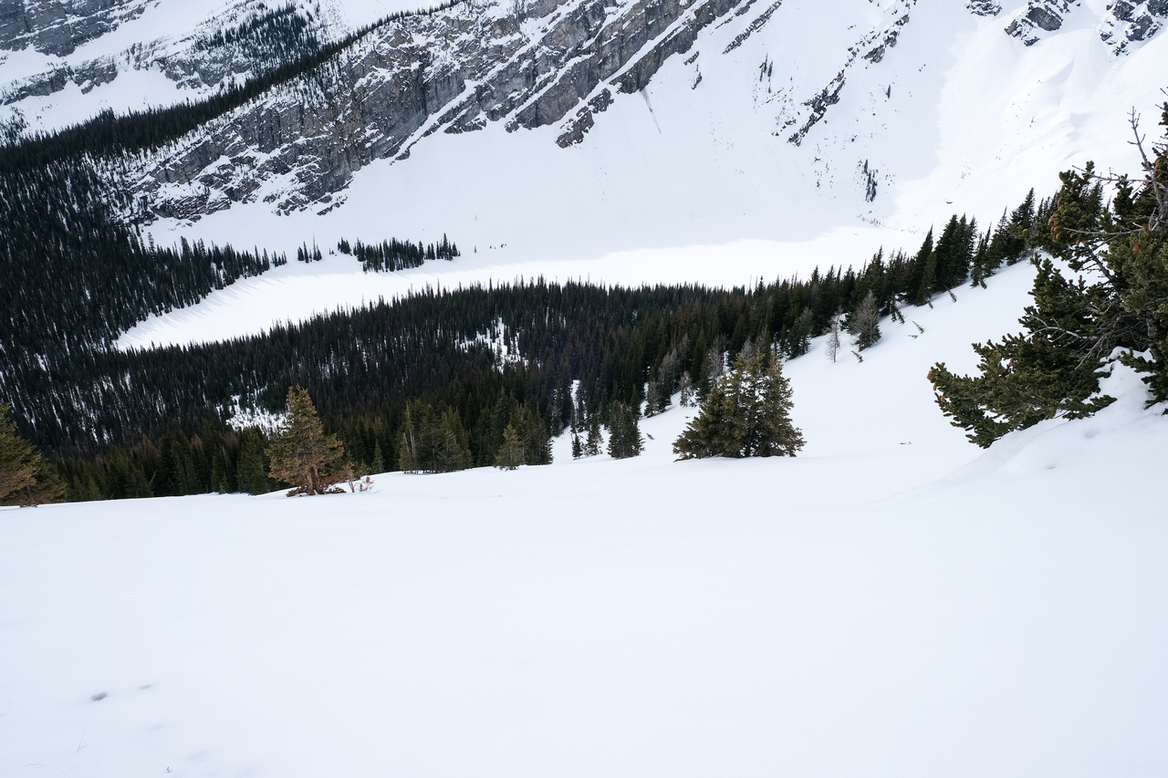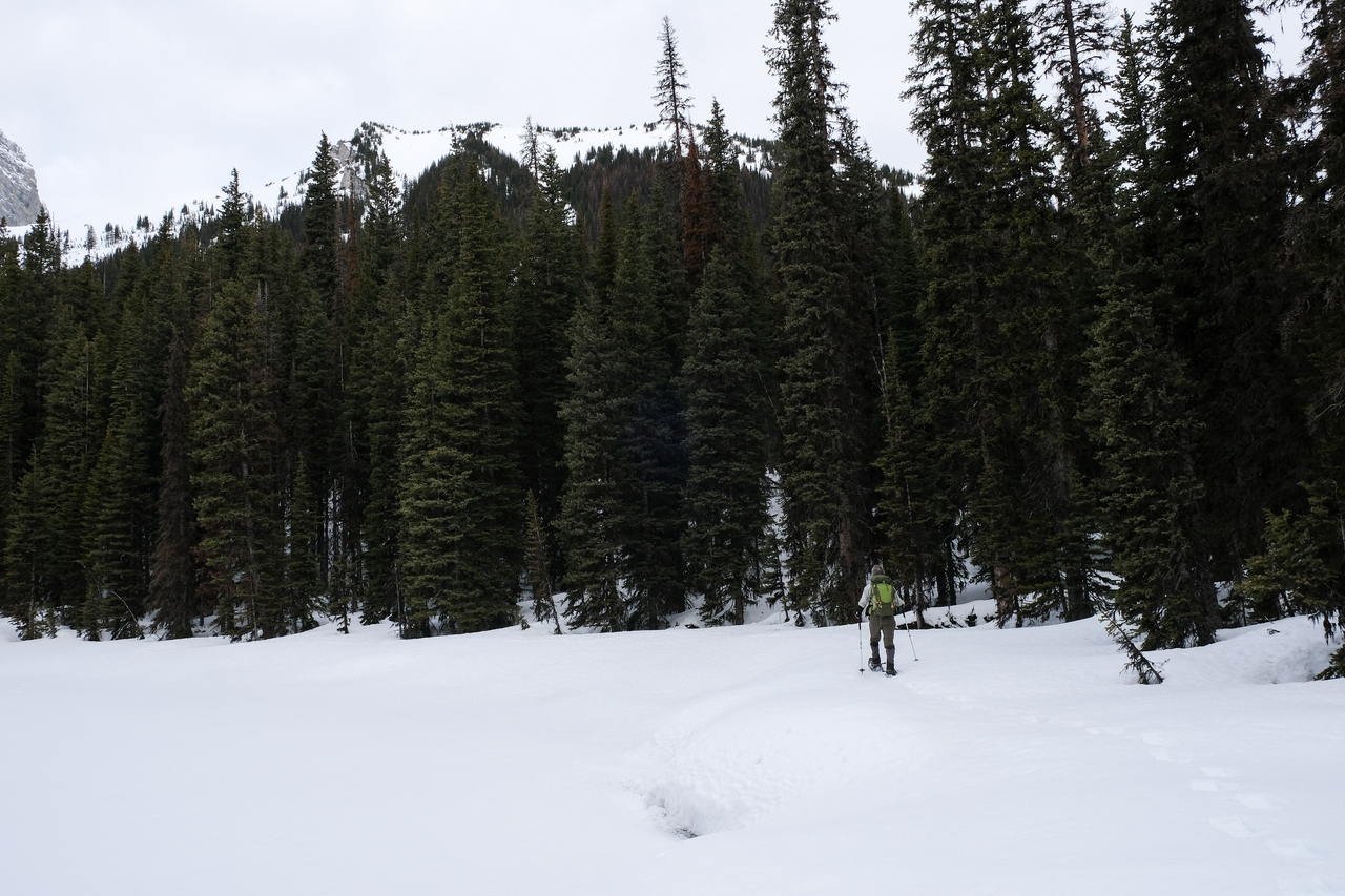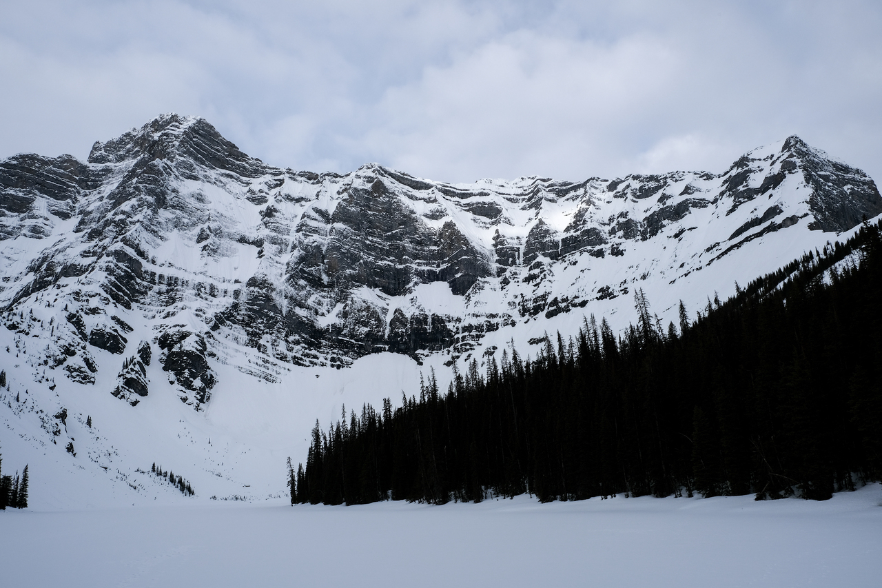 The next 2km were a nice warm-up, and with a brisk pace we soon emerged at Rawson Lake, which is just as beautiful in winter as it is in summer! Mount Sarrail's incredible east face looms above, with our objective sitting modestly on the far-right side of the frame.