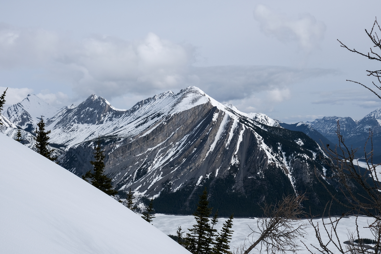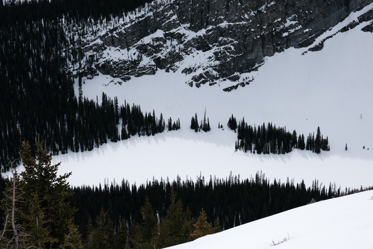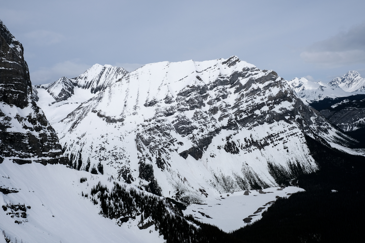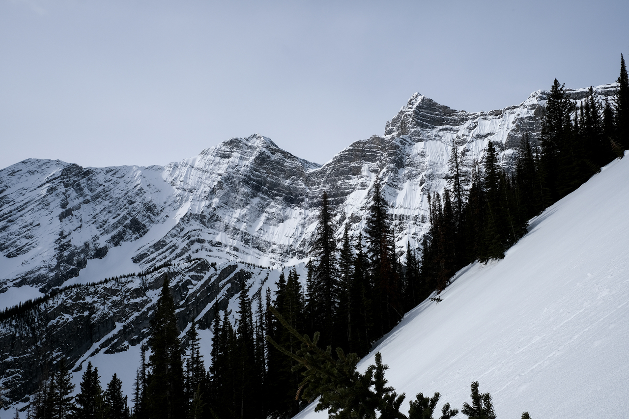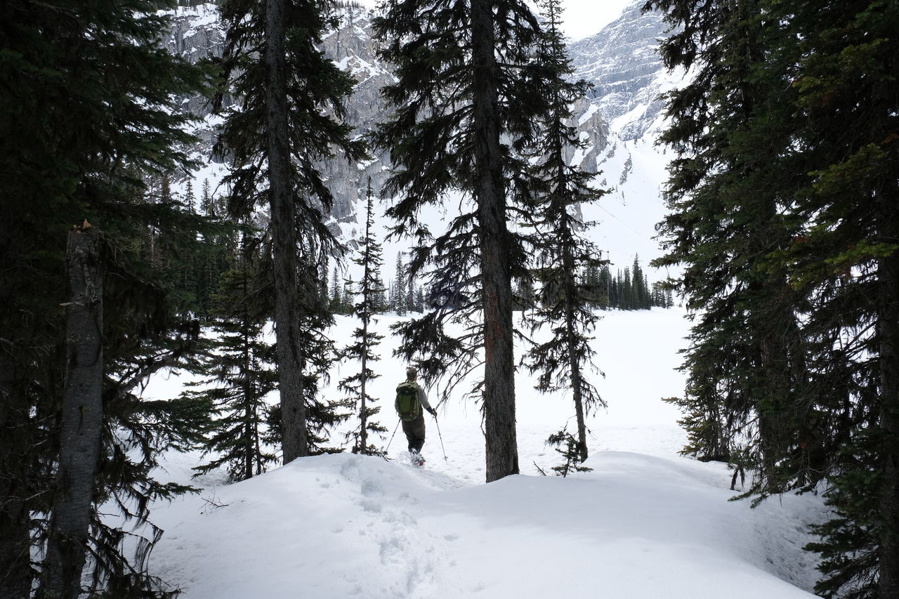 The next 2km were a nice warm-up, and with a brisk pace we soon emerged at Rawson Lake, which is just as beautiful in winter as it is in summer! Mount Sarrail's incredible east face looms above, with our objective sitting modestly on the far-right side of the frame.