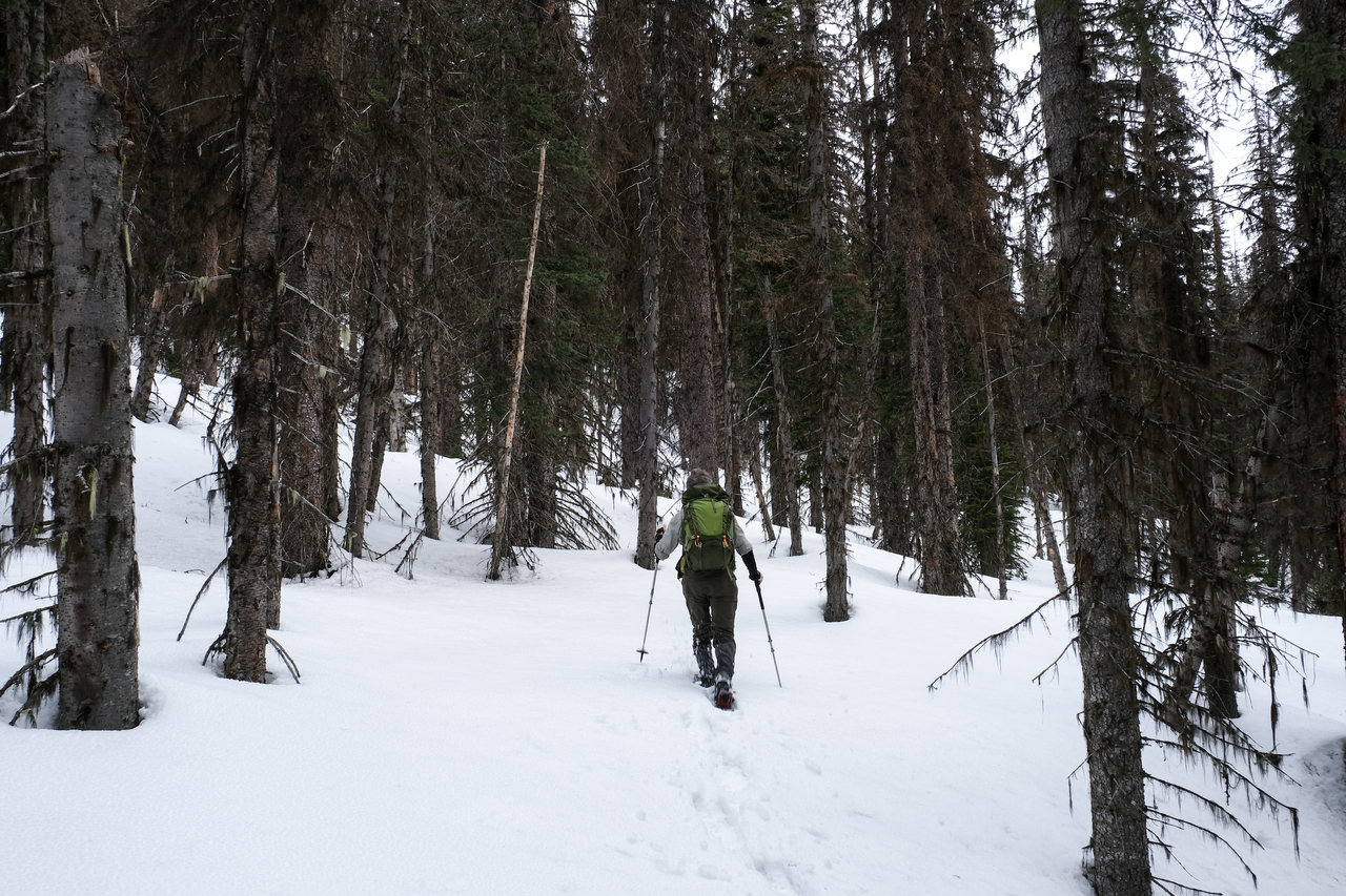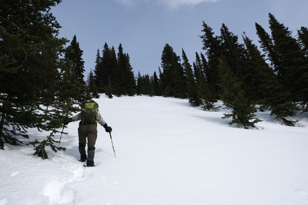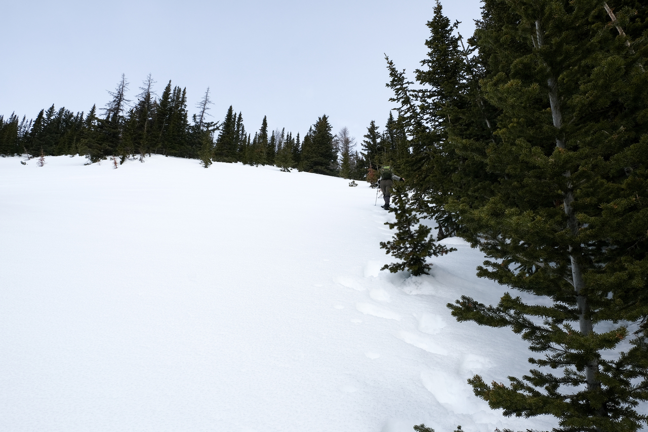 Well...At least it did! As we neared the ridge, we began to encounter large open patches! Due to more and more deadfall appearing in the steep forested terrain, we were forced to ascend on the edge of these open slopes.
