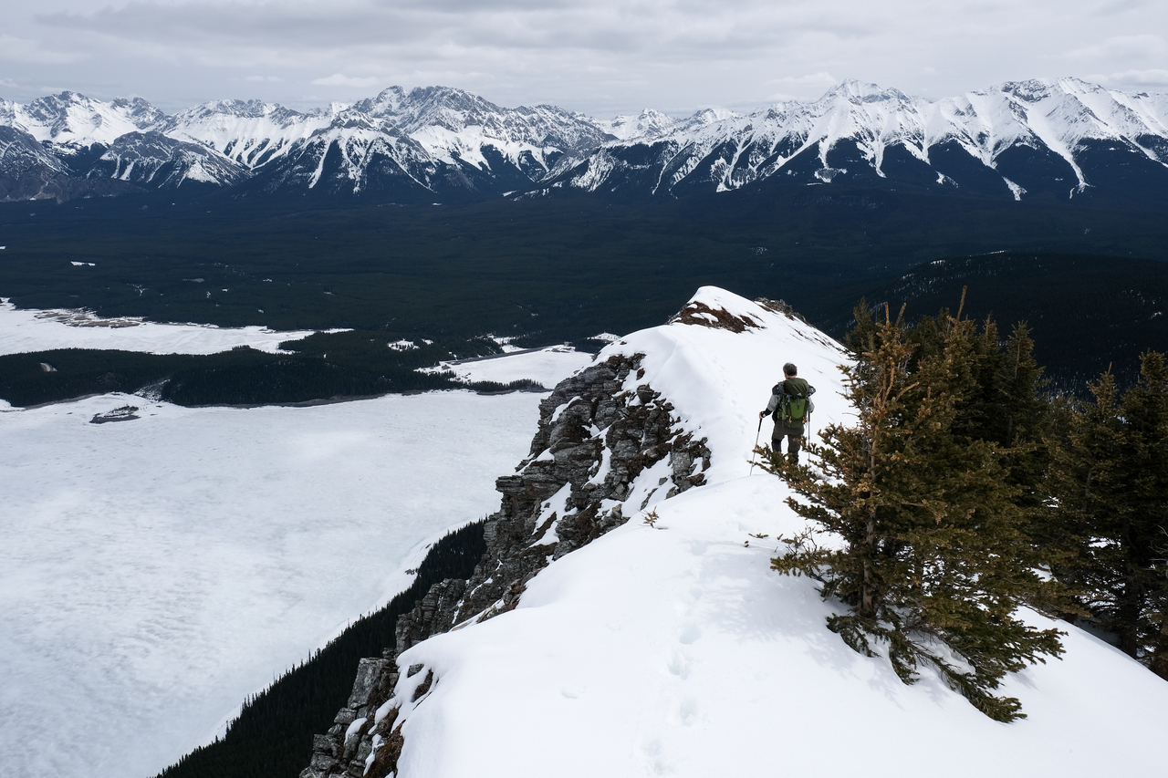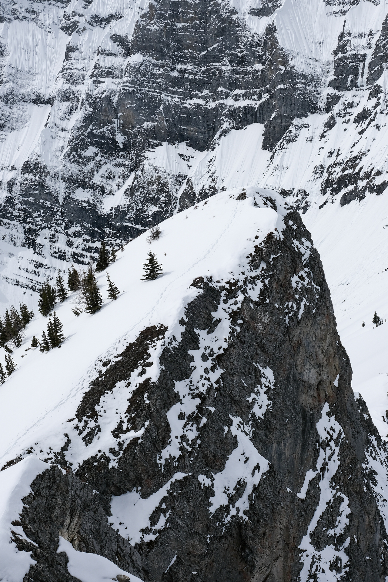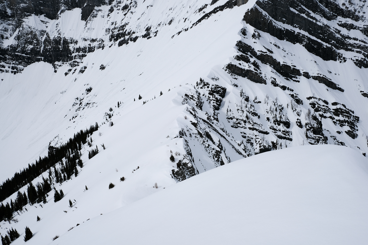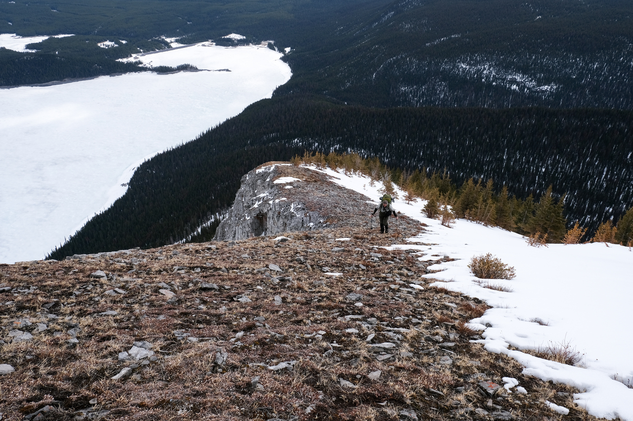 It's a long way down! Once on the ridge, you haven't escaped all hazards quite yet! The ridge does narrow at some points, with a sheer drop down to Upper Kananaskis Lake on your right, and a super steep snow gully (just waiting to slide!) on your left! Although it would be a walk in the park in summer, cornices can make for quite a dangerous situation!
